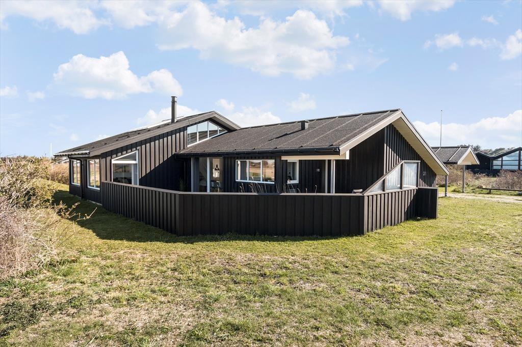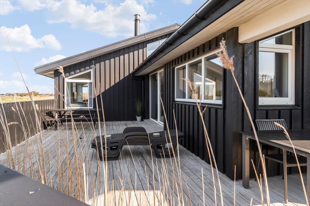 Rundt om sommerhuset er der anlagt store terrasser med gode havemøbler. Man kan finde grillen frem og nyde et lækker tilberedt måltid udendørs, eller man kan ligge og nyde solen på en af husets gode liggestole. Fra sommerhuset og terrasserne er der en flot udsigt til de fantastiske indlandsklitter med spændende fauna og et rigt dyreliv, og børnene kan lege flere timer i sandkassen og gyngerne på grunden.