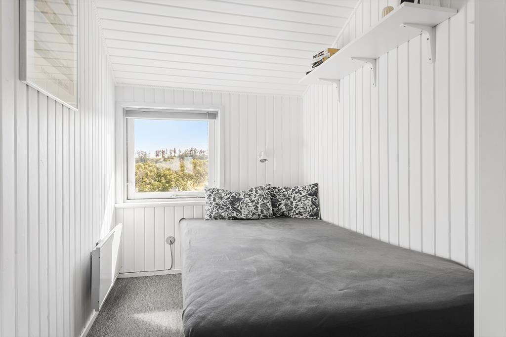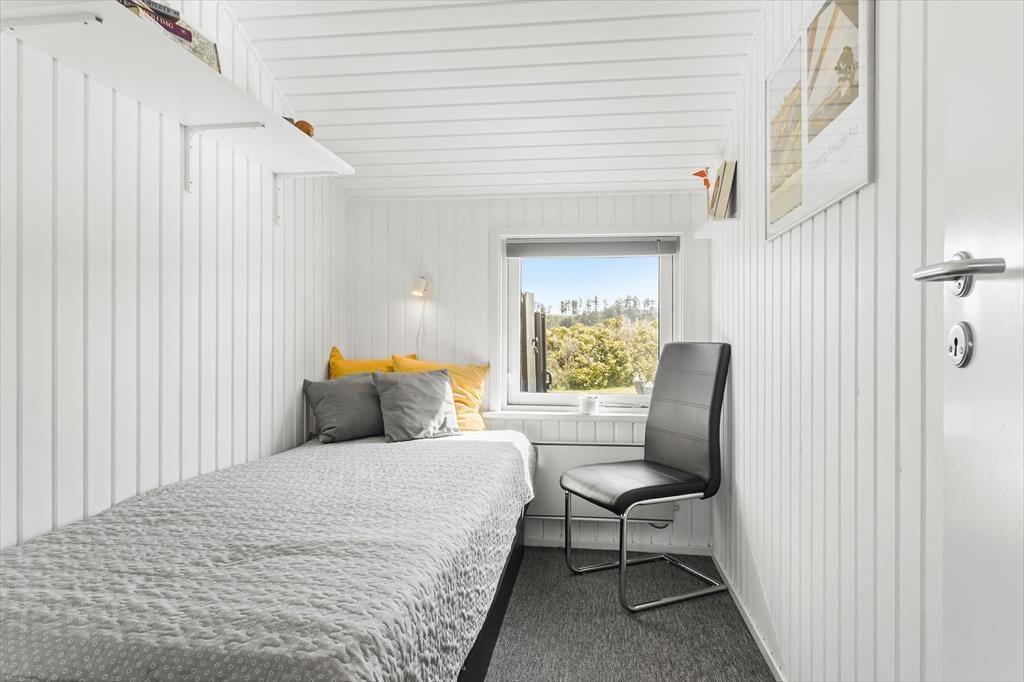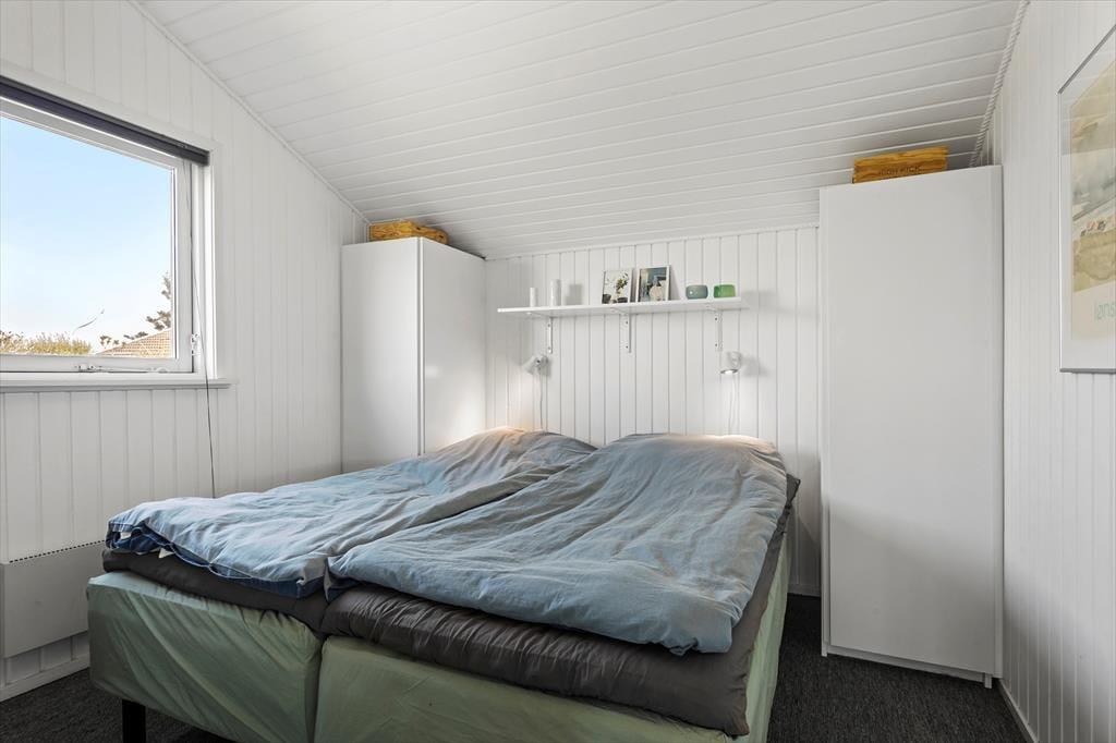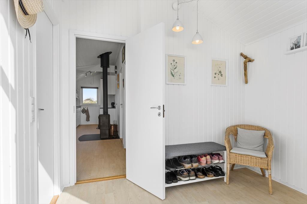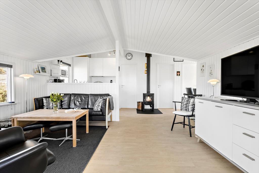 Indenfor er huset lyst og smagfuldt indrettet med hyggelige kroge og komfortable møbler, der indbyder til ro og samvær. Køkkenet er forbundet med spiseområdet og stuen, hvilket skaber en åben og indbydende atmosfære, hvor man nemt kan være sammen og nyde hinandens selskab. En centralt placeret brændeovn spreder varme og hygge i hele huset, når aftenerne bliver kølige. De tre soveværelser, to med dobbeltsenge og et med en enkeltseng, giver god plads til afslapning og ro. Stuen er ideelt indrettet til både rolige læsestunder og fælles aktiviteter.