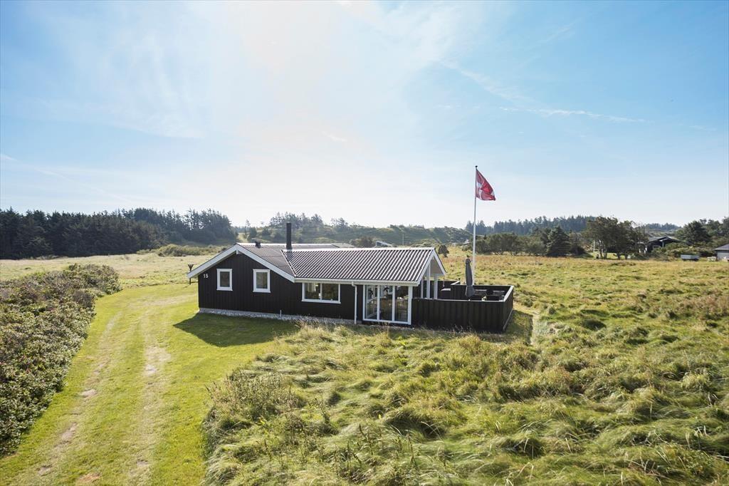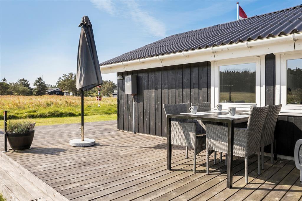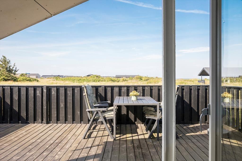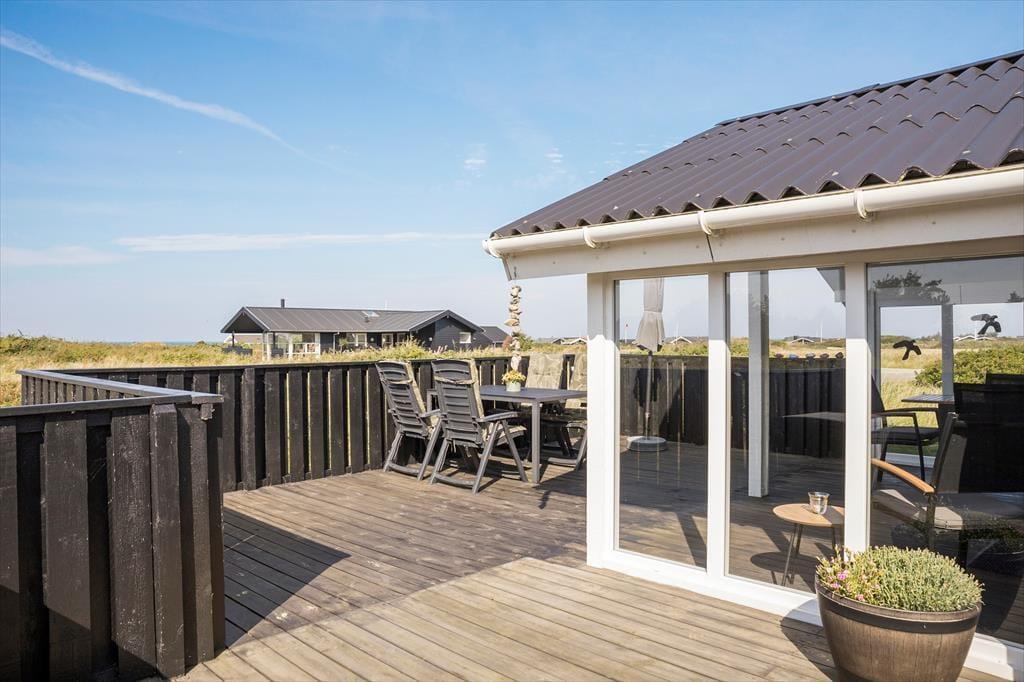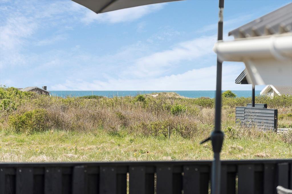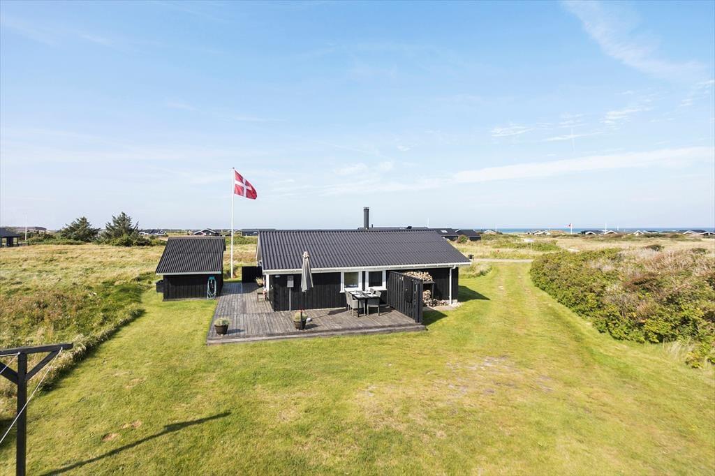 Udendørs finder I en stor klitgrund, perfekt til boldspil, leg og ren afslapning. Terrasserne, som er delvist indhegnede, er rummelige og ideelle til at nyde solen og hygge sig. Den overdækkede terrasse giver mulighed for at være udendørs, selv hvis vejret ikke skulle vise sig fra sin bedste side. Herfra kan I også nyde en smuk udsigt over havet.