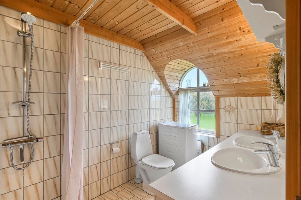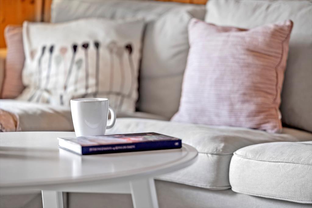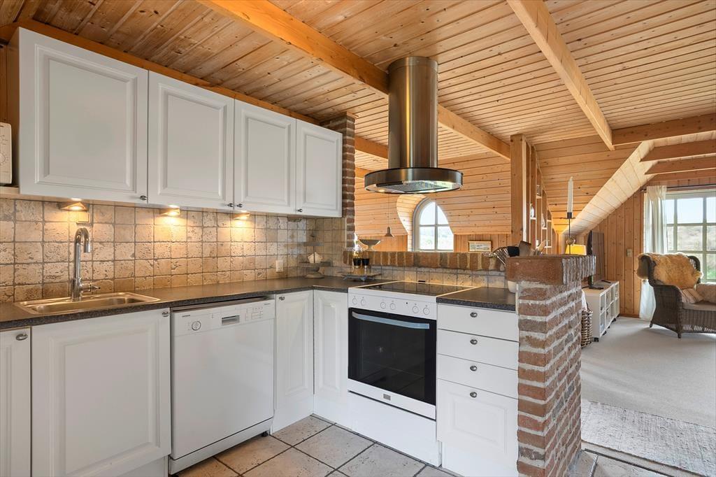 Huset er indrettet med fokus på hygge og behagelighed, og så er der et væld af finurligheder i arkitekturen Der er f.eks. et skønt lysindfald gennem de buede vinduer i spisestue, bad og køkken. Veludstyret, lyst køkken med opvaskemaskine. Det rustikke look er gennemført med rå mursten og valg af træ og klinker, så et spændende hus med mange sjove vinkler og kreativ indretning. Stuen er udstyret med brændeovn lige op ad den store, behagelige sofa, hvor man sagtens kan forestille sig at flade ud efter en god travetur.