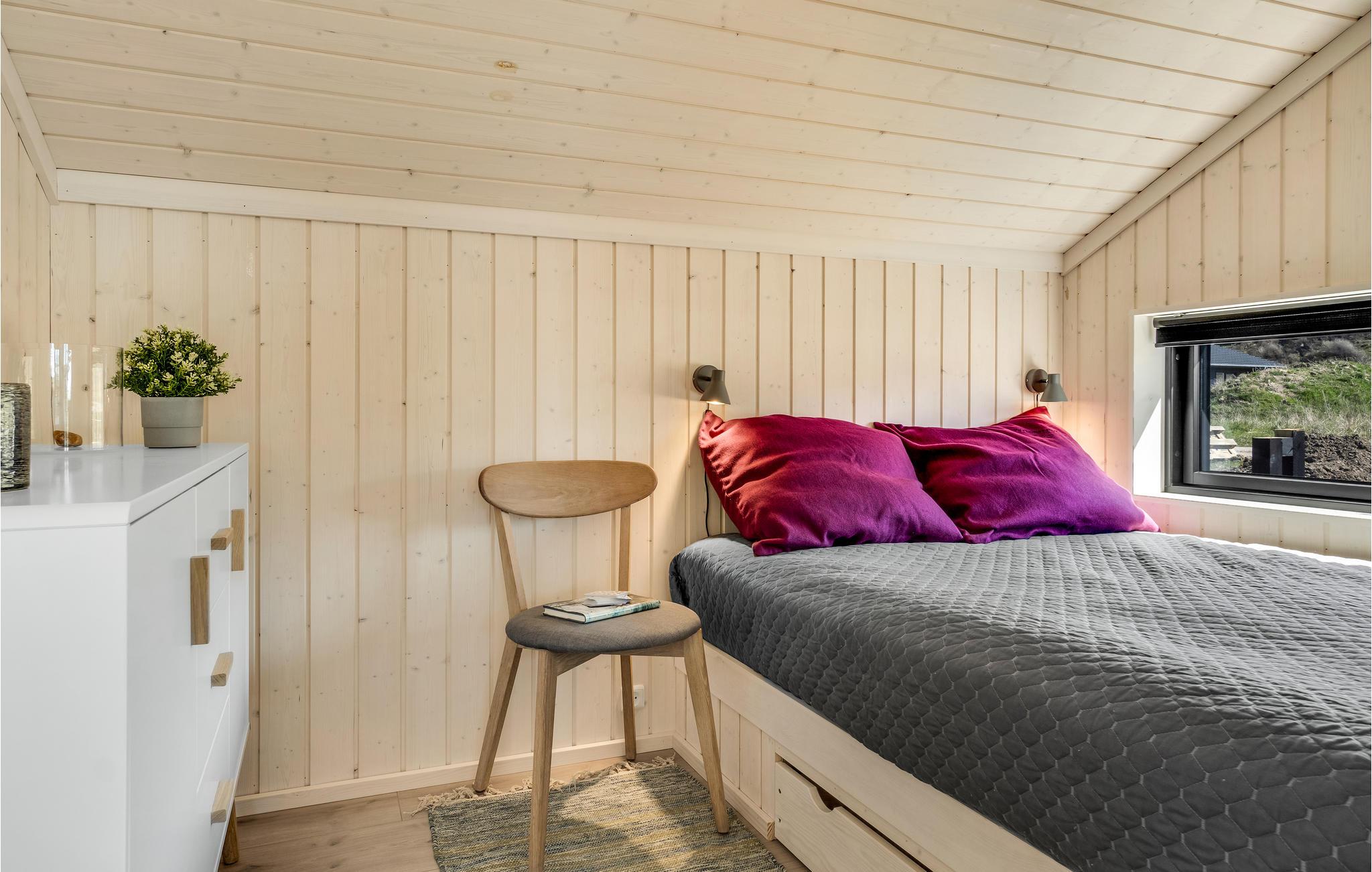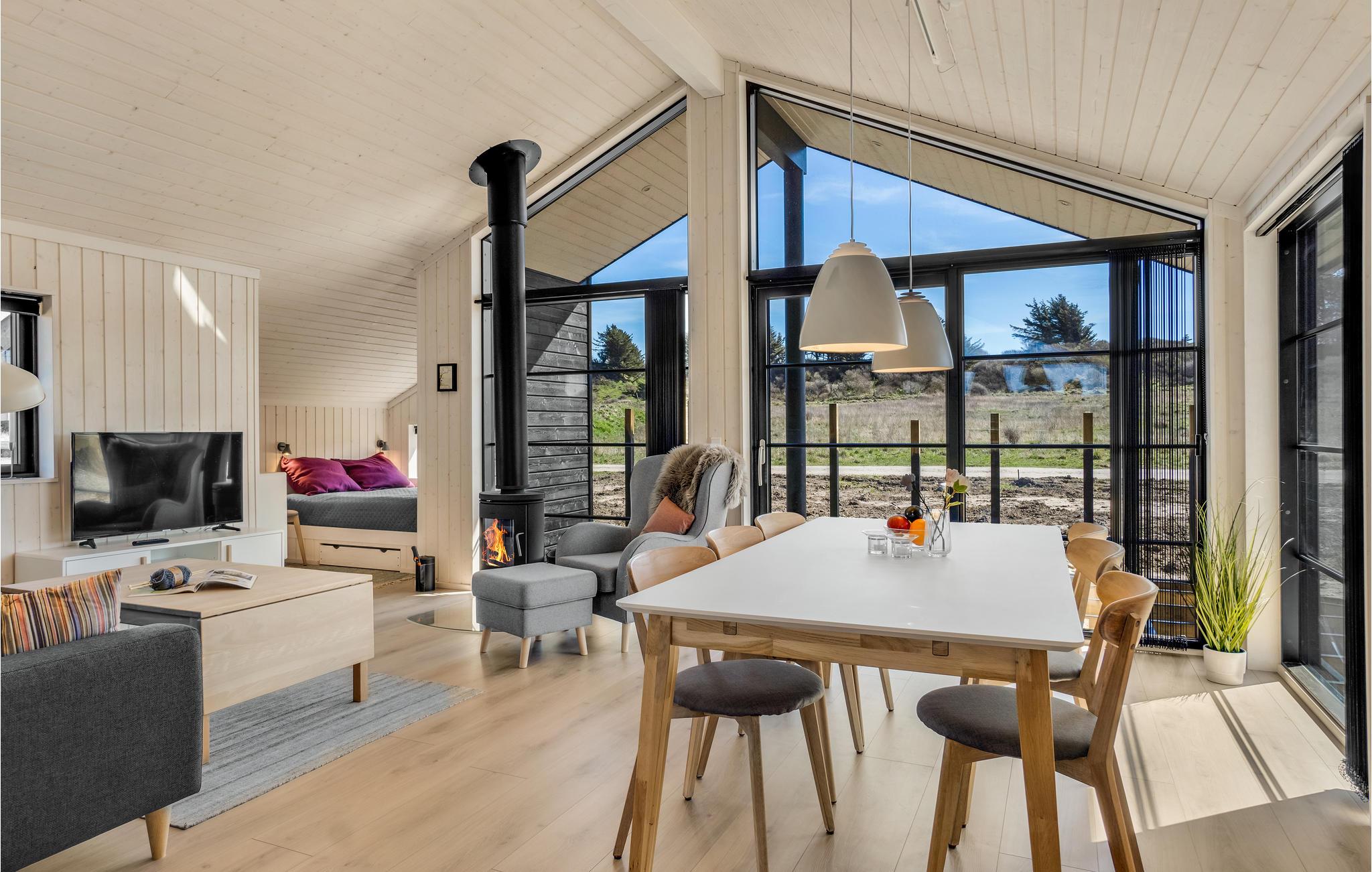 Det attraktive hus ligger i flotte naturomgivelser tæt ved det vidunderlige Vesterhav. Her kan I nyde tiden sammen i lyse værelser med en moderne og elegant indretning og en varm atmosfære. I kan se frem til behagelige nætter i soveværelserne og den hyggelige alkove, som ligger i åben forbindelse med stuen. Giv jer i kast med madlavningen i det veludstyrede, moderne køkken og glæd jer til hyggelige aftener i sofahjørnet, hvor I kan nyde den smukke udsigt over naturomgivelserne gennem store gulv til loft-vinduer. Om aftenen er der dømt familiehygge til flammernes stille knitren i brændeovnen.