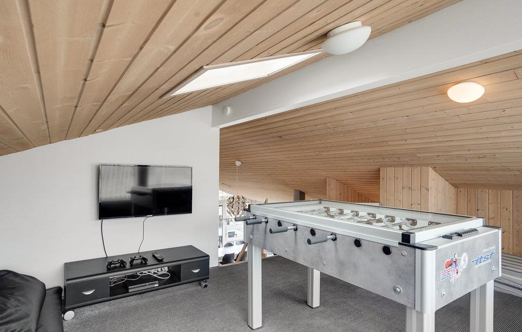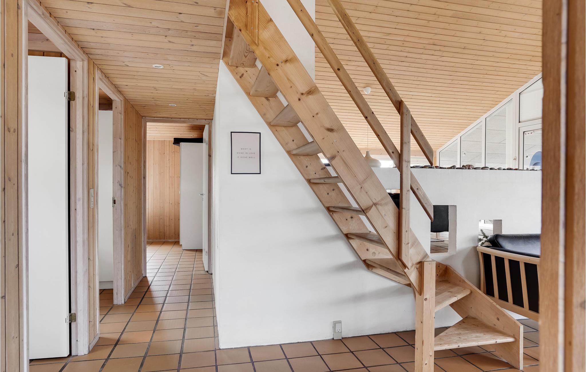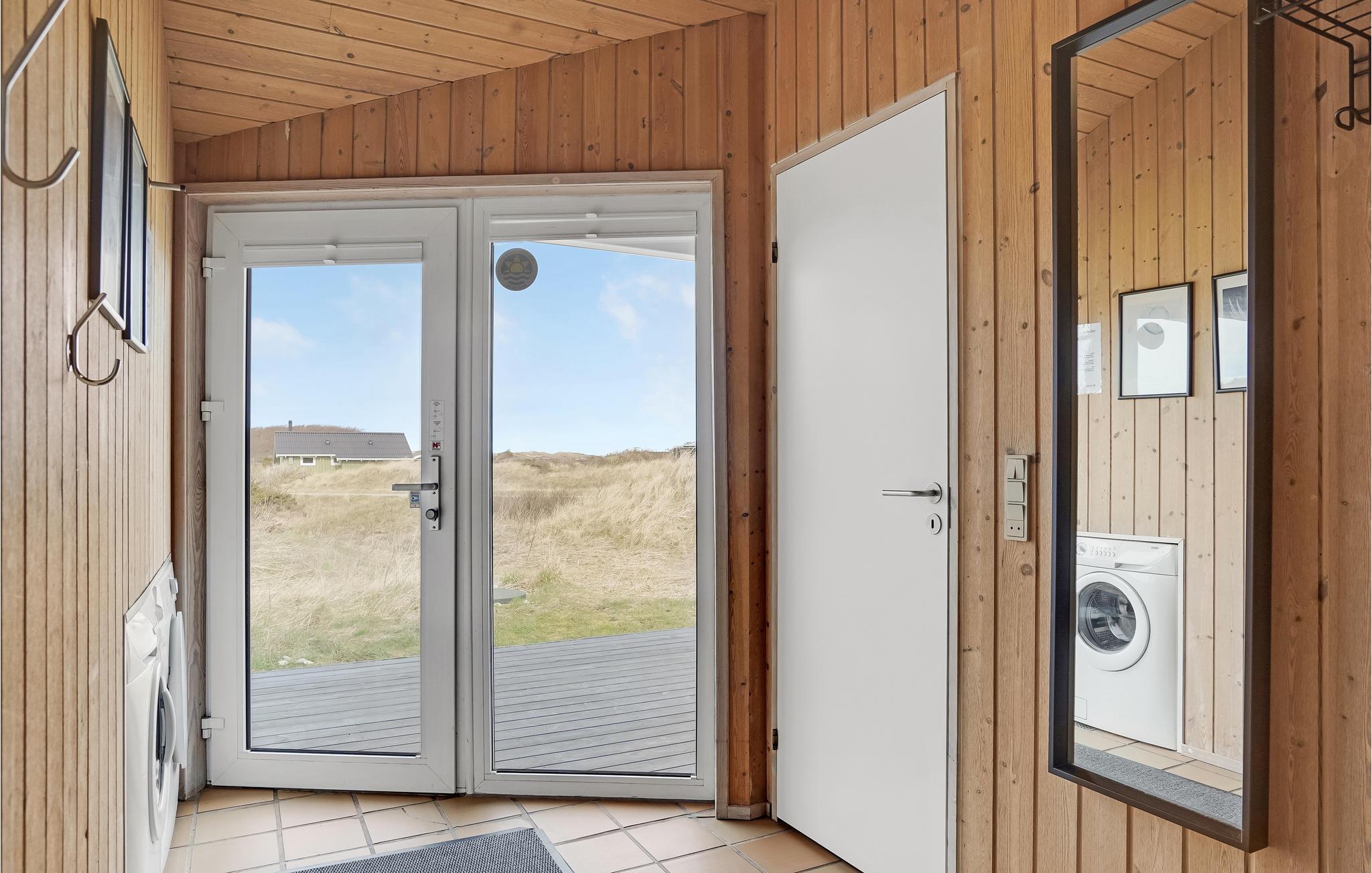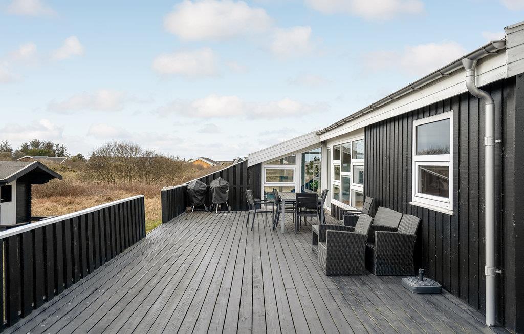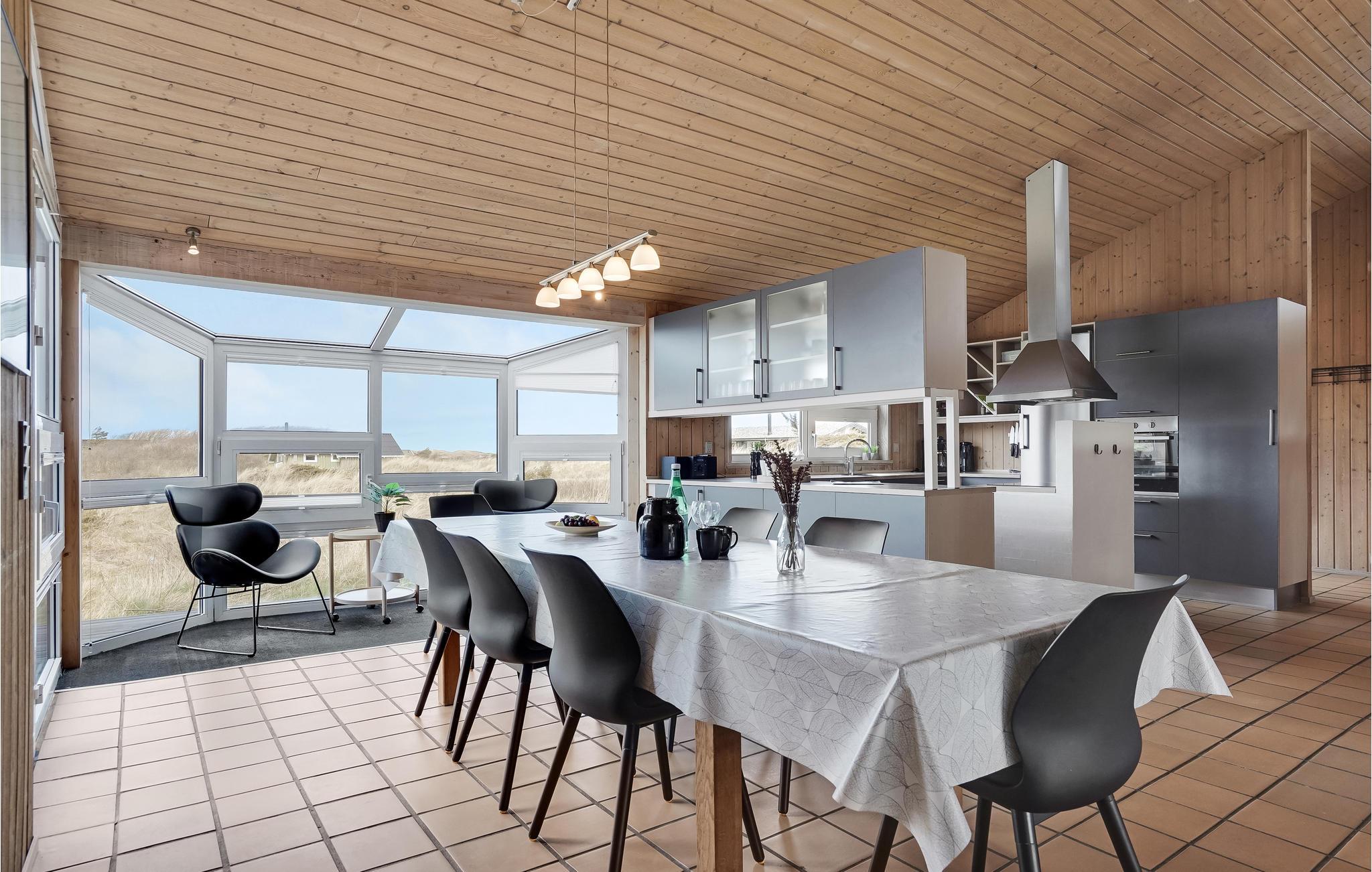 Godt en halv kilometer fra det brusende Vesterhav ligger dette skønne hus, som er børnevenligt og komfortabelt indrettet. I kan se frem til gedigne materialer og kvalitetsløsninger samt en rolig farveskala, og så er udsigten gennem de store vinduespartier helt fortryllende. Her er det nemt at slappe af. Nyd dagens måltider med udsigt til klitterne og læn jer godt tilbage i stuens bløde møbler. Poolen har samme flotte panoramaudsigt, så her kommer hele familien til en god del af ferien. Efter en lang dag på farten eller et hurtigt dyp i bølgerne, er det skønt at få varmen tilbage i kroppen ved at sætte sig til rette i saunaen.