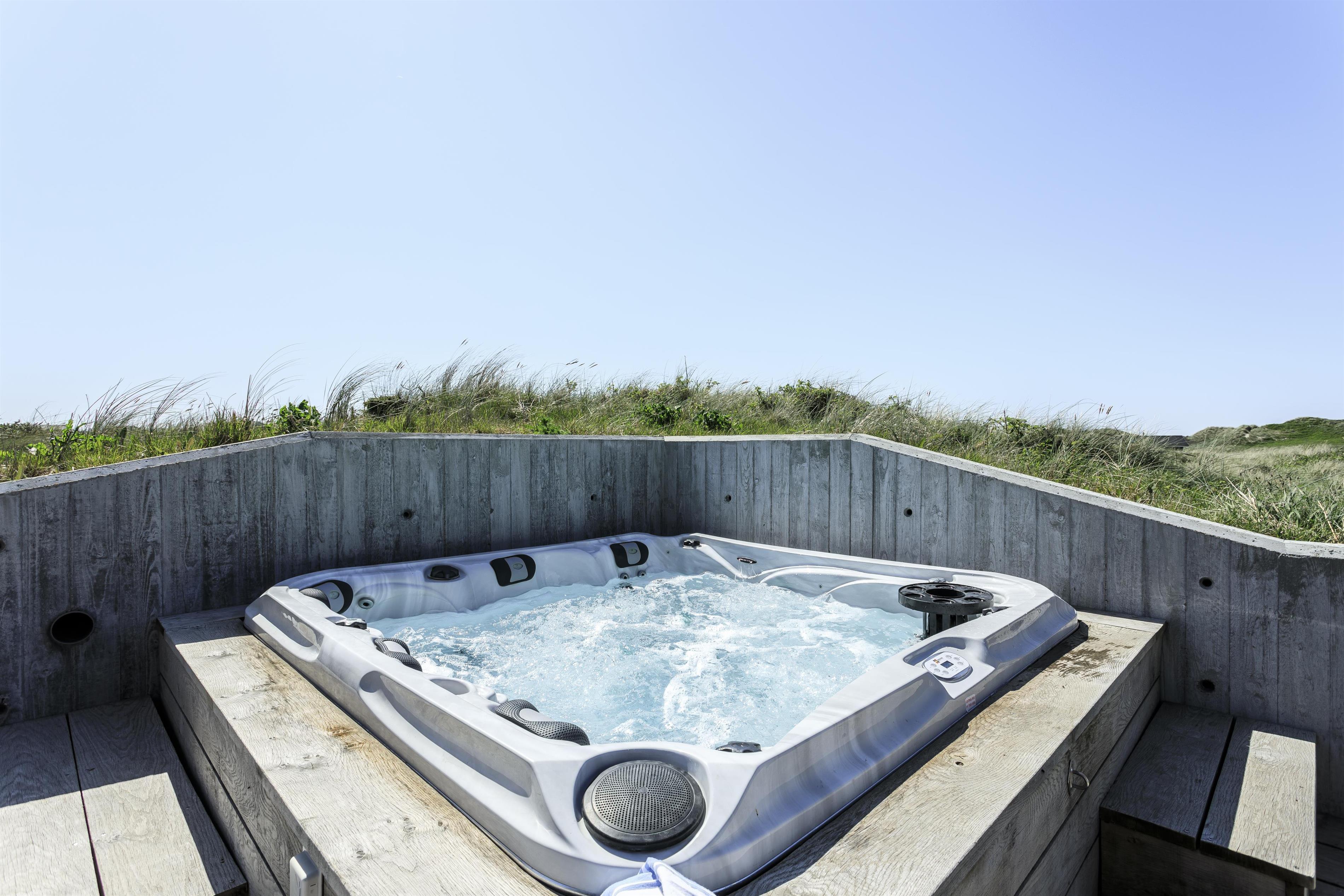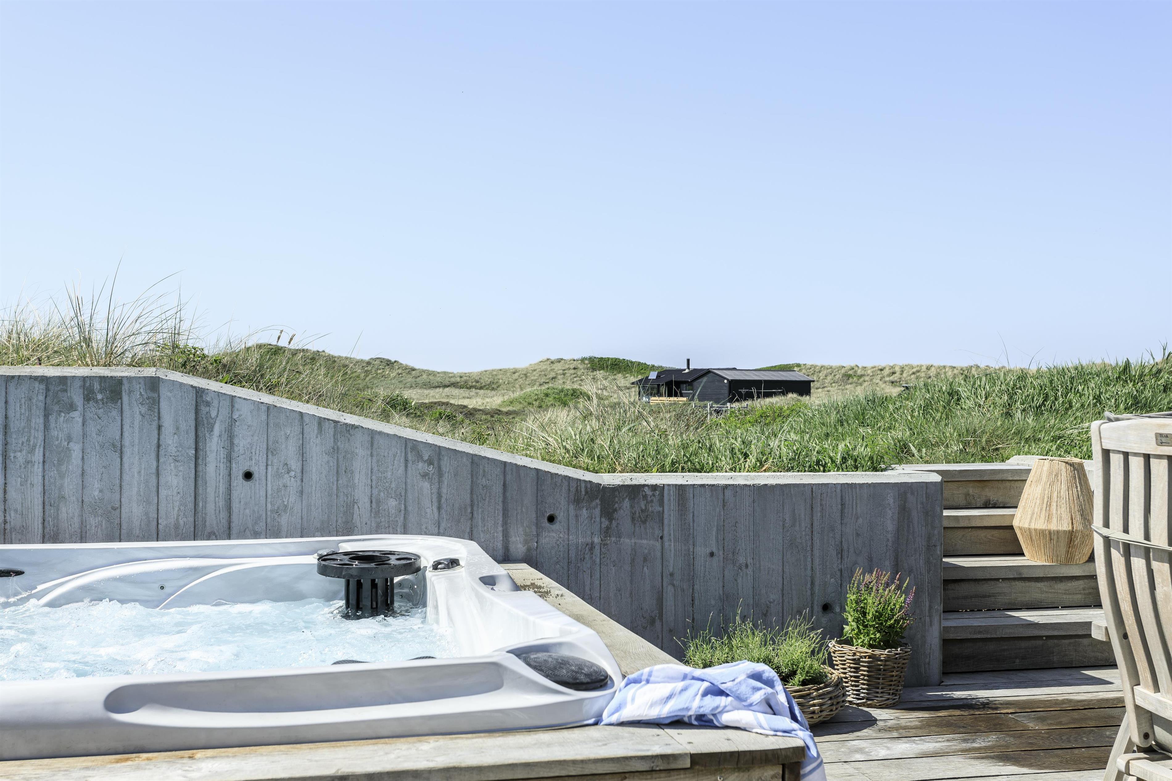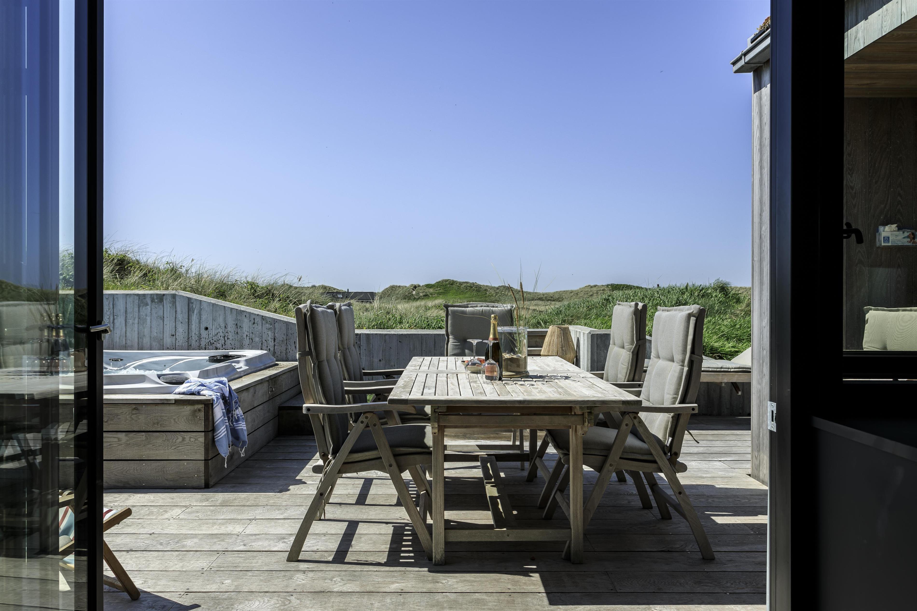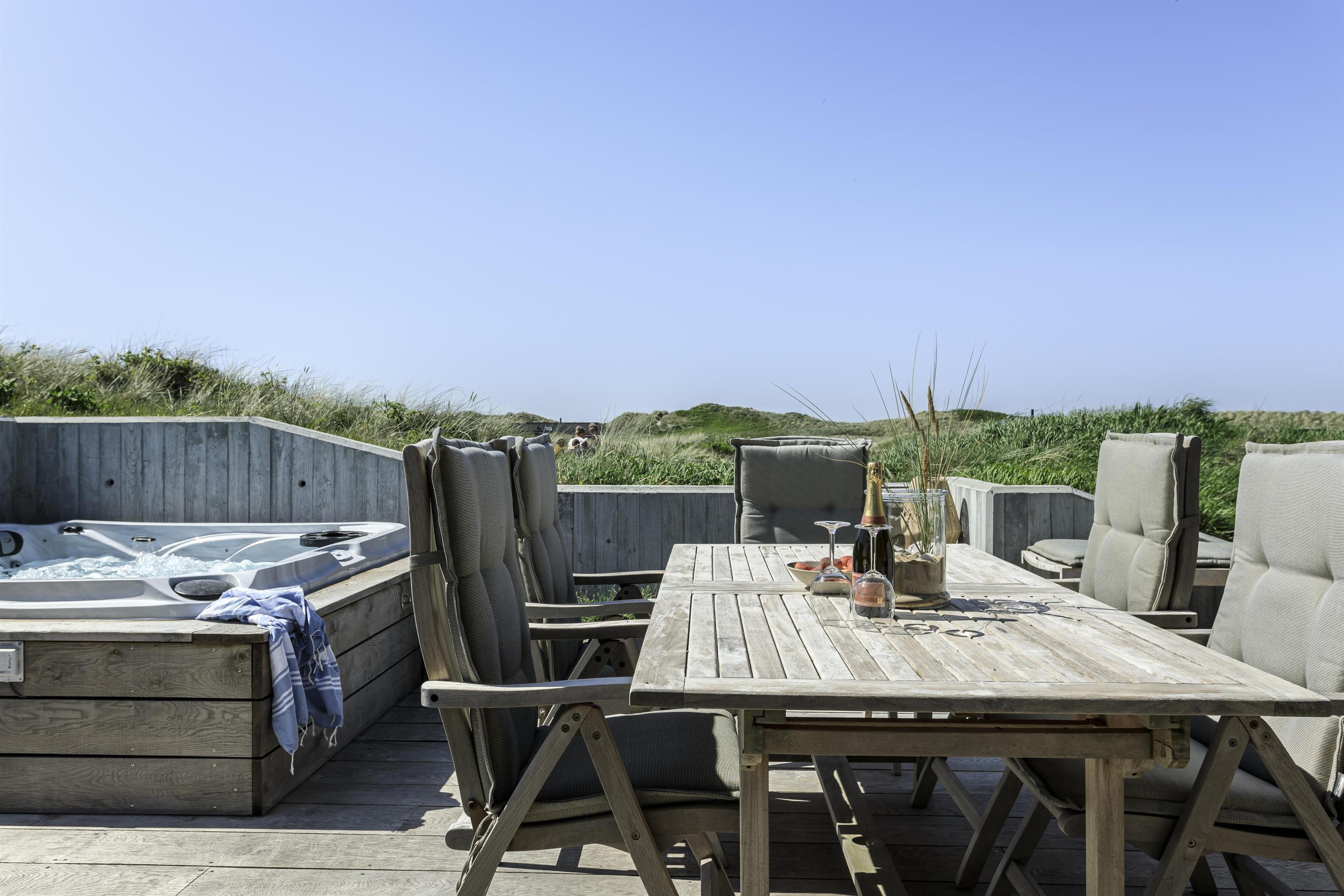 Feriehuset er placeret midt i det skønne klitlandskab, hvilket giver en fantastisk udsigt og ro. Huset byder på to gode træterrasser, så I kan få mest muligt ud af solen uanset tid på dagen. Start dagen med en tur under udebruseren, som også er praktisk efter en dag ved stranden, eller nyd en hyggelig stund i den store udespa, hvor du samtidig kan nyde den friske luft og udsigten.