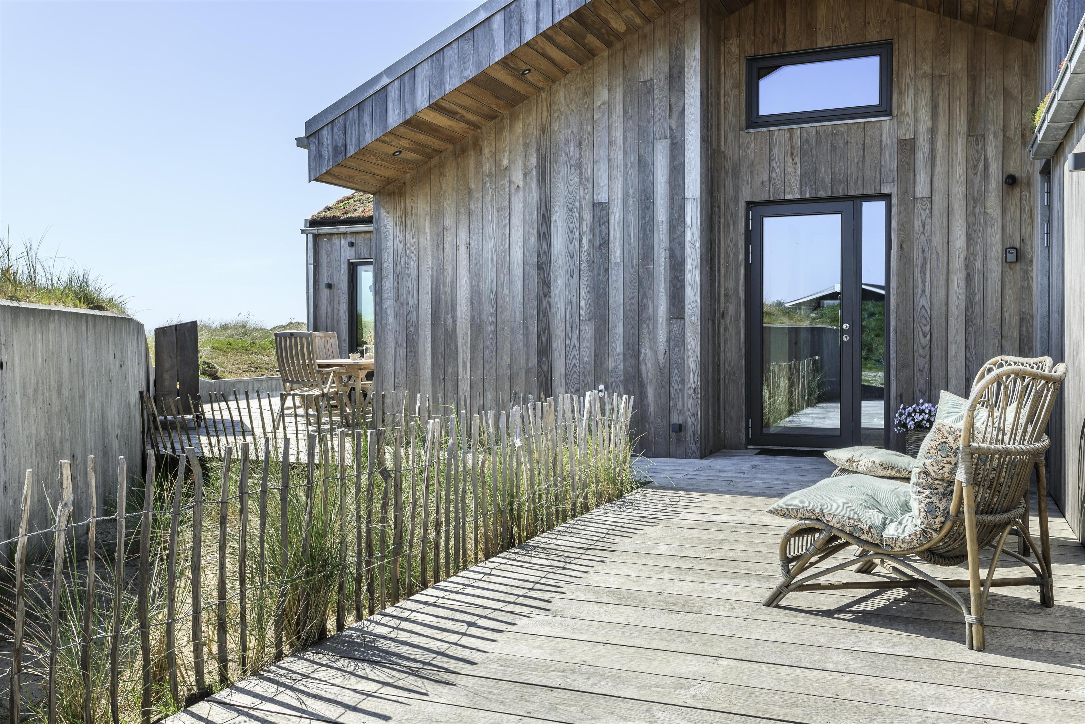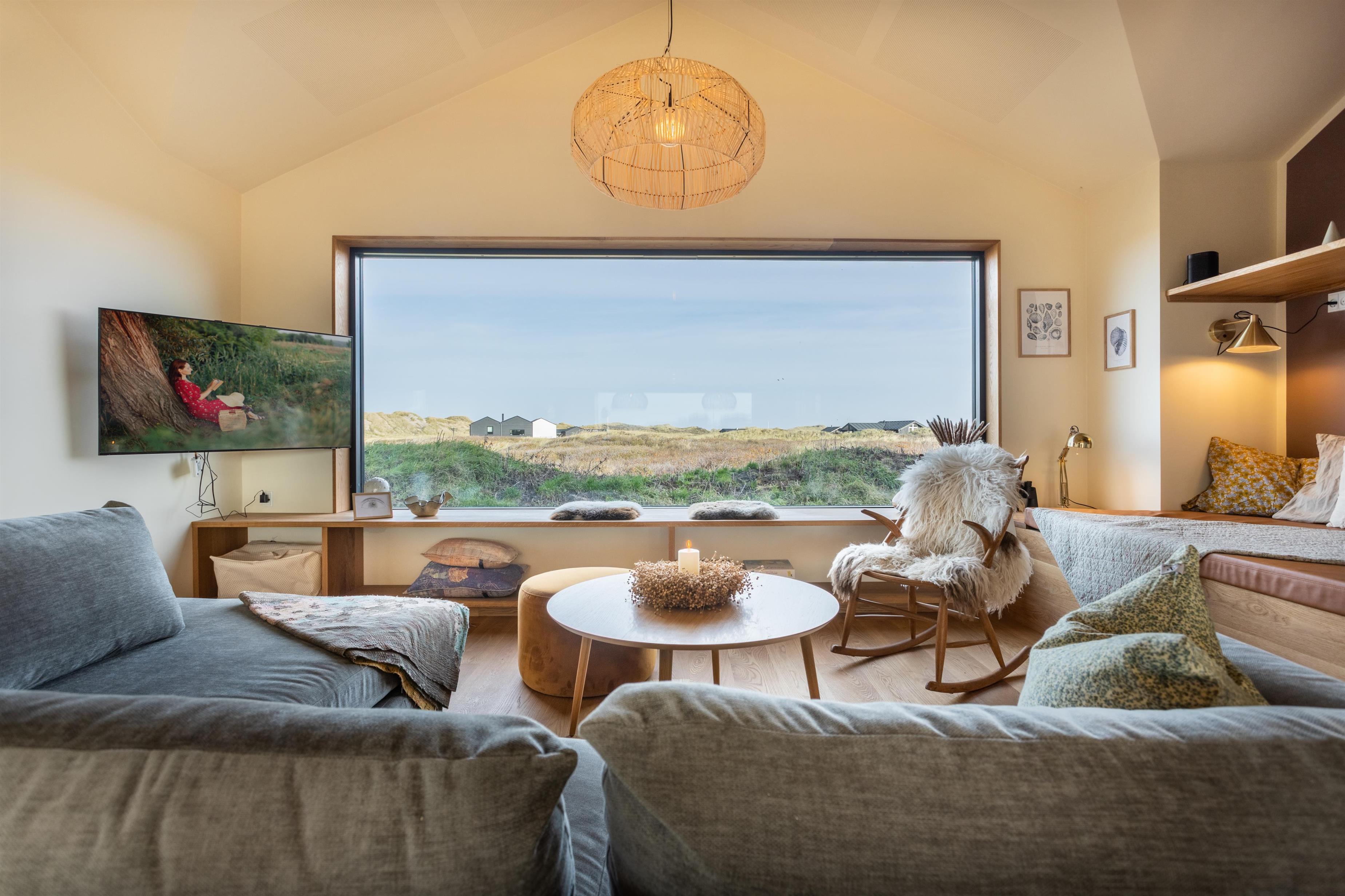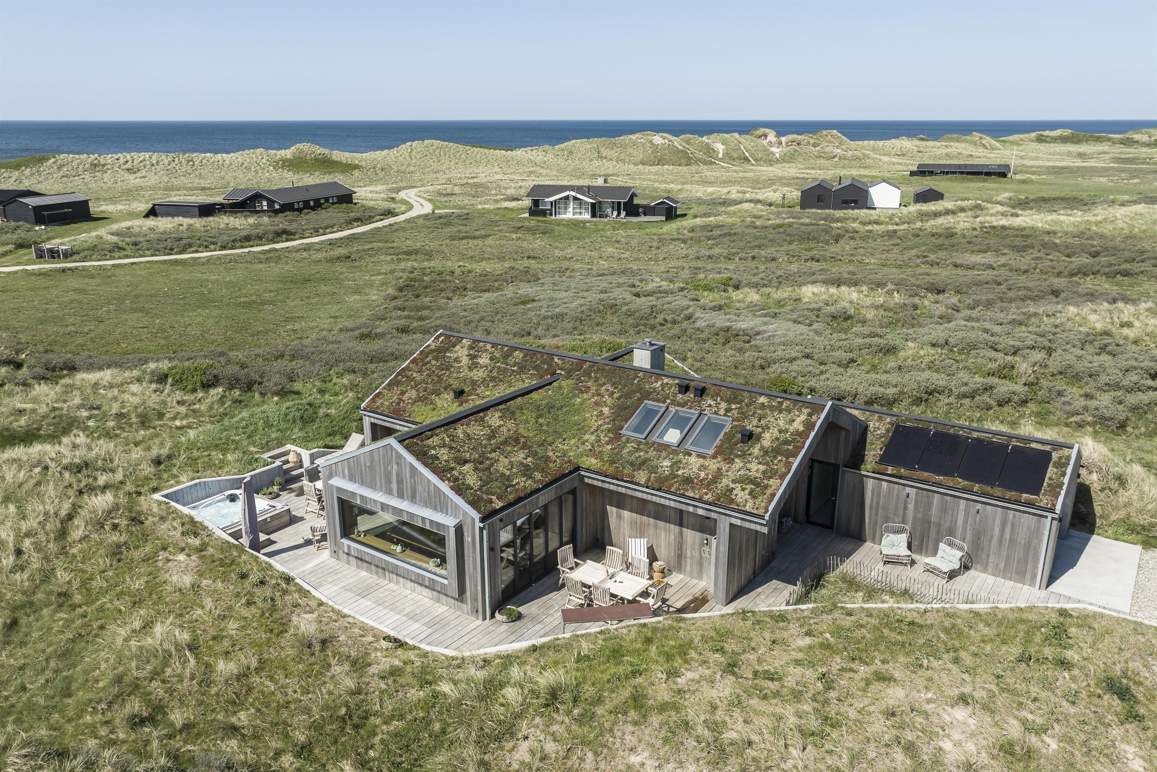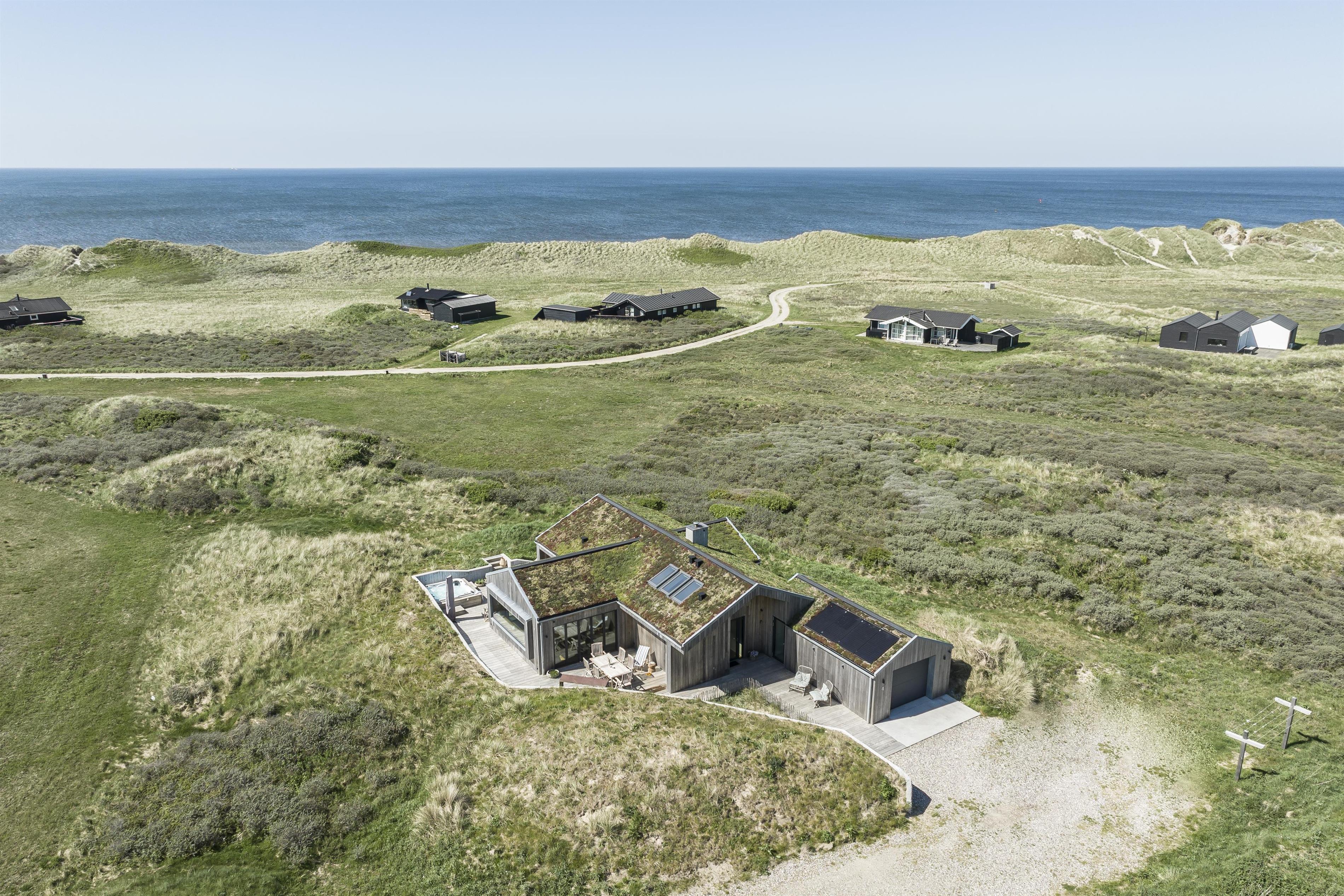 Feriehuset er placeret midt i det skønne klitlandskab, hvilket giver en fantastisk udsigt og ro. Huset byder på to gode træterrasser, så I kan få mest muligt ud af solen uanset tid på dagen. Start dagen med en tur under udebruseren, som også er praktisk efter en dag ved stranden, eller nyd en hyggelig stund i den store udespa, hvor du samtidig kan nyde den friske luft og udsigten.