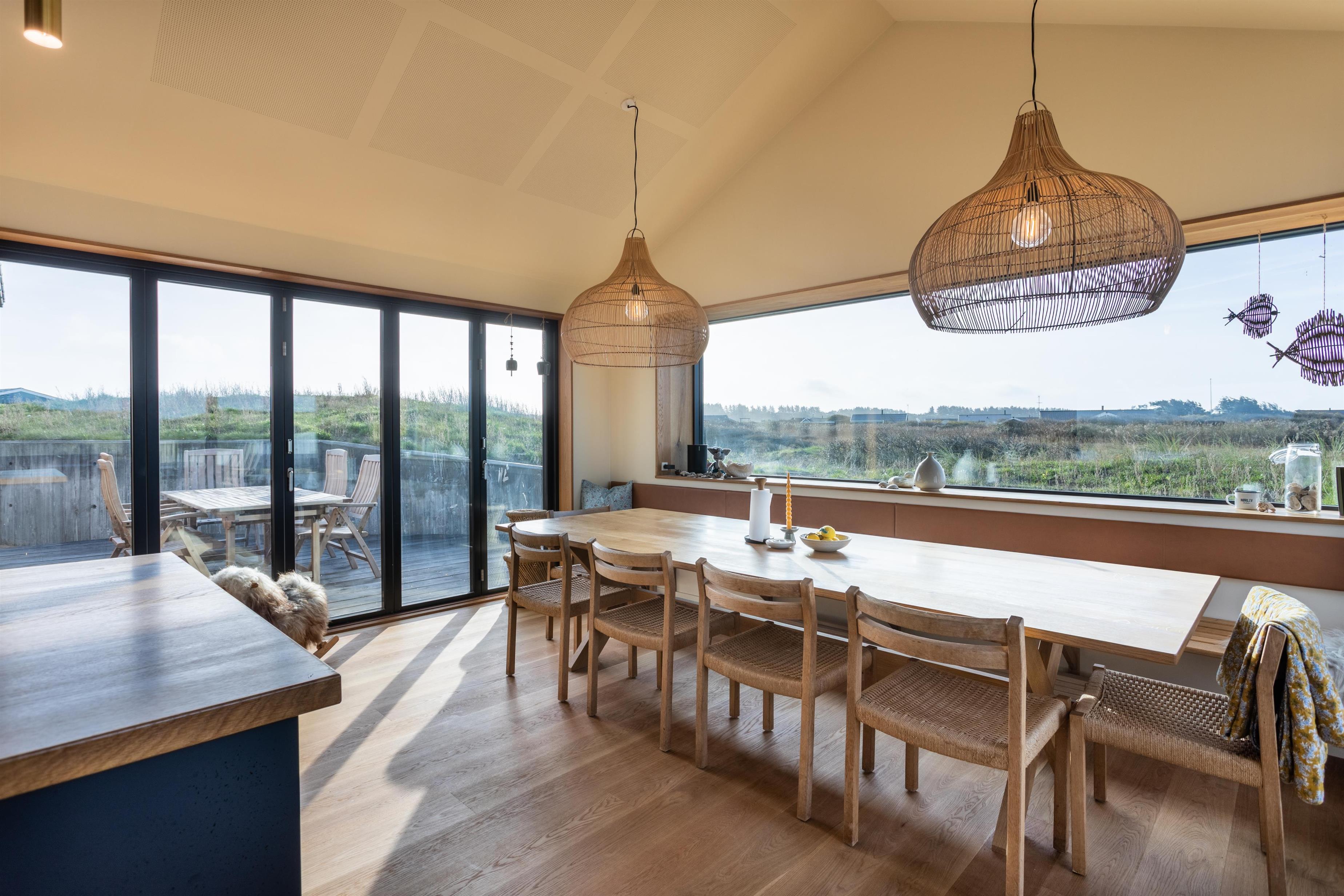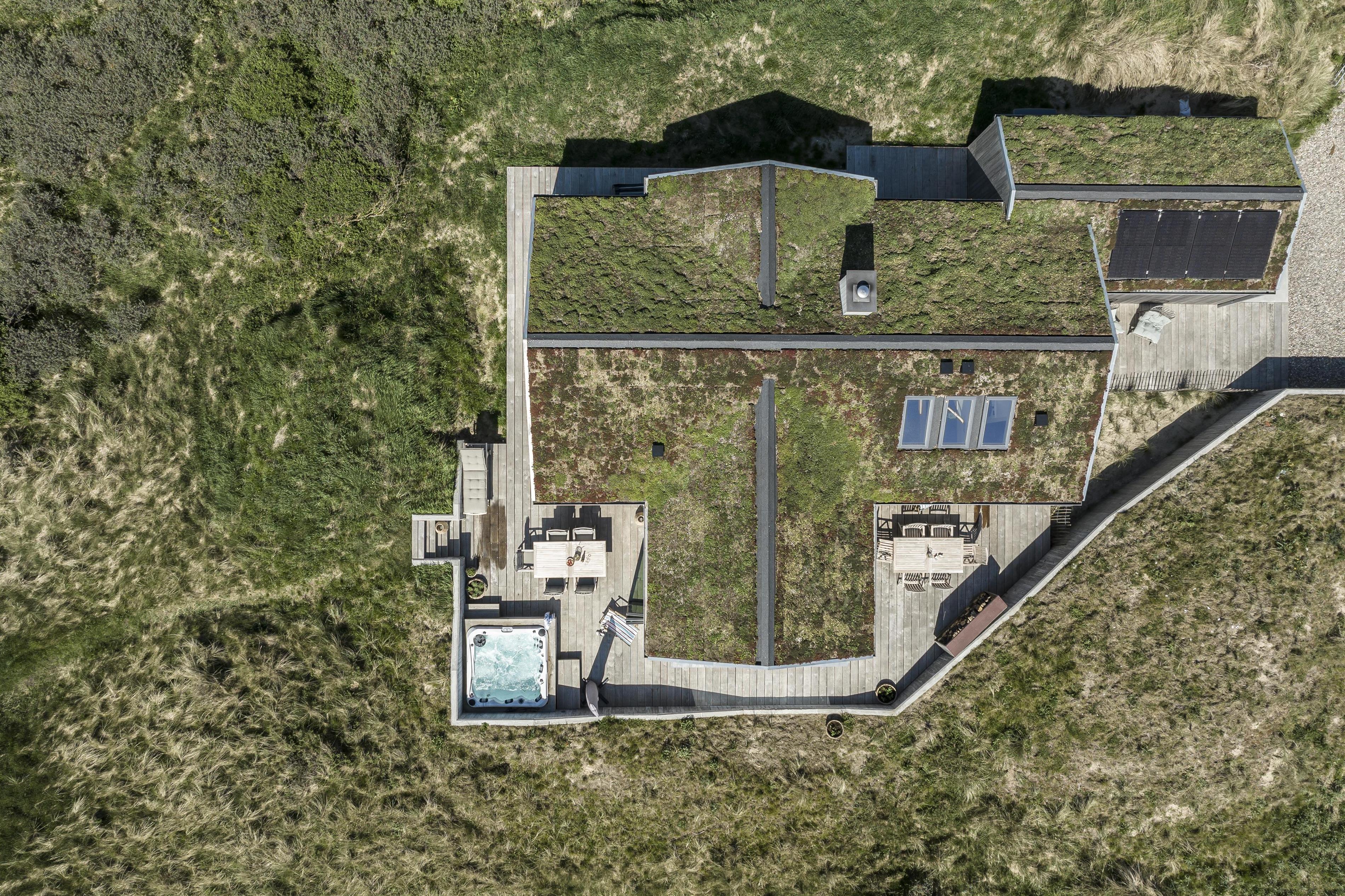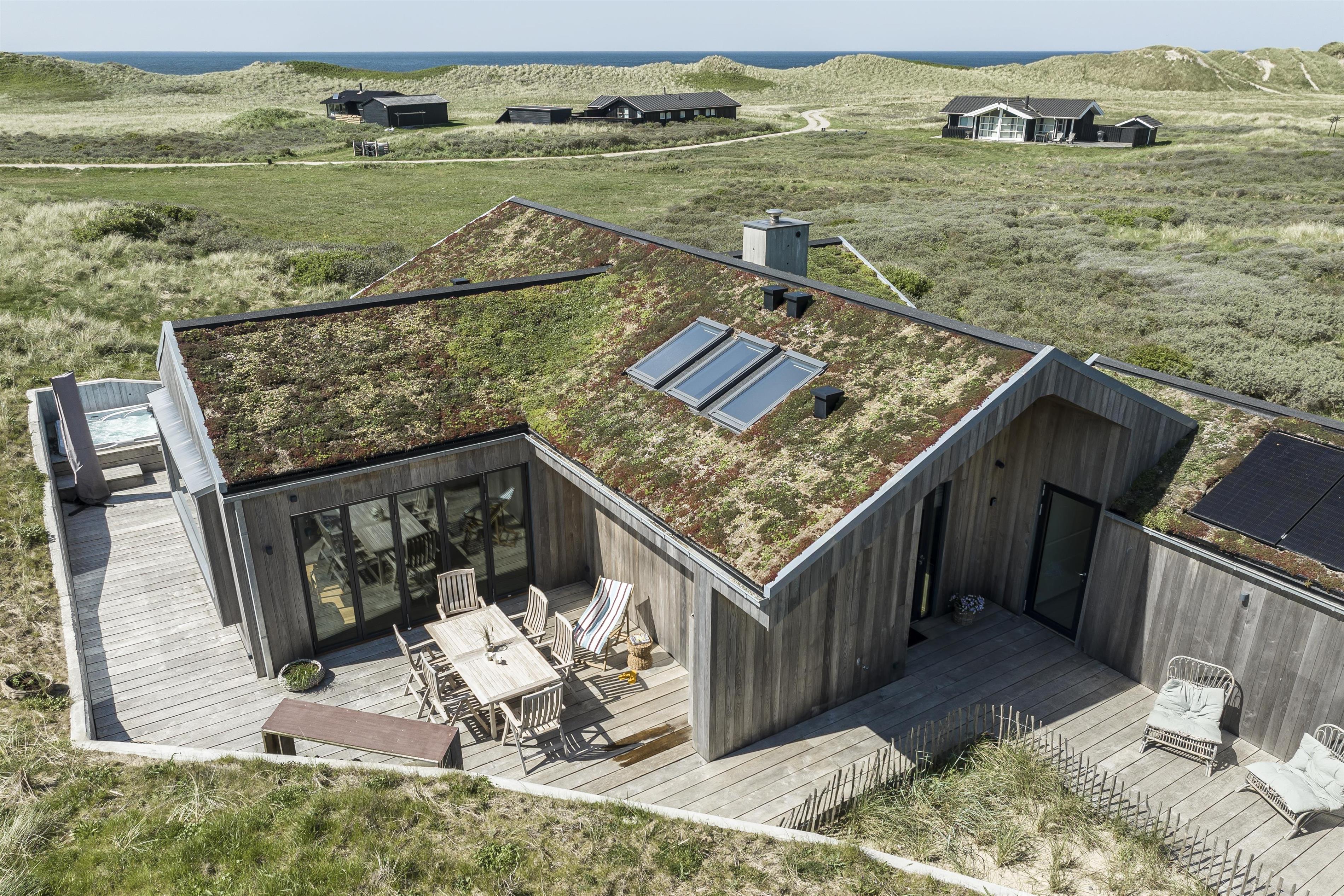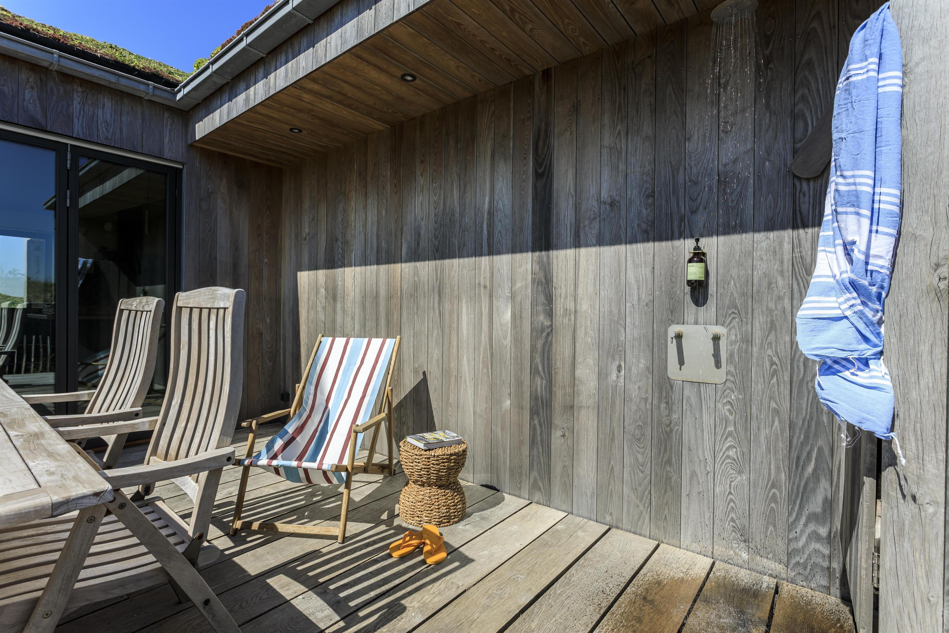 Feriehuset er placeret midt i det skønne klitlandskab, hvilket giver en fantastisk udsigt og ro. Huset byder på to gode træterrasser, så I kan få mest muligt ud af solen uanset tid på dagen. Start dagen med en tur under udebruseren, som også er praktisk efter en dag ved stranden, eller nyd en hyggelig stund i den store udespa, hvor du samtidig kan nyde den friske luft og udsigten.