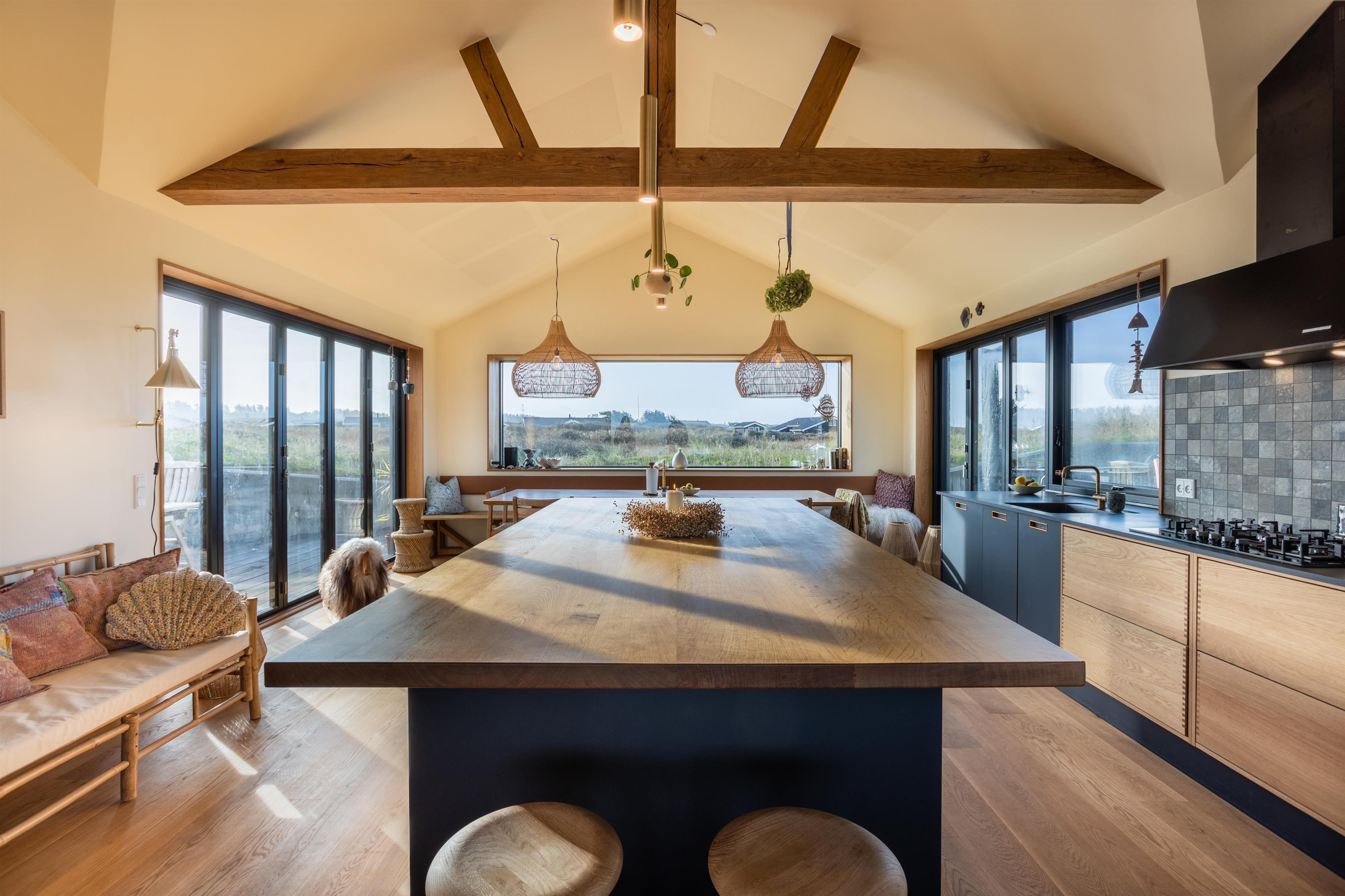 Huset består af et stort køkken-alrum, som opfylder alle kriterier for en ferie med samvær i fokus. Slå jer ned ved det store spisebord og spil et brætspil mens der kokkereres i køkkenet på gaskomfuret eller læs en god bog i stuen, som ligger i direkte forlængelse af køkken-alrummet. Huset rummer op til 8 overnattende gæster og byder på tre gode soveværelser - alle med direkte udgang til den skønne, rå natur. To af soveværelserne er med dobbeltsenge og det sidste er med to speciallavede køjesenge med ekstra bredde, der gør dem meget komfortable for store og små. Fra alrummet har I adgang til en stor, hyggelig hems med to sovepladser. Til slut er der to badeværelser; Det store badeværelse er med dobbeltbruseniche, mens det andet badeværelse er med bruseniche og vaskesøjle.