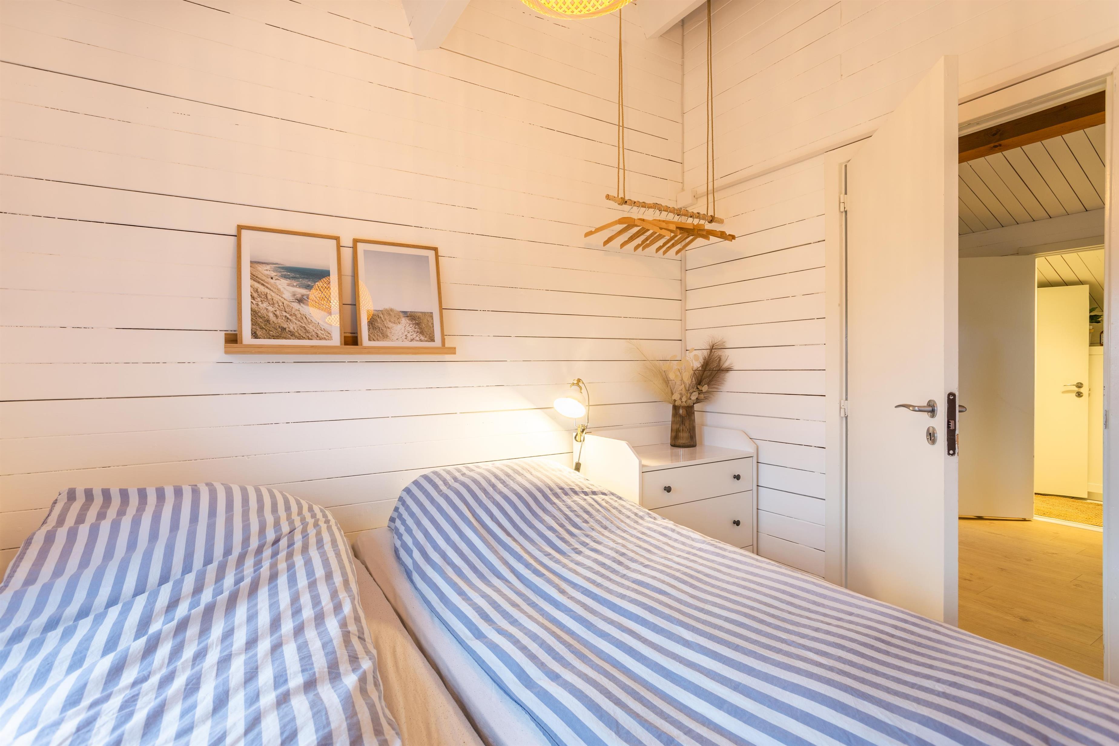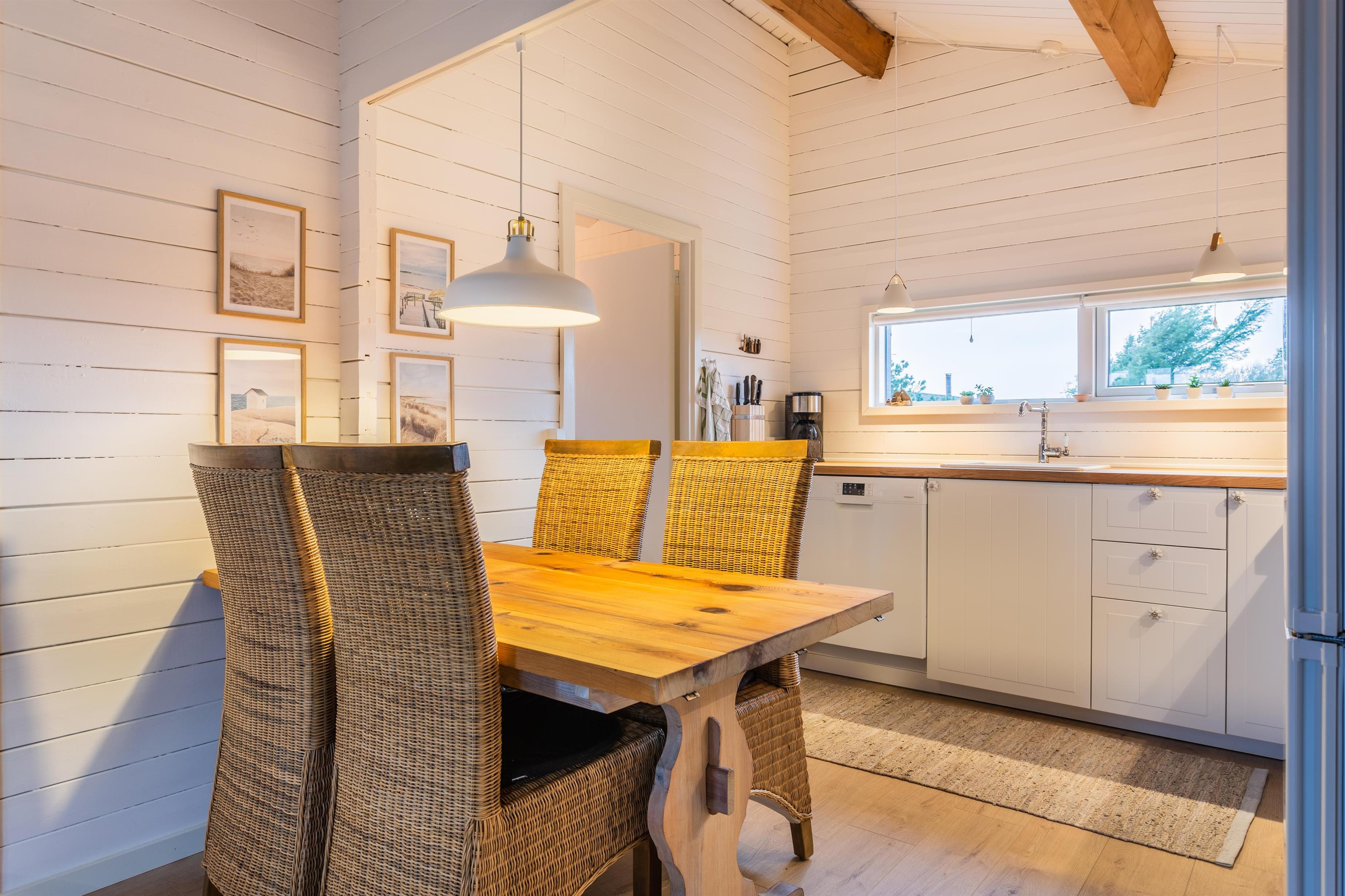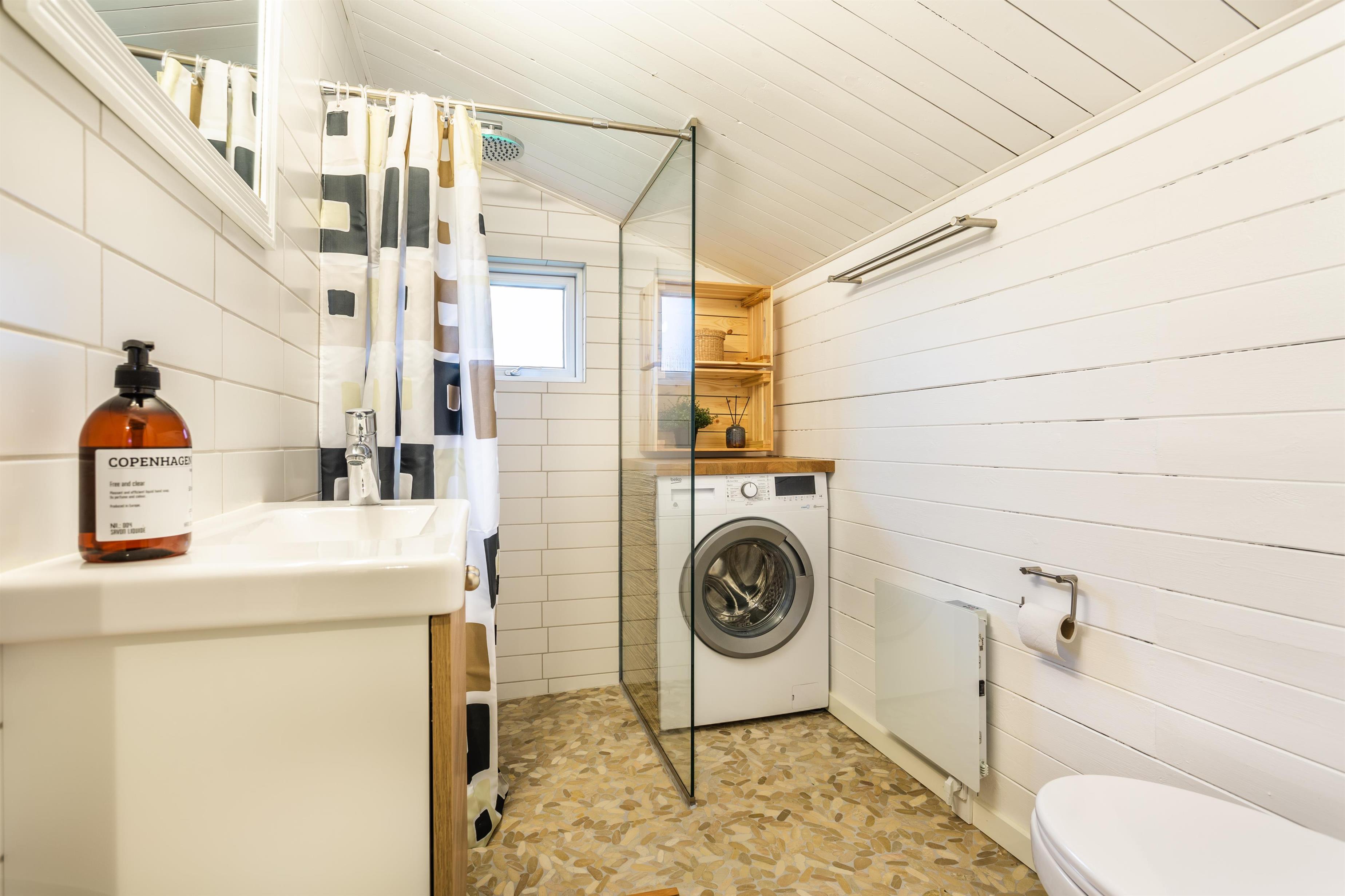Fra det øjeblik I træder ind i entréen, vil I mærke husets charme og indbydende stemning. Det lyse køkken ligger i åben forbindelse med stuen, som indbyder til hyggelige stunder med familie eller venner. Efter en oplevelsesrig dag kan I slappe af i sofaen til lyden af brændeovnens knitren, mens dagens minder deles. Fra stuen er der direkte udgang til terrassen, hvor I kan nyde den friske havluft. Huset har to soveværelser, begge med dobbeltsenge. I det ene soveværelse finder I desuden en praktisk overkøje, som gør huset velegnet til familier med børn. Badeværelset er lyst og funktionelt indrettet med bruseniche. Alt i alt et indbydende sommerhus, hvor man straks føler sig hjemme.