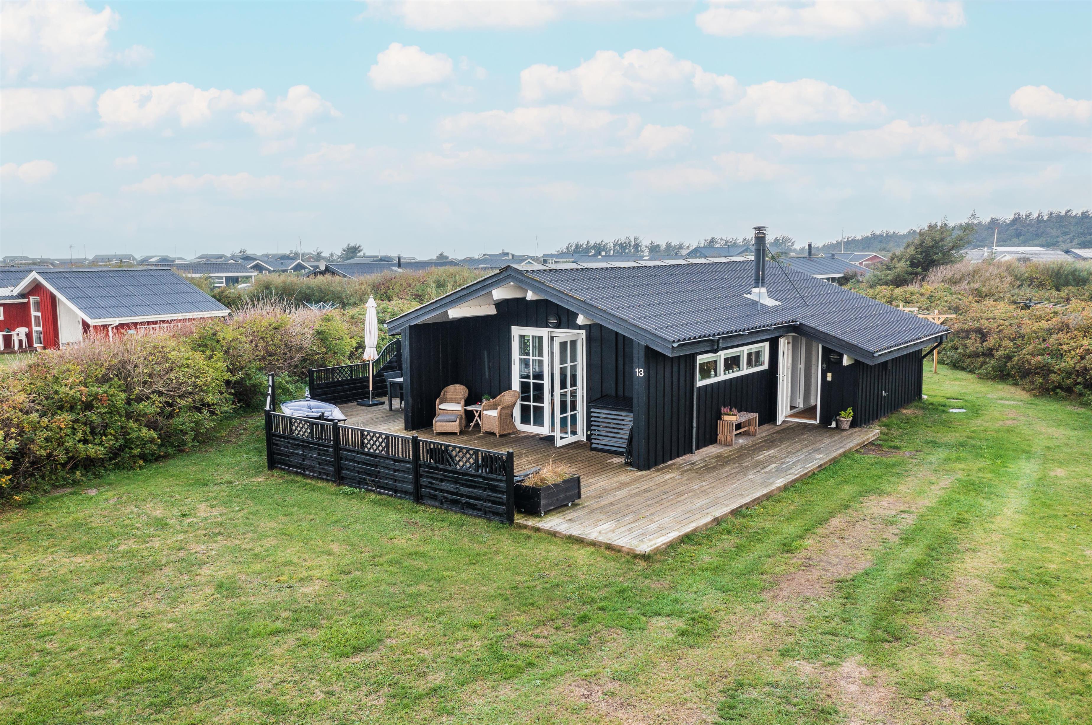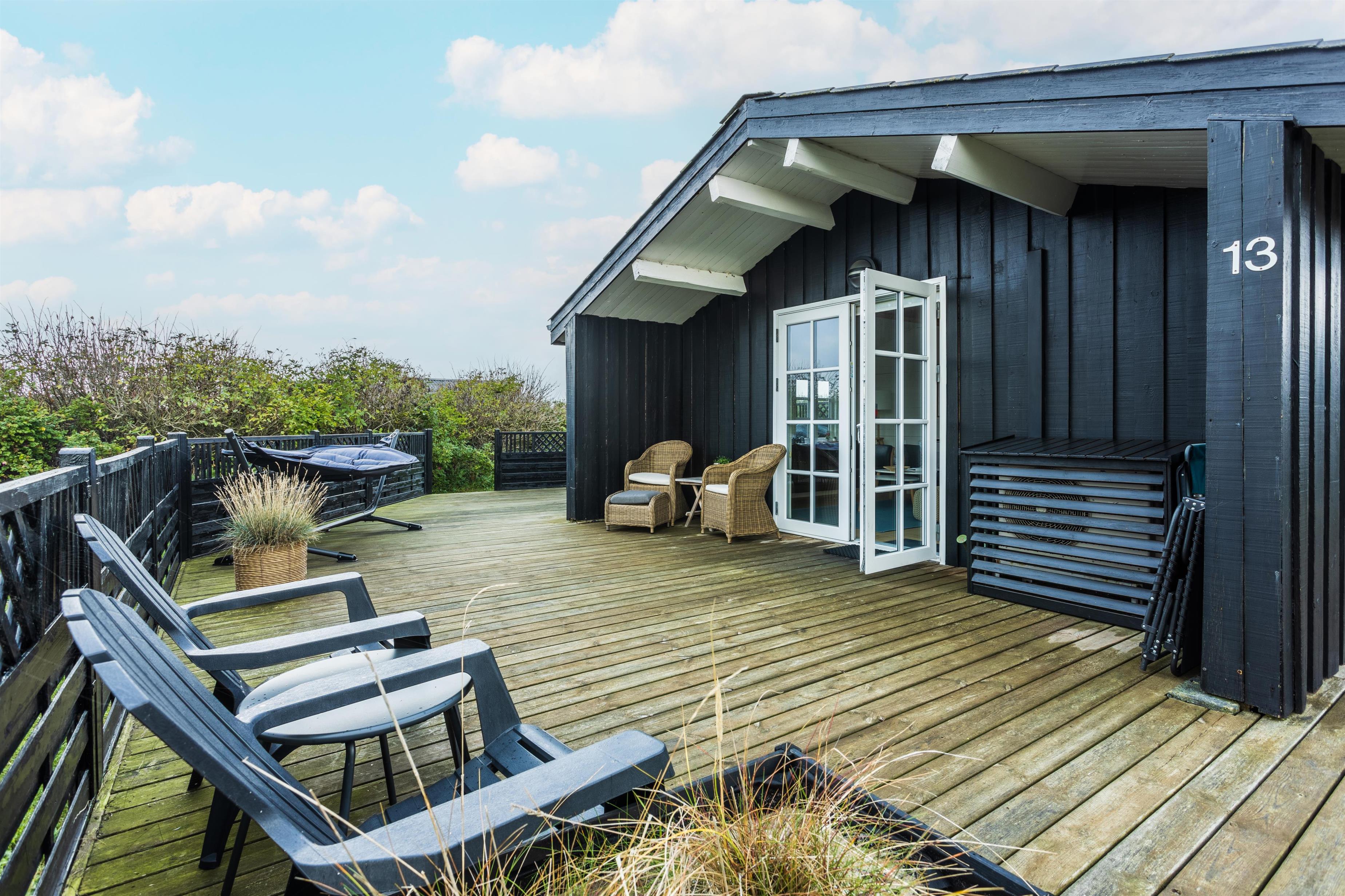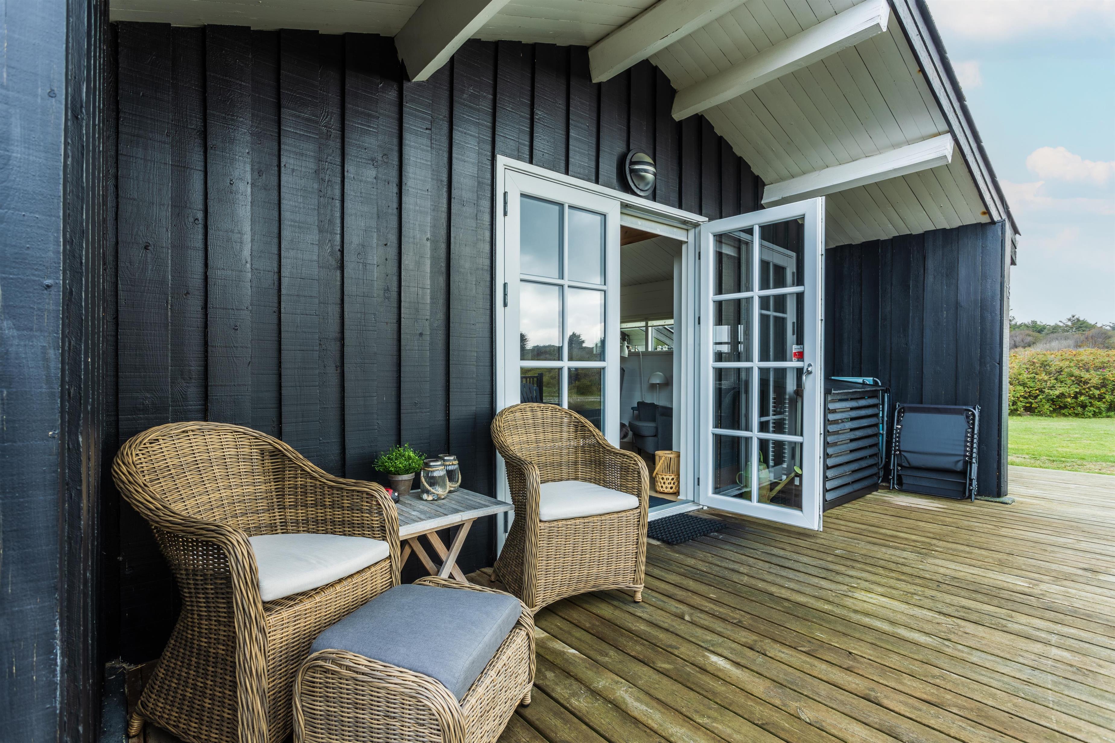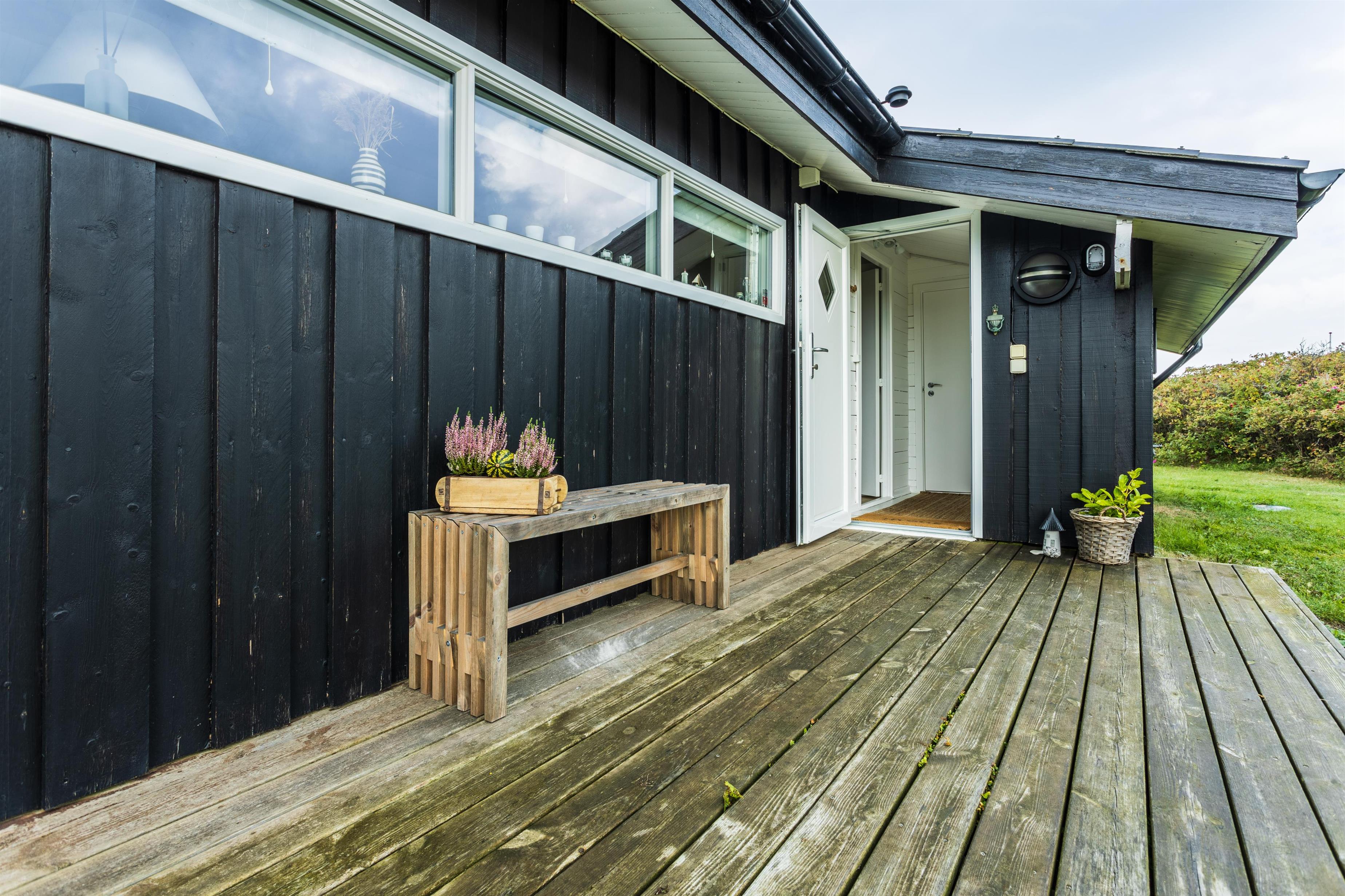 Fra huset er der direkte adgang til en stor, skøn træterrasse, som dækker husets syd og vest side. Terrassen er det perfekte sted at nyde solen eller en rolig stund med udsigt til det omkringliggende landskab. Haven giver plads til både leg og hygge, mens nærheden til stranden gør det nemt at tage en forfriskende dukkert eller gå en afslappende tur langs kysten.