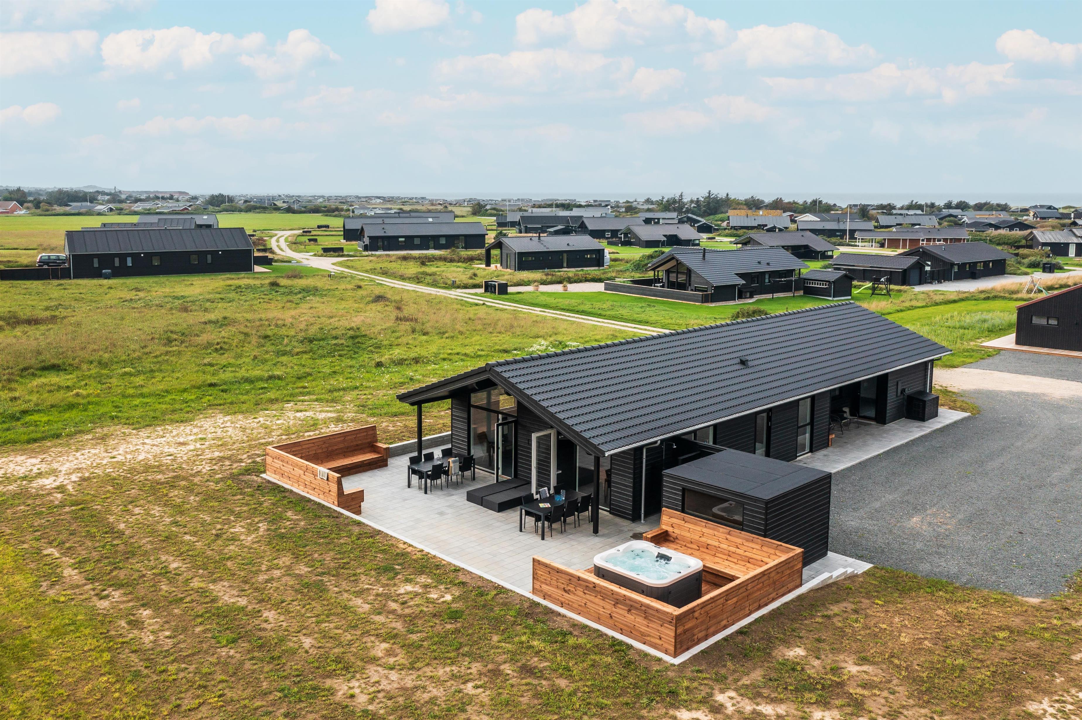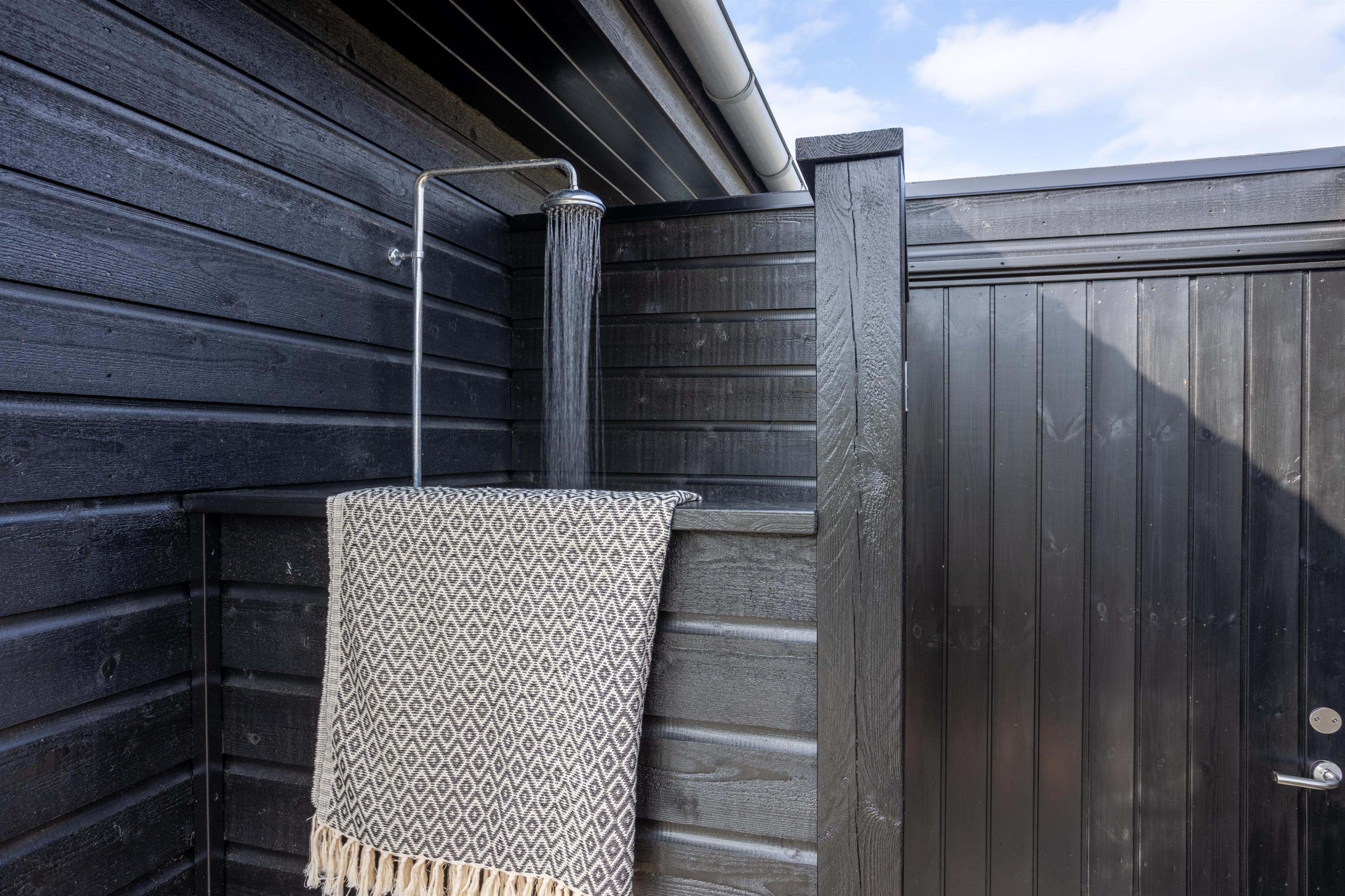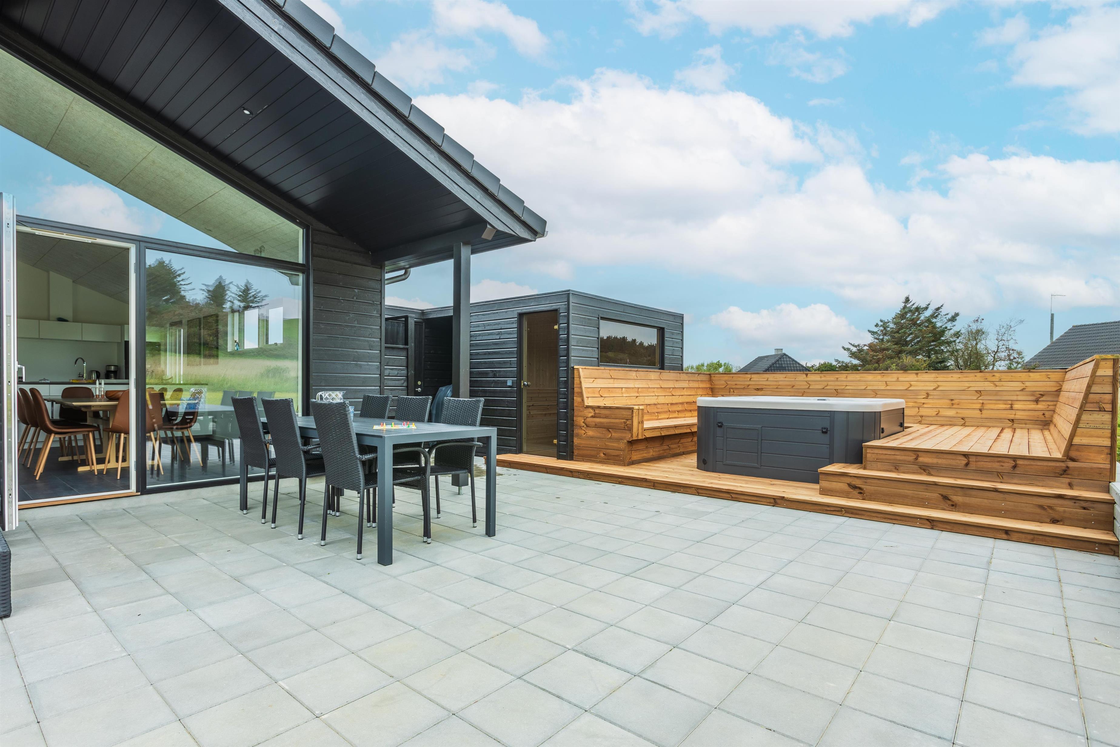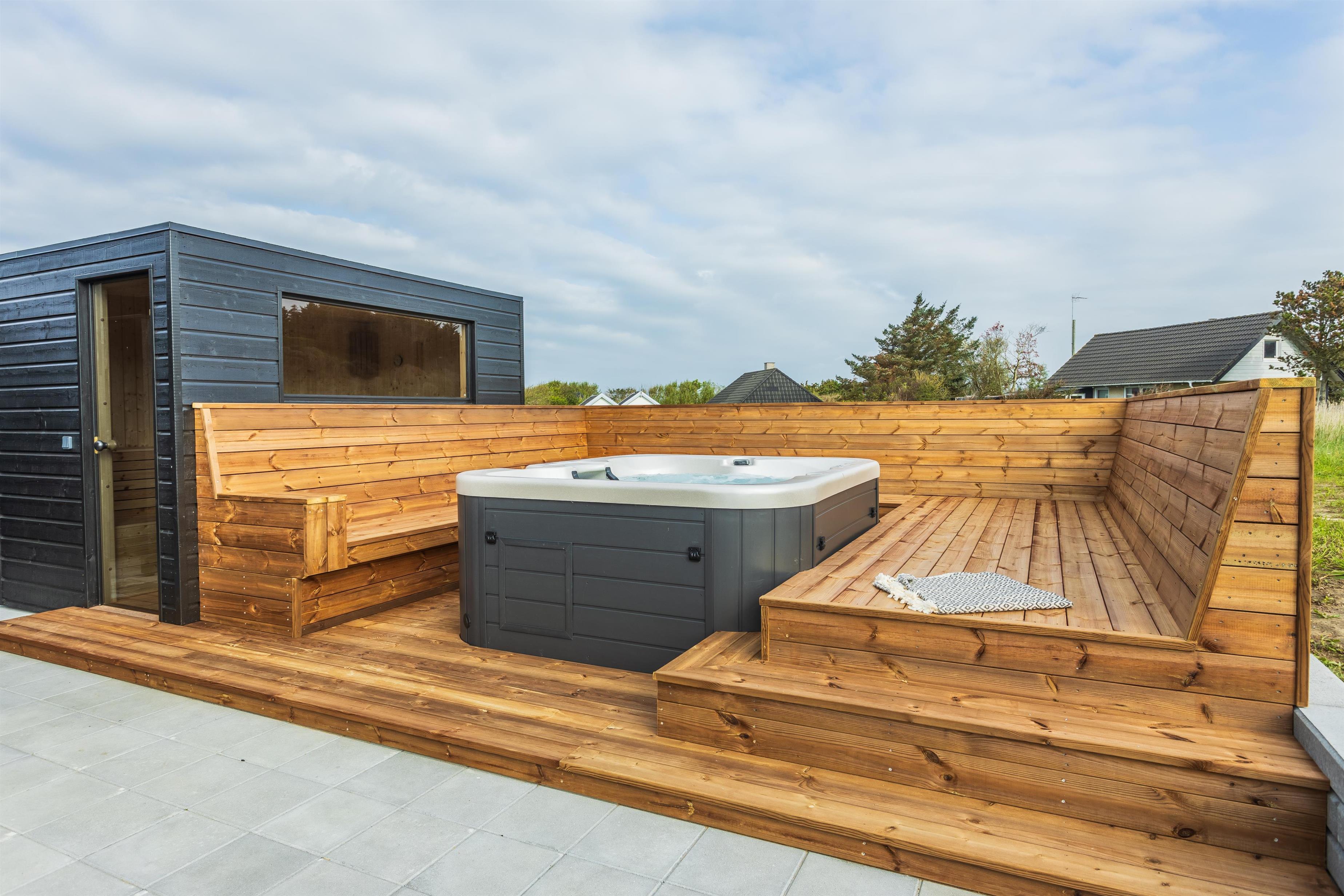 Huset er indrettet med en stor og rummelig terrasse samt et wellness-område med både udebruser (med varmt og koldt vand), spa og sauna. Terrassen ligger ugeneret bag ved huset og grænser op til et fredet område og med det bakkede landskab i baggrunden. Der er et delvist overdækket terrassemiljø samt et stort åbent uderum, og på plænen er der mulighed for at boltre sig eller dyste i diverse havespil.