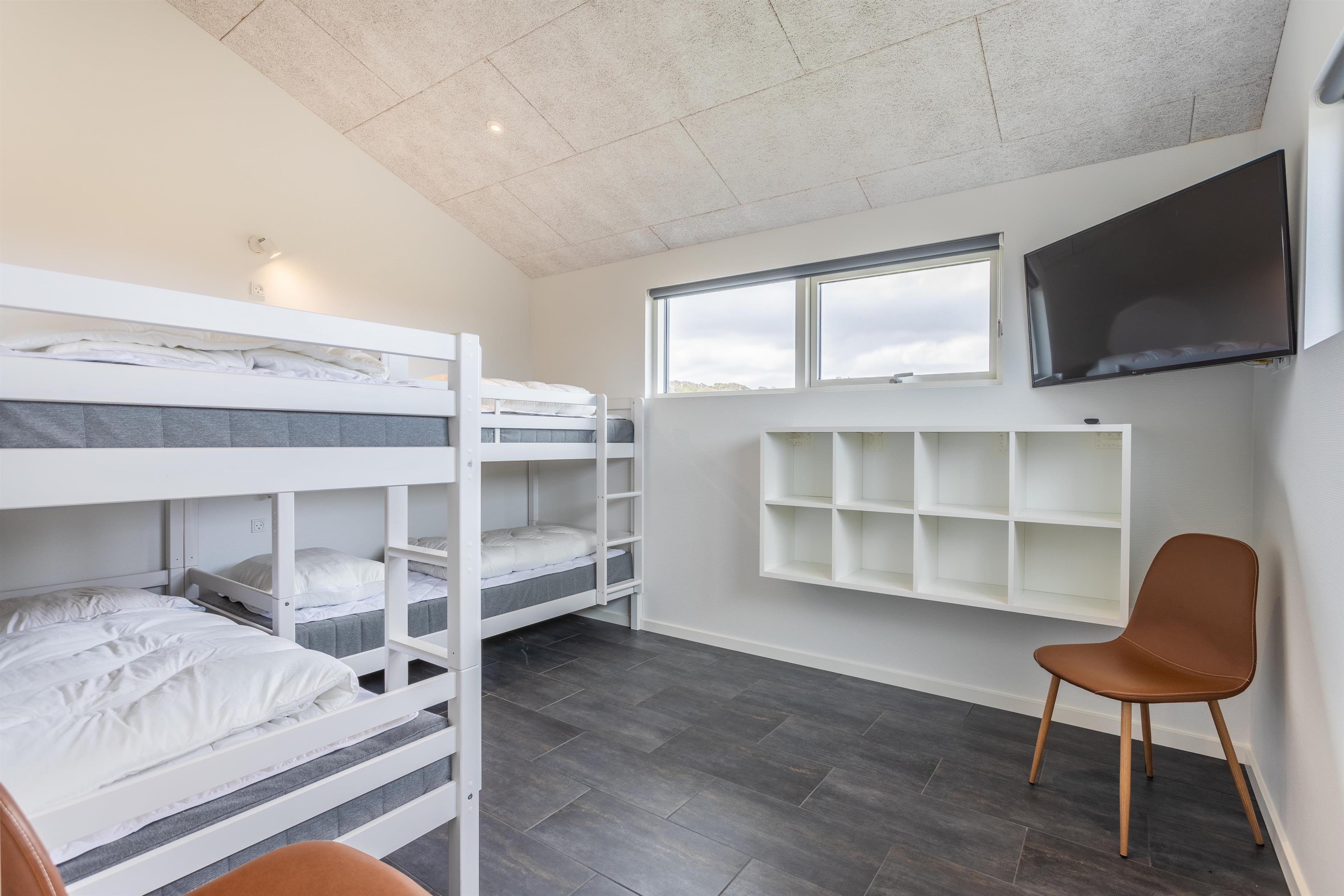 Går man ud af hoveddøren og drejer mod venstre, går man ind i aktivitetsrummet. Dette hænger sammen med huset og byder på både dart, bordfodbold og airhockey. Det er også her, I finder vaskemaskine og tørretumbler. Fra aktivitetsrummet har I direkte adgang til husets 5. soverum, som er indrettet med 2 køjesenge og et stort tv.