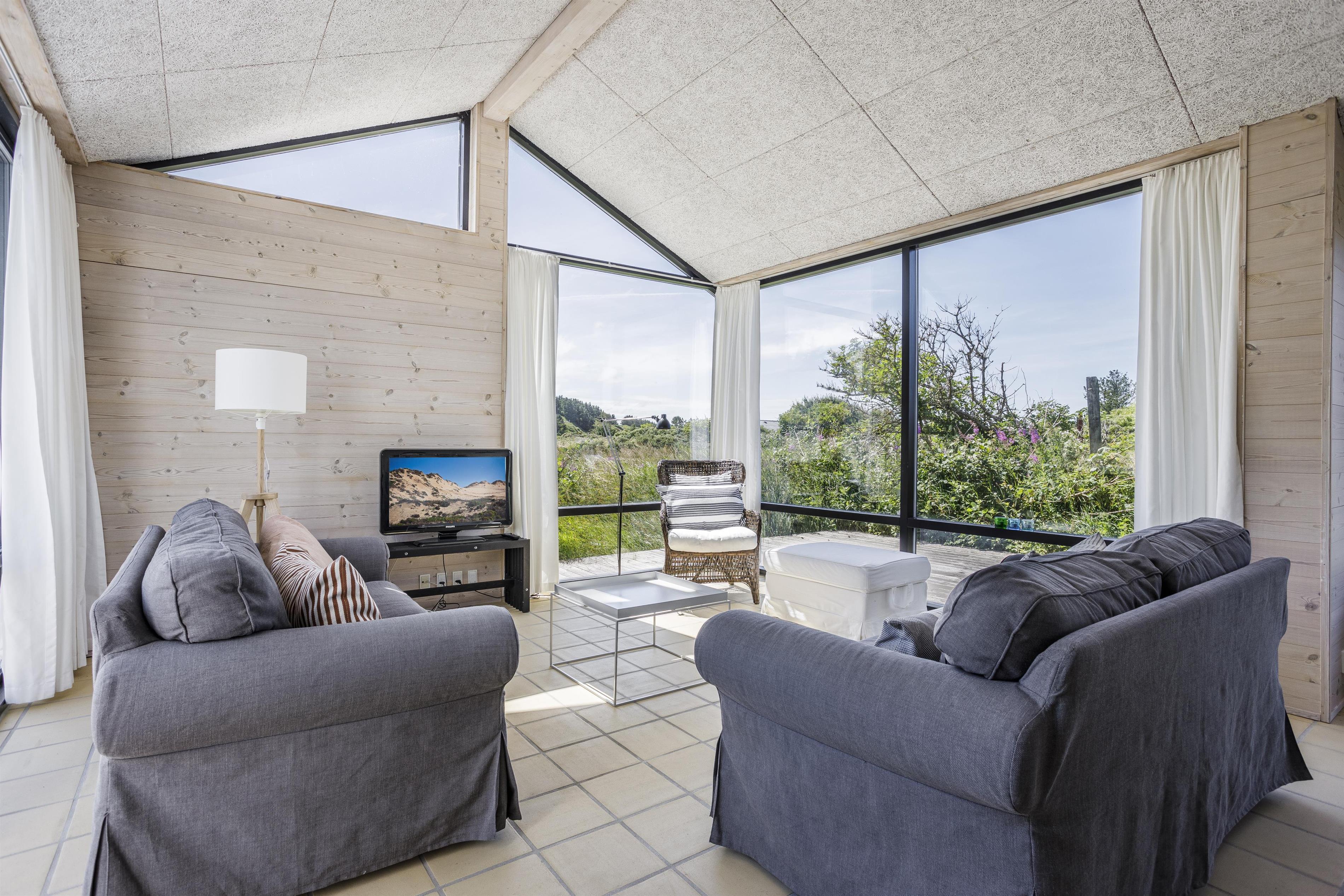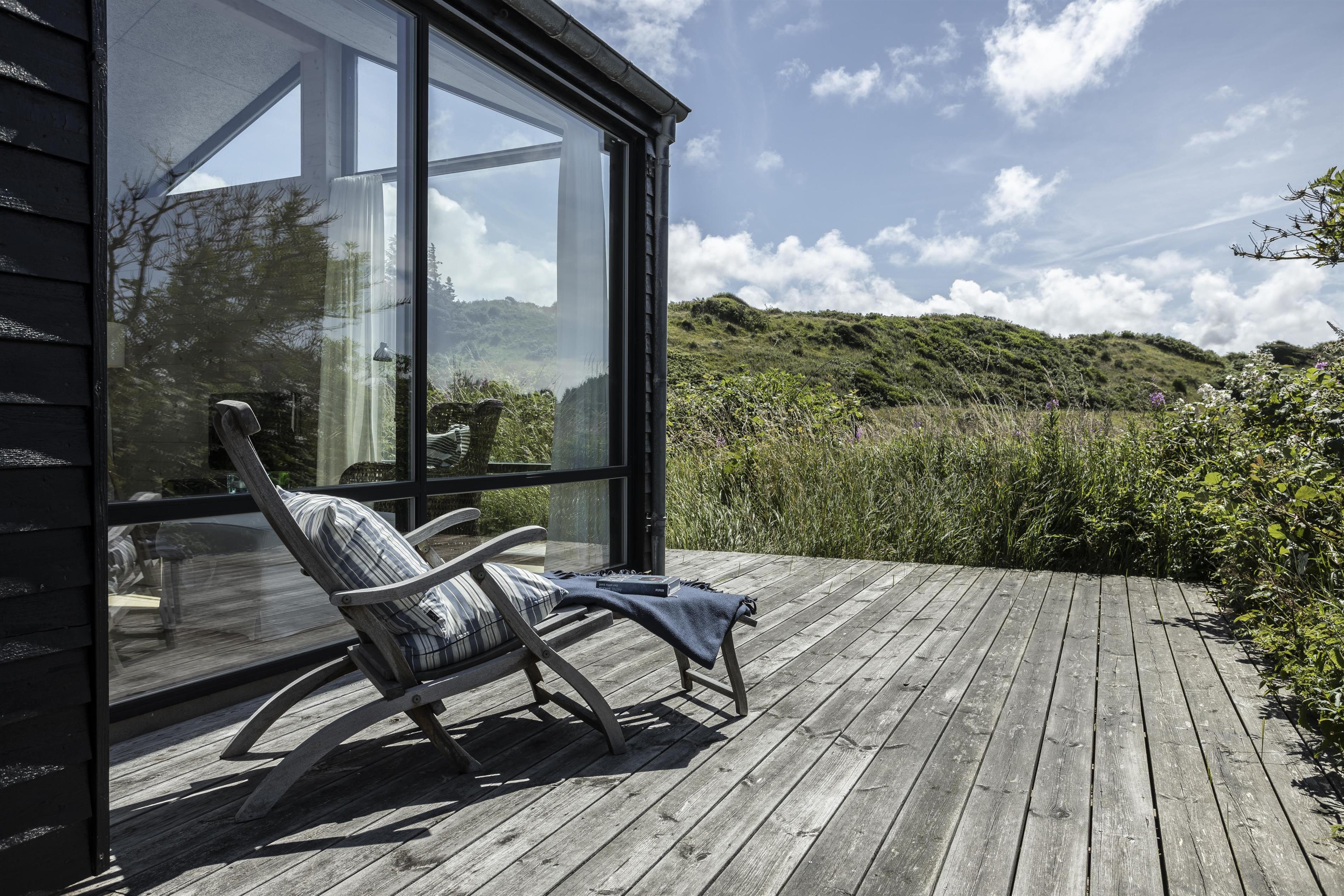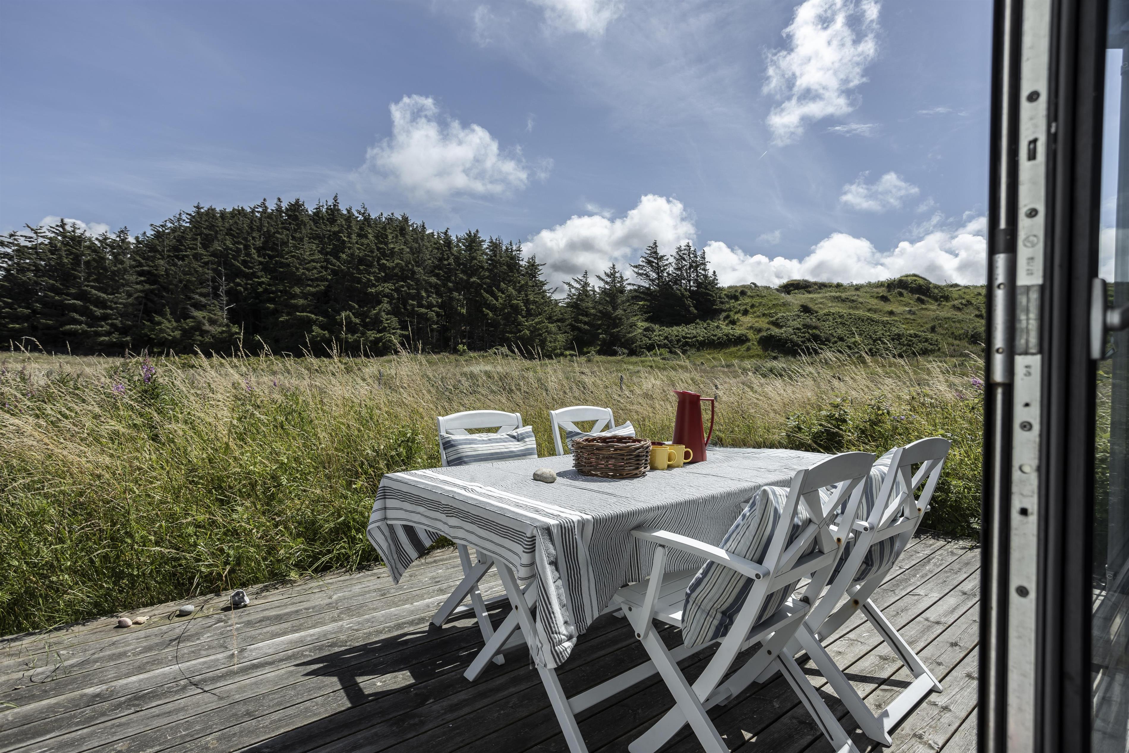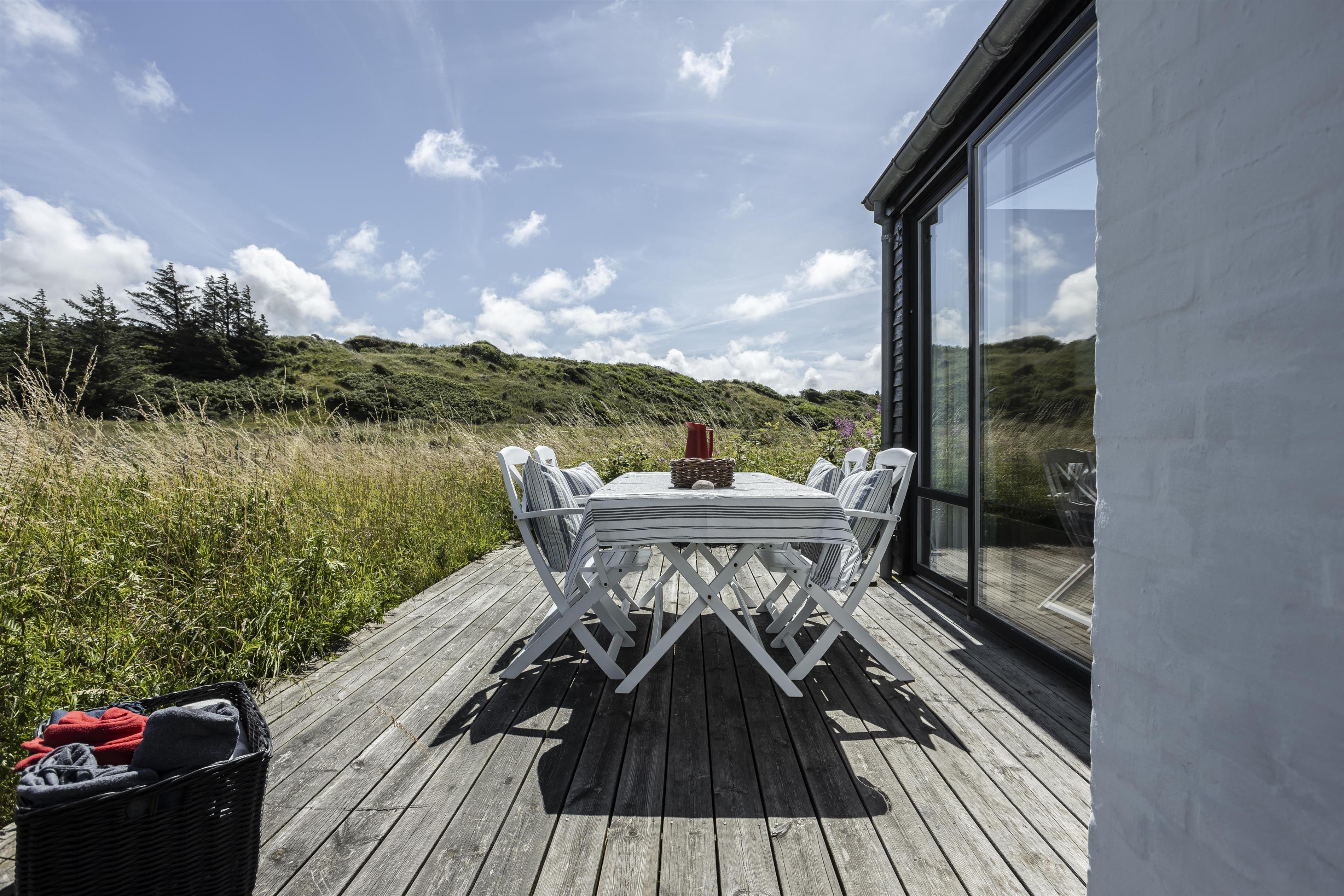 Sommerhuset grænser op til et stort, fredet område, og I kan ugeneret nyde ferien på terrassen og i haven. Udsigten til de brede vidder giver en følelse af ro og rummelighed, og der er desuden god mulighed for at se dyreliv på grunden – måske er I heldige at få øje på en hjort, en hare eller de mange fuglearter, der ofte færdes i området.