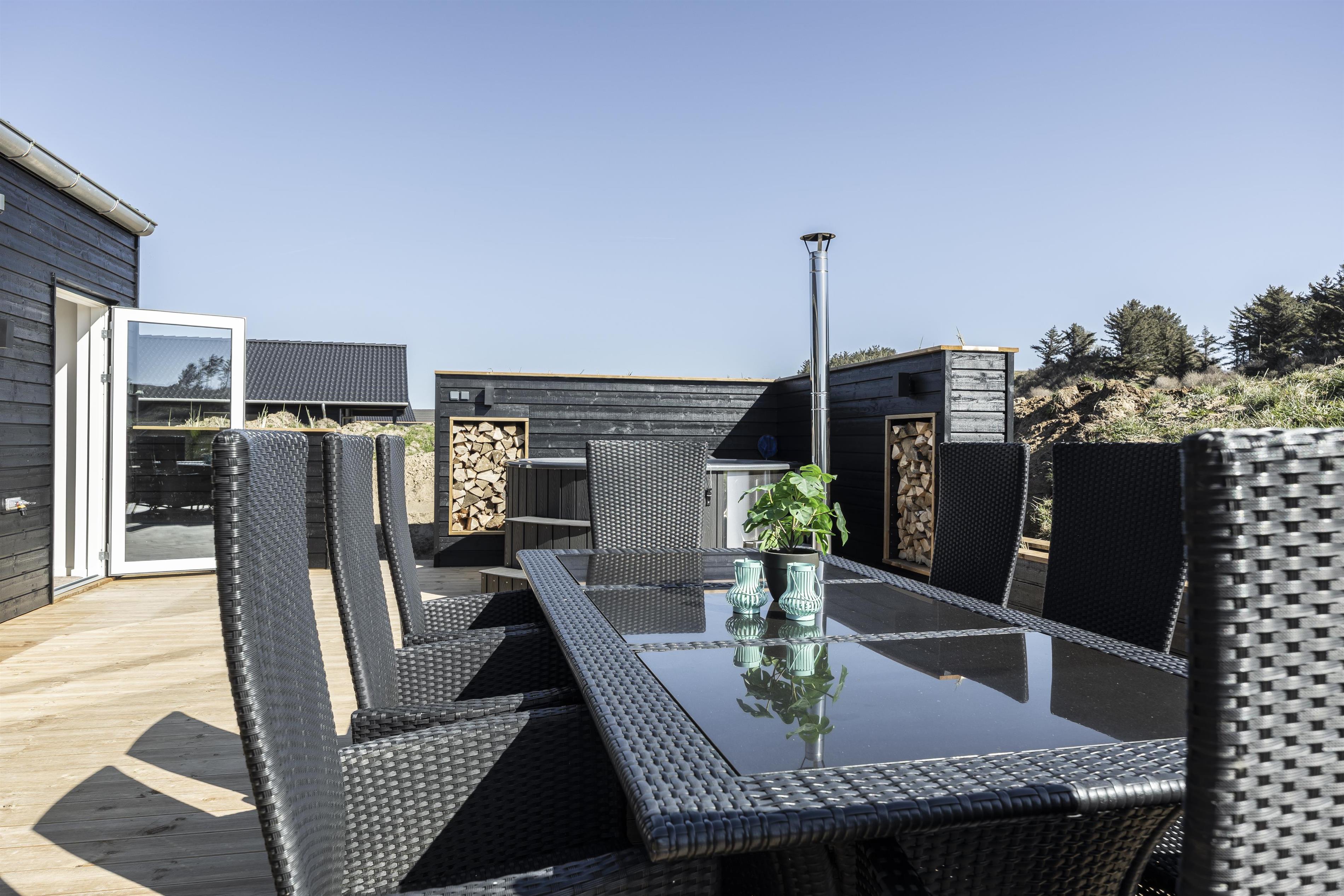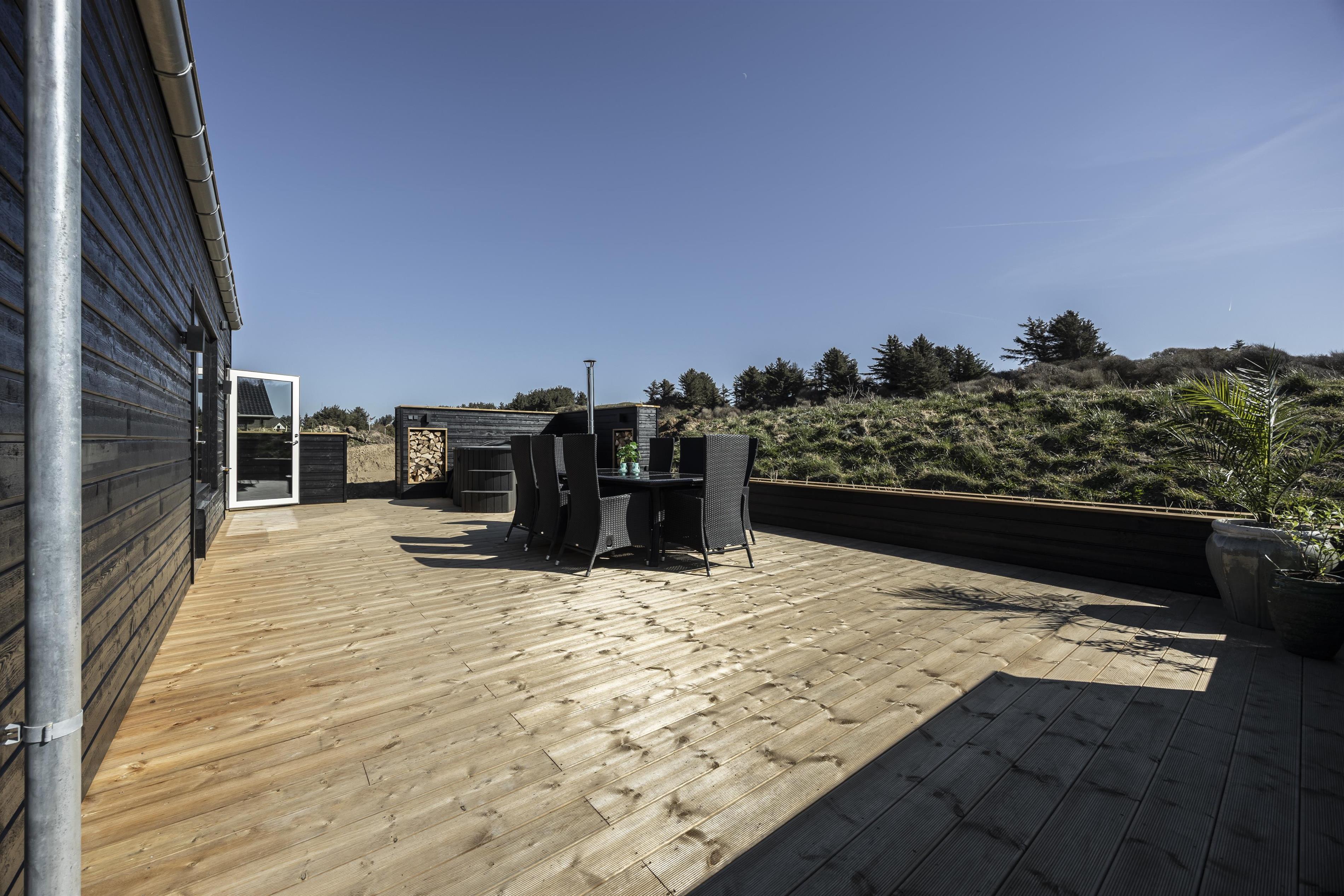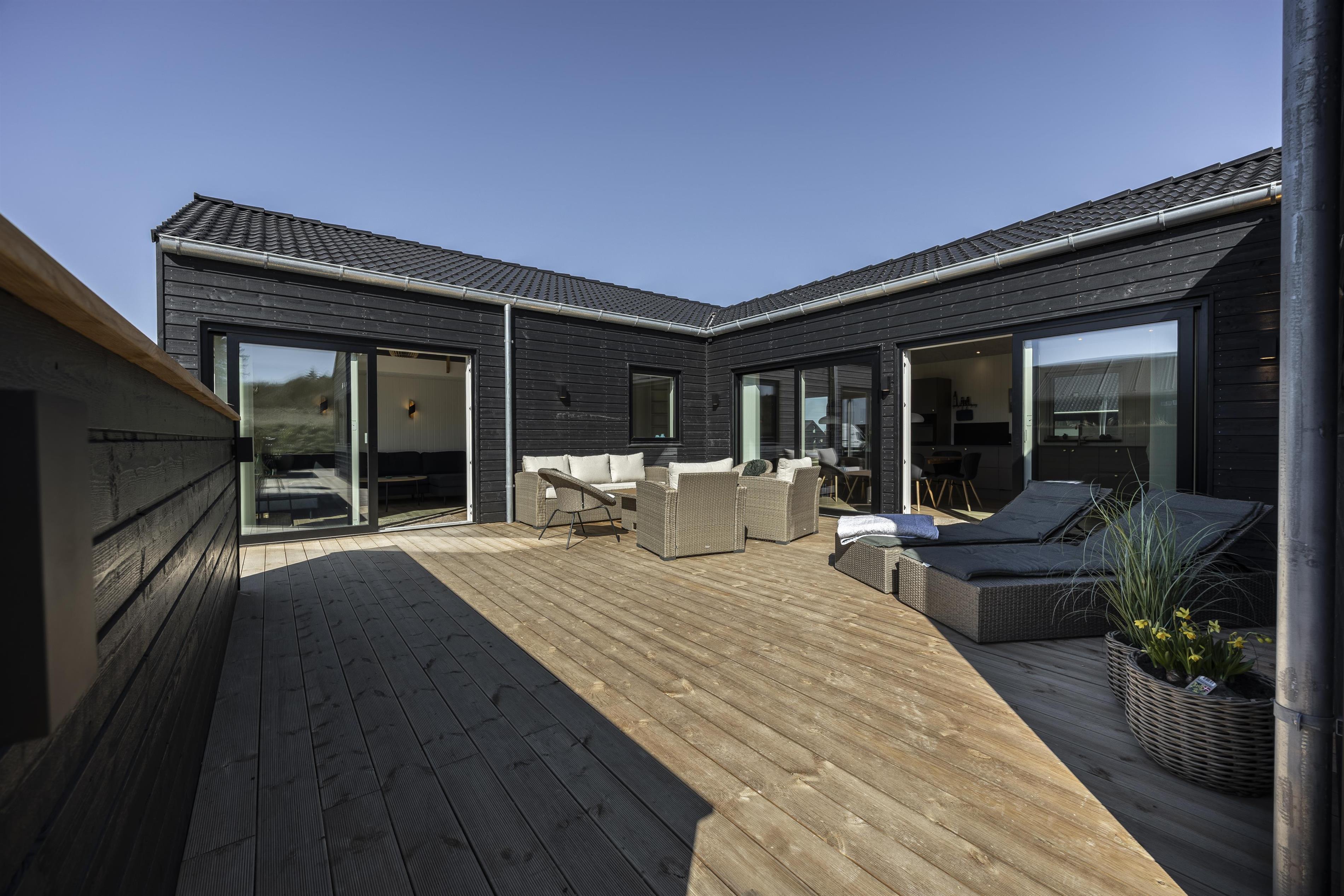 Skub de store skydedøre til side, og lad den friske brise fra Vesterhavet fylde rummet. Fra huset er der direkte adgang til flere dejlige og store terrasser, som omkranser det meste af sommerhuset. Start dagen på østsiden af huset og nyd en stille morgen med udsigt til de uspolerede indlandsklitter. Følg derefter solens stråler hele dagen og slut af i det bløde loungesæt. Terrasserne er ugenerede og indbyder til at nyde en god grillaften, mens solen stille går ned i horisonten.