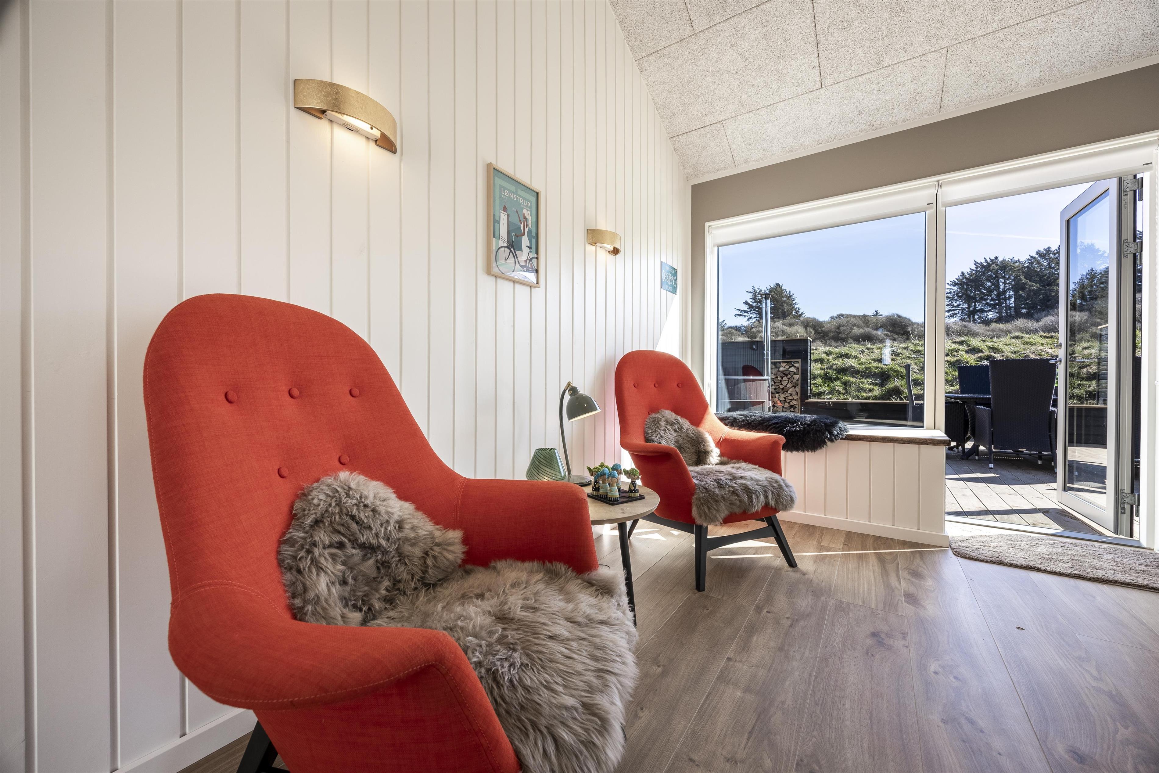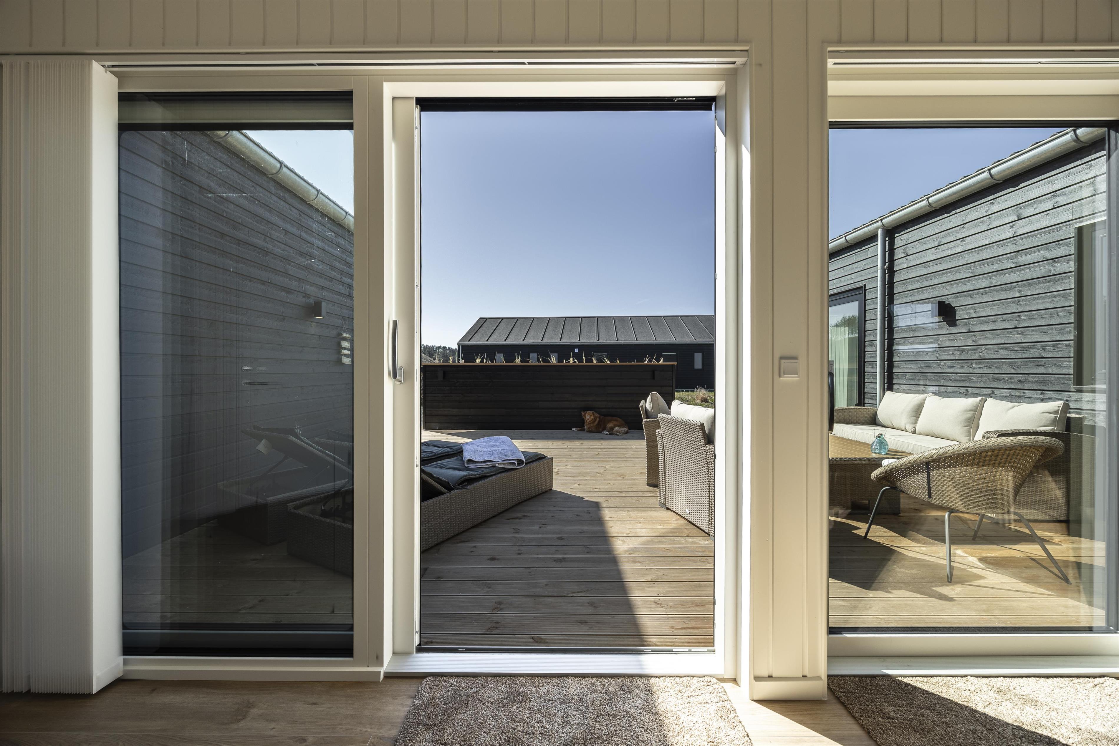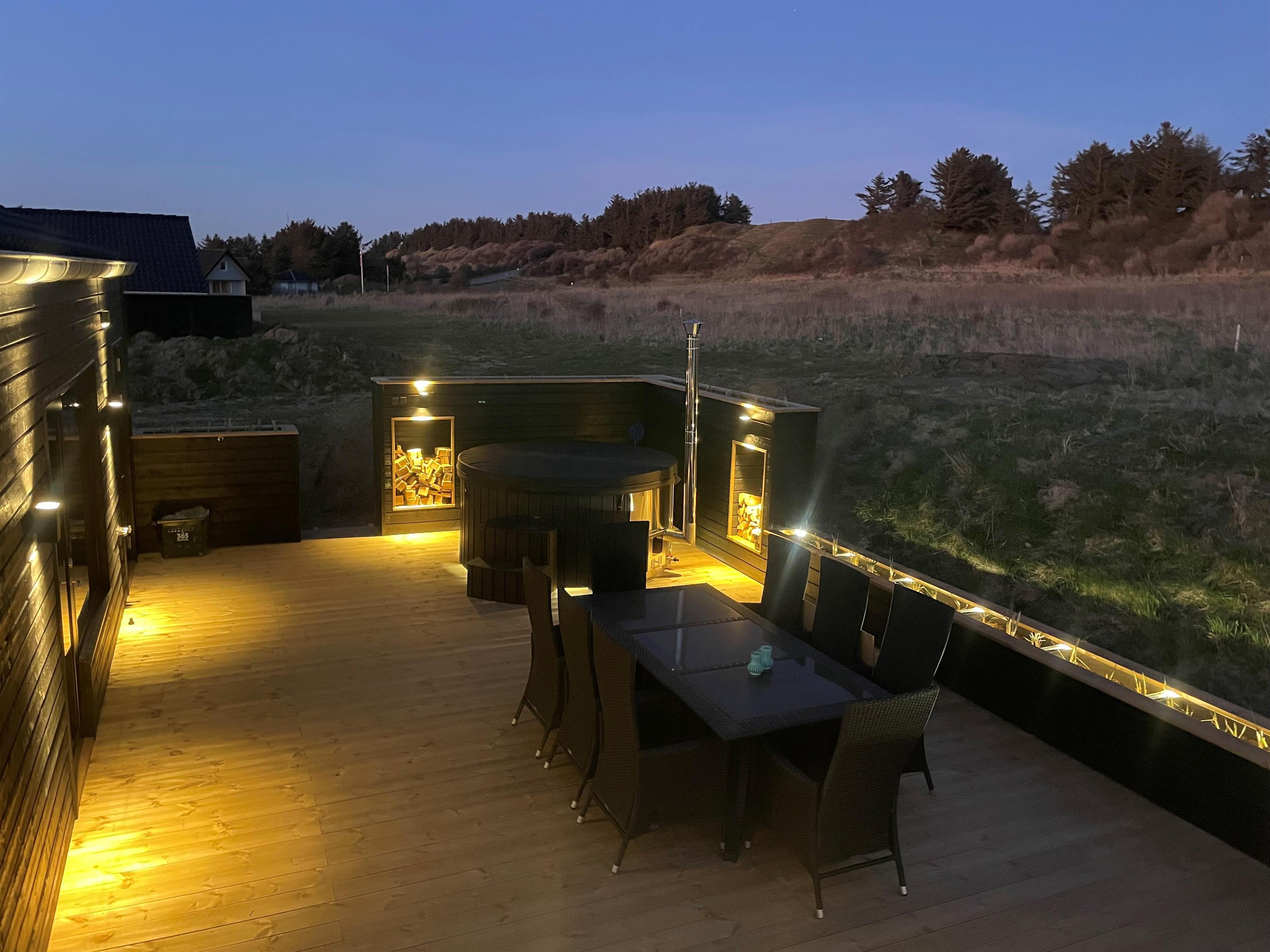 Skub de store skydedøre til side, og lad den friske brise fra Vesterhavet fylde rummet. Fra huset er der direkte adgang til flere dejlige og store terrasser, som omkranser det meste af sommerhuset. Start dagen på østsiden af huset og nyd en stille morgen med udsigt til de uspolerede indlandsklitter. Følg derefter solens stråler hele dagen og slut af i det bløde loungesæt. Terrasserne er ugenerede og indbyder til at nyde en god grillaften, mens solen stille går ned i horisonten.