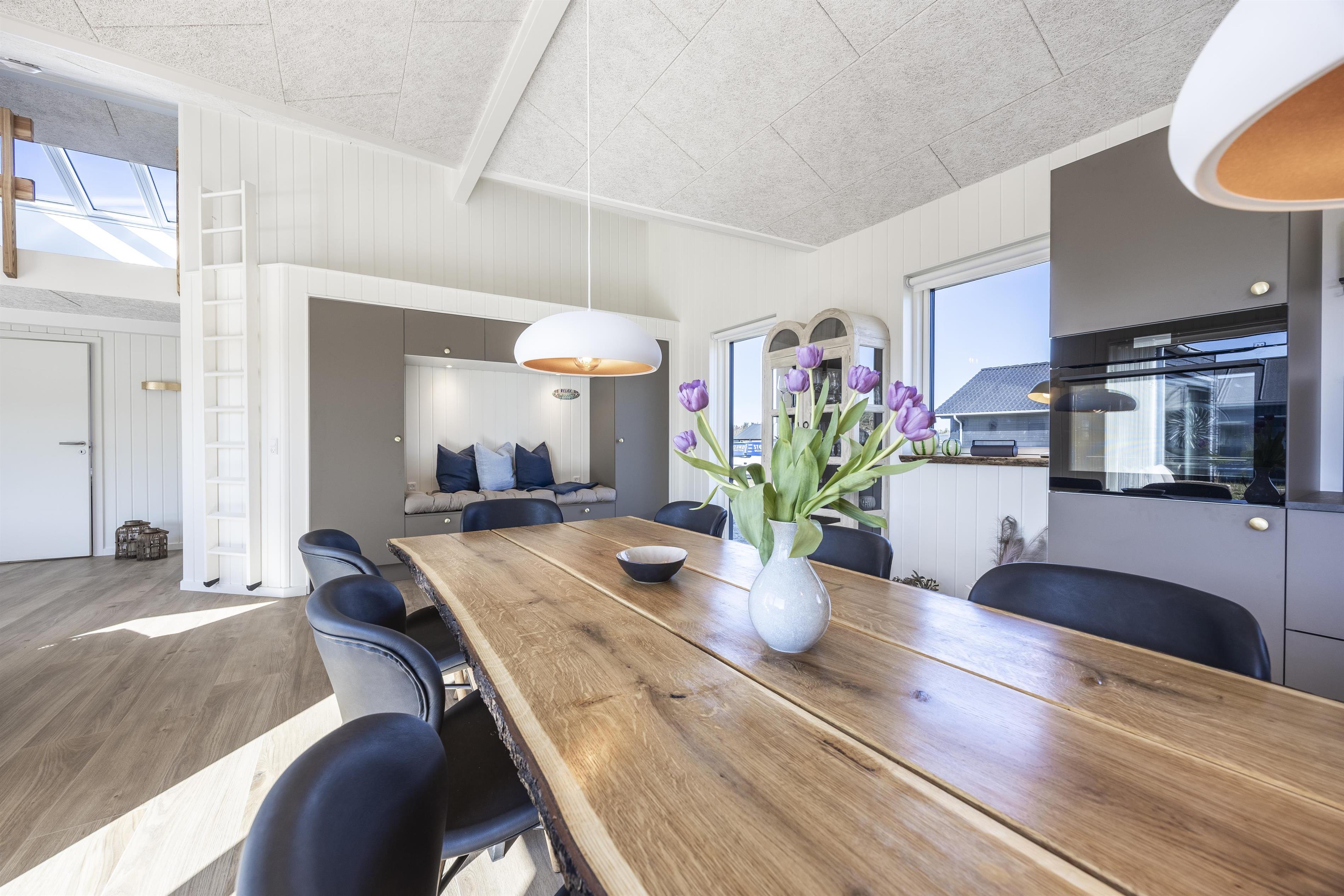 Huset byder på plads til op til 10 personer og er ideelt til både den store familie eller flere generationer, der ønsker at holde ferie sammen ved den jyske vestkyst. De lyse og rummelige opholdsrum skaber en indbydende atmosfære, hvor hygge og samvær er i fokus. Køkkenet er moderne og fuldt udstyret, hvilket gør det let at tilberede måltider i fællesskab.