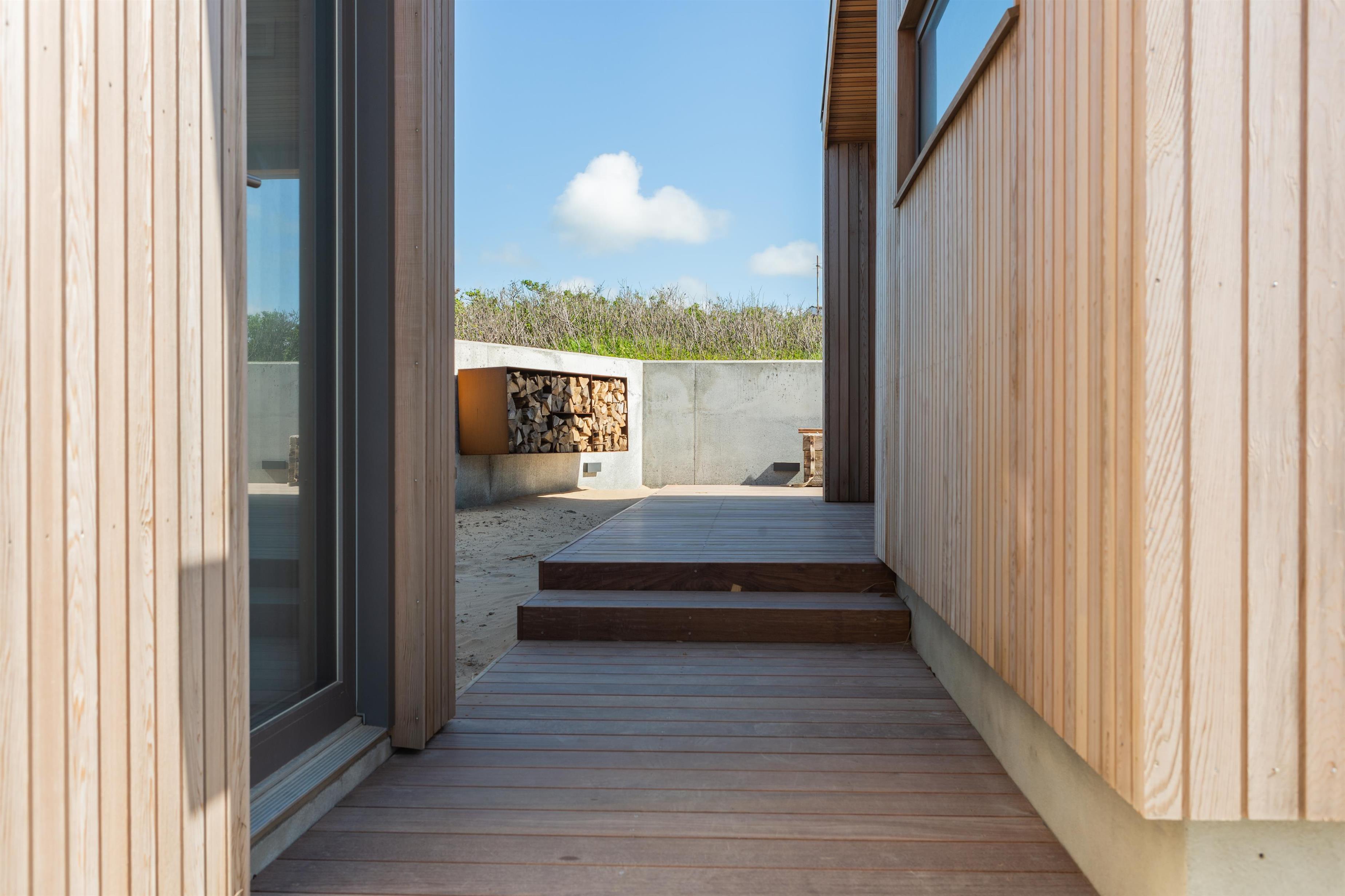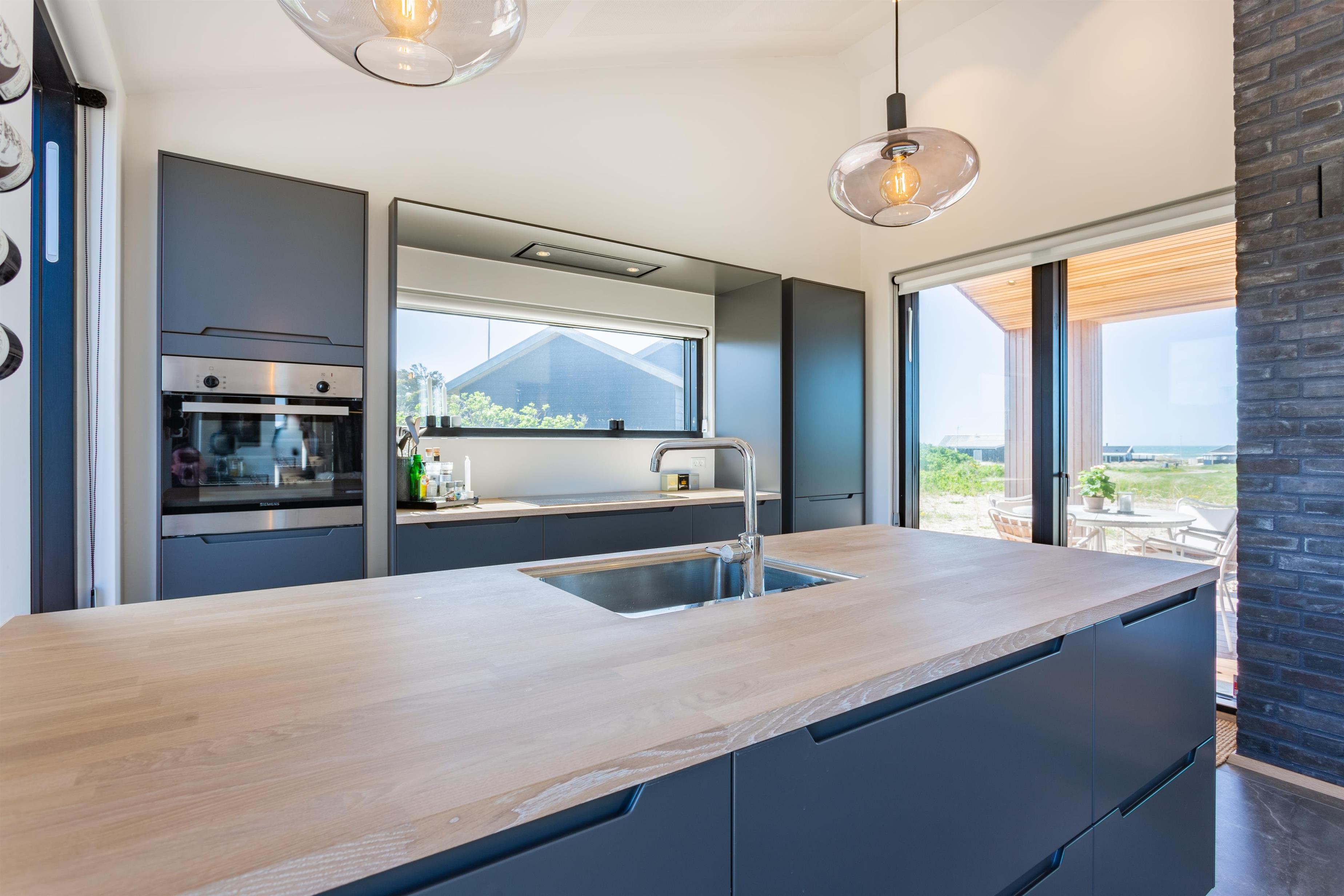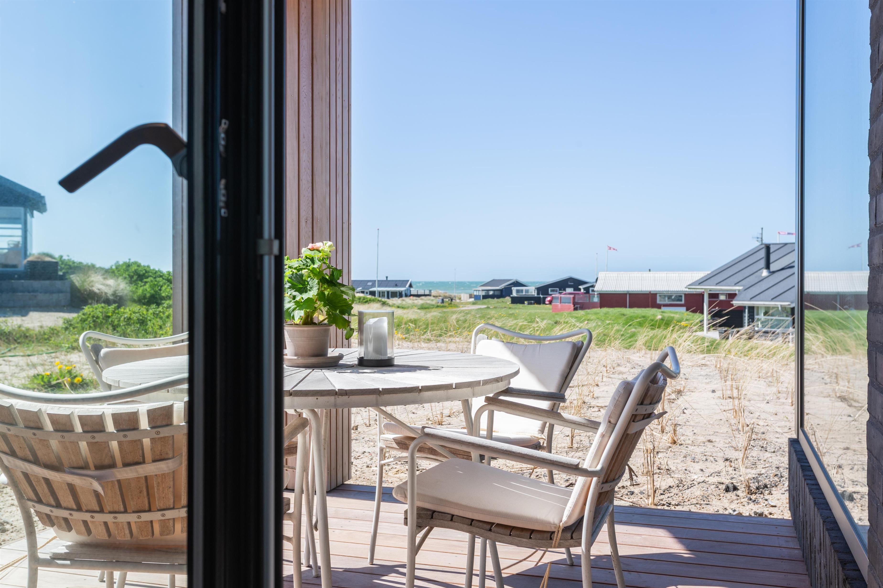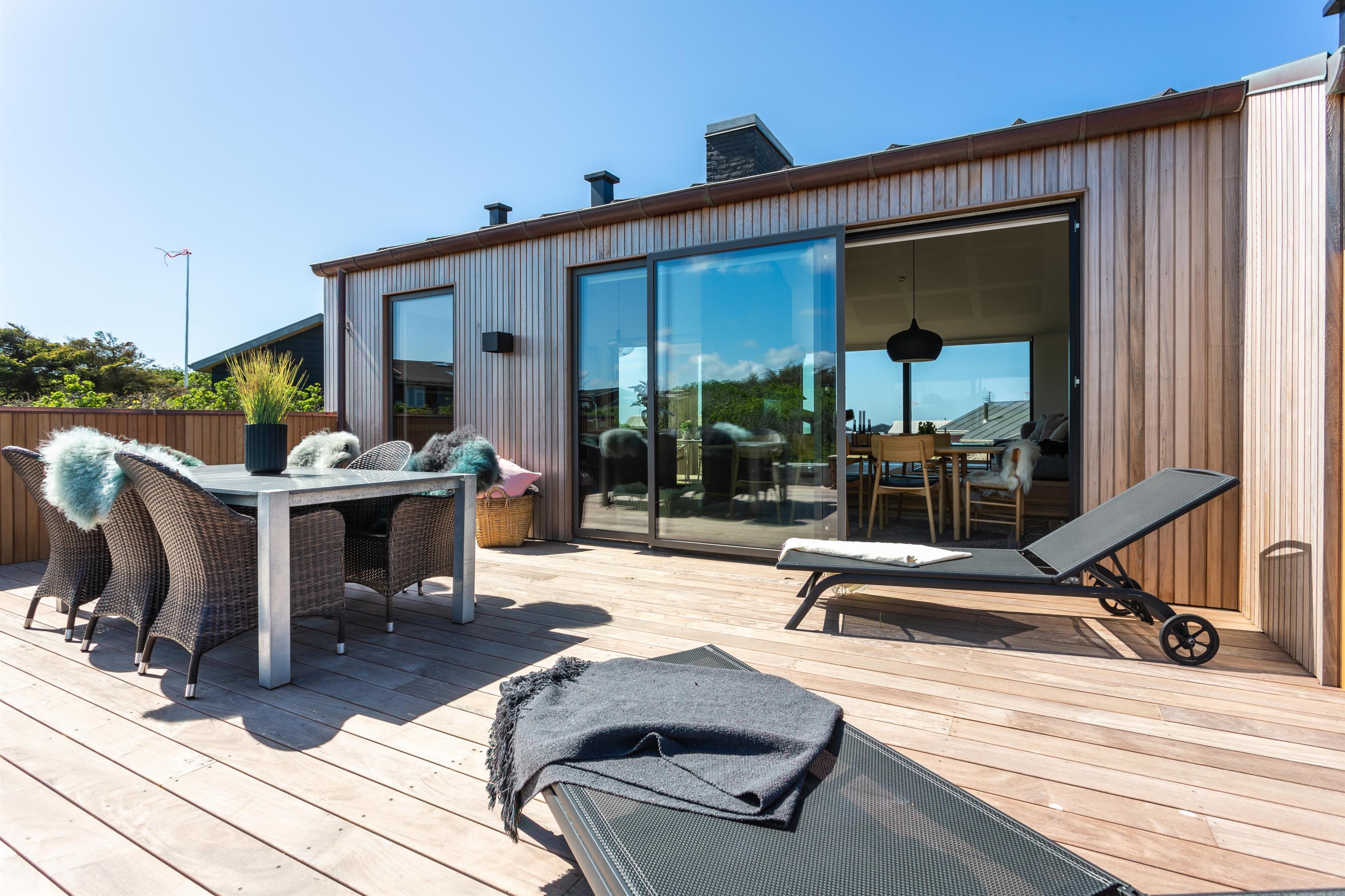 Udsigten kan bestemt også nydes, når I sidder ude i det fri. Her er der flere terrasser at vælge imellem, så I kan slå jer ned på den allermest solrige og læfyldte plet uanset tidspunktet. Nyd for eksempel morgenkaffen med udsigt til det smukke vesterhav, eller find grillen frem og nyd en grillaften i det fri på en lun sommeraften. Udenfor finder I også en skøn og afskærmet udebruser, som kan benyttes året rundt. Den er desuden praktisk efter en dag på stranden.