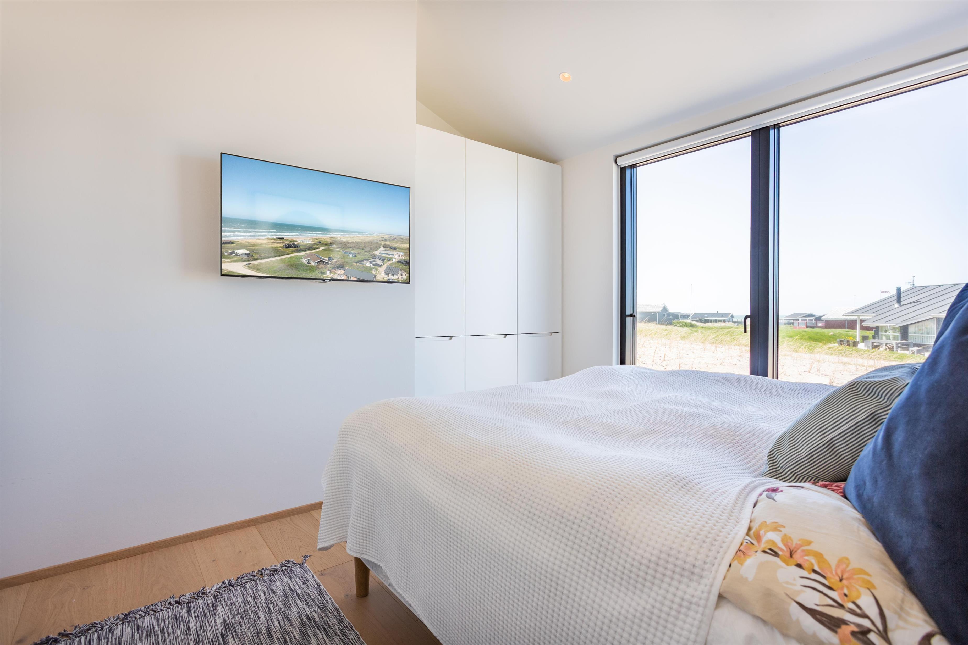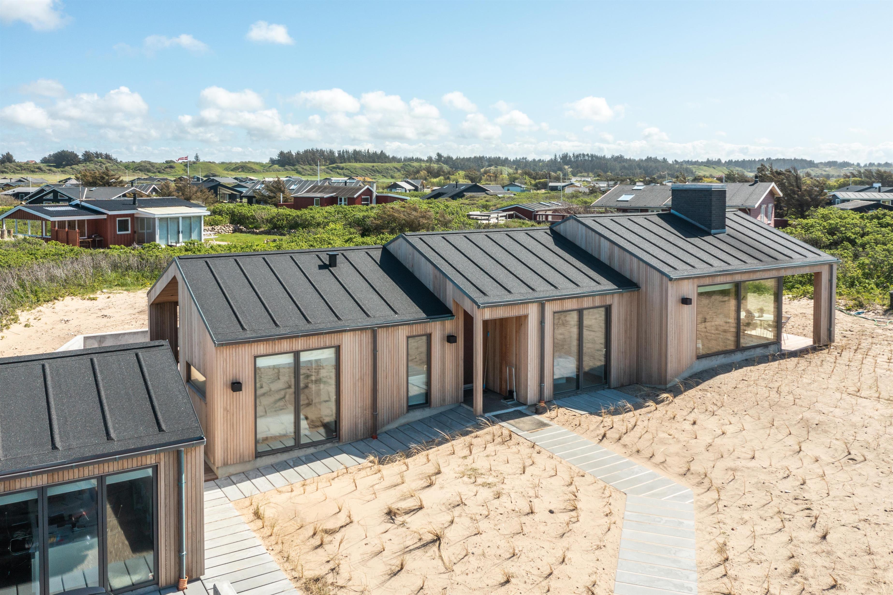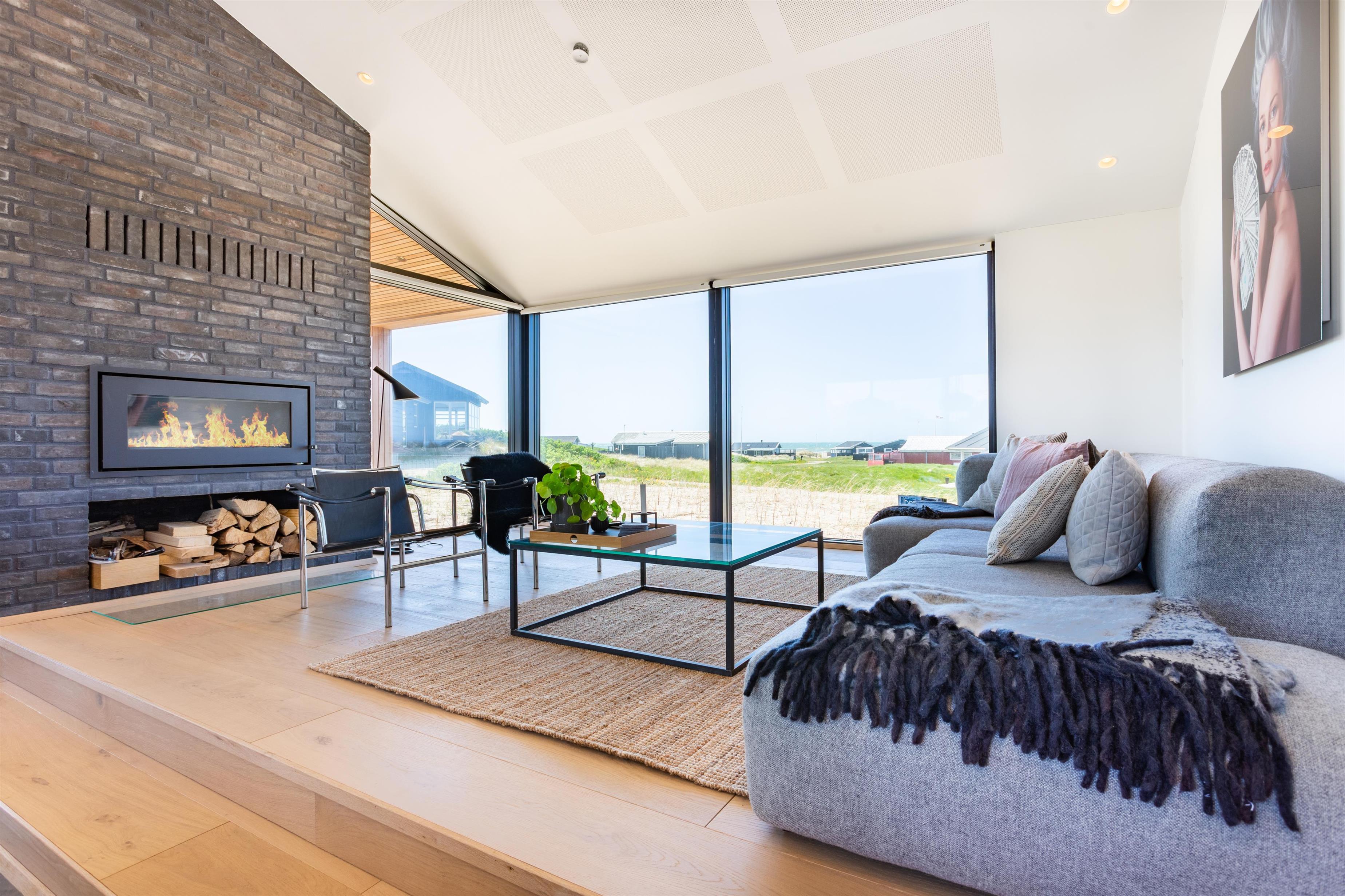 Huset skiller sig ud fra mængden med sin elegante arkitektur og særdeles smagfulde indretning. Komforten er der også tænkt på, idet I eksempelvis kan slænge jer på behagelige dobbeltsenge i alle tre soveværelser. Man træder som det første ind i sommerhusets brede entré, hvorfra der er adgang til de 3 soveværelser samt 2 lækre badeværelser. Man kan straks fornemme, at det er et spændende hus, hvor der er gjort meget ud af detaljerne. En trappe fører fra entreen op til husets hjerte, nemlig stuen og køkkenet, som ligger i åben forbindelse med hinanden. Overalt er der et skønt lysindfald fra de store panoramavinduer. Det store, højloftede opholdsrum er et skønt sted at samles, når der er duftende gryder i køkkenafdelingen, film på fladskærmen og ild i brændeovnen. Fra huset har I en fantastisk udsigt ud over det naturskønne sommerhusområde med Vesterhavet i baggrunden. En mindre hems er også en hyggelig tilføjelse til planløsningen.