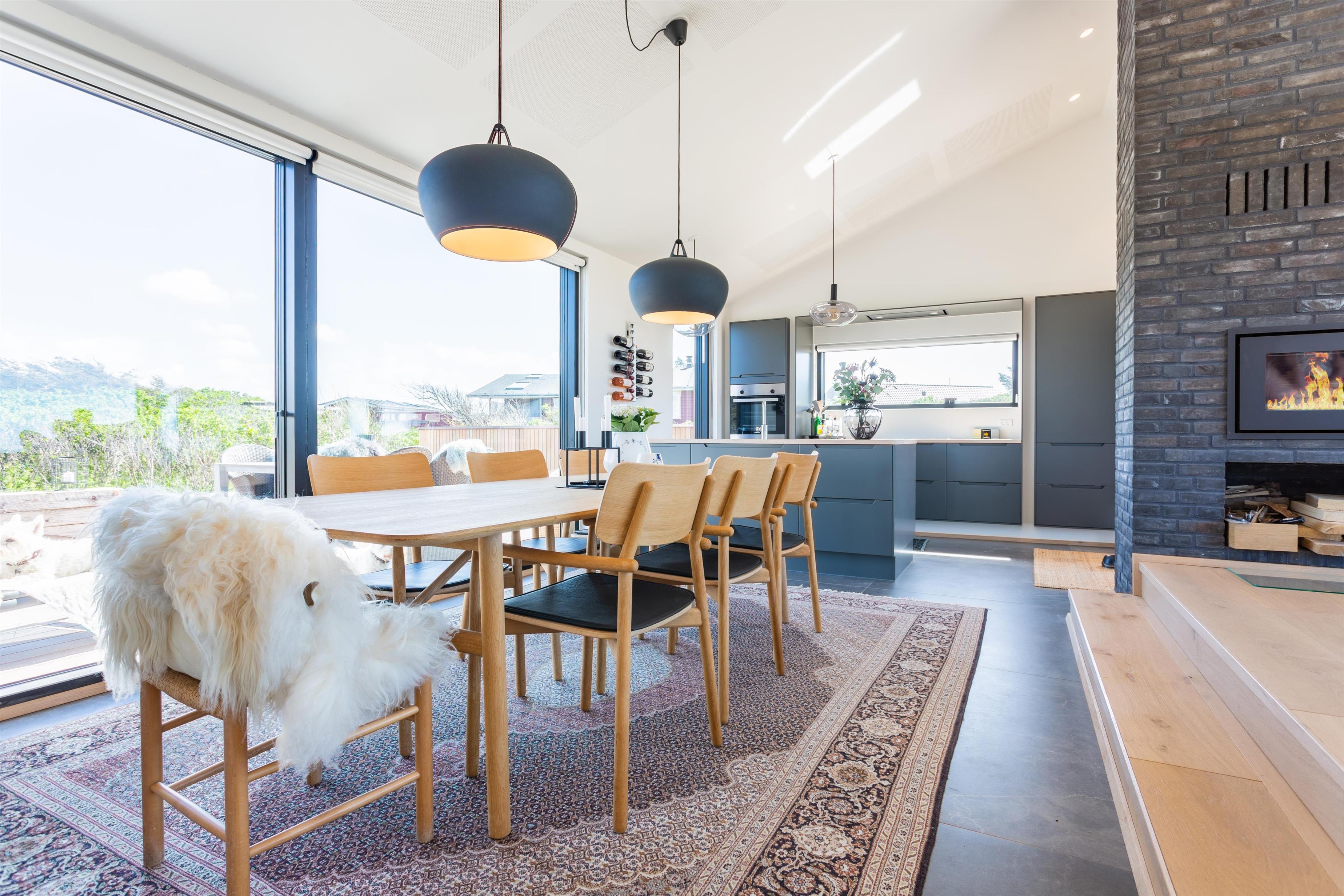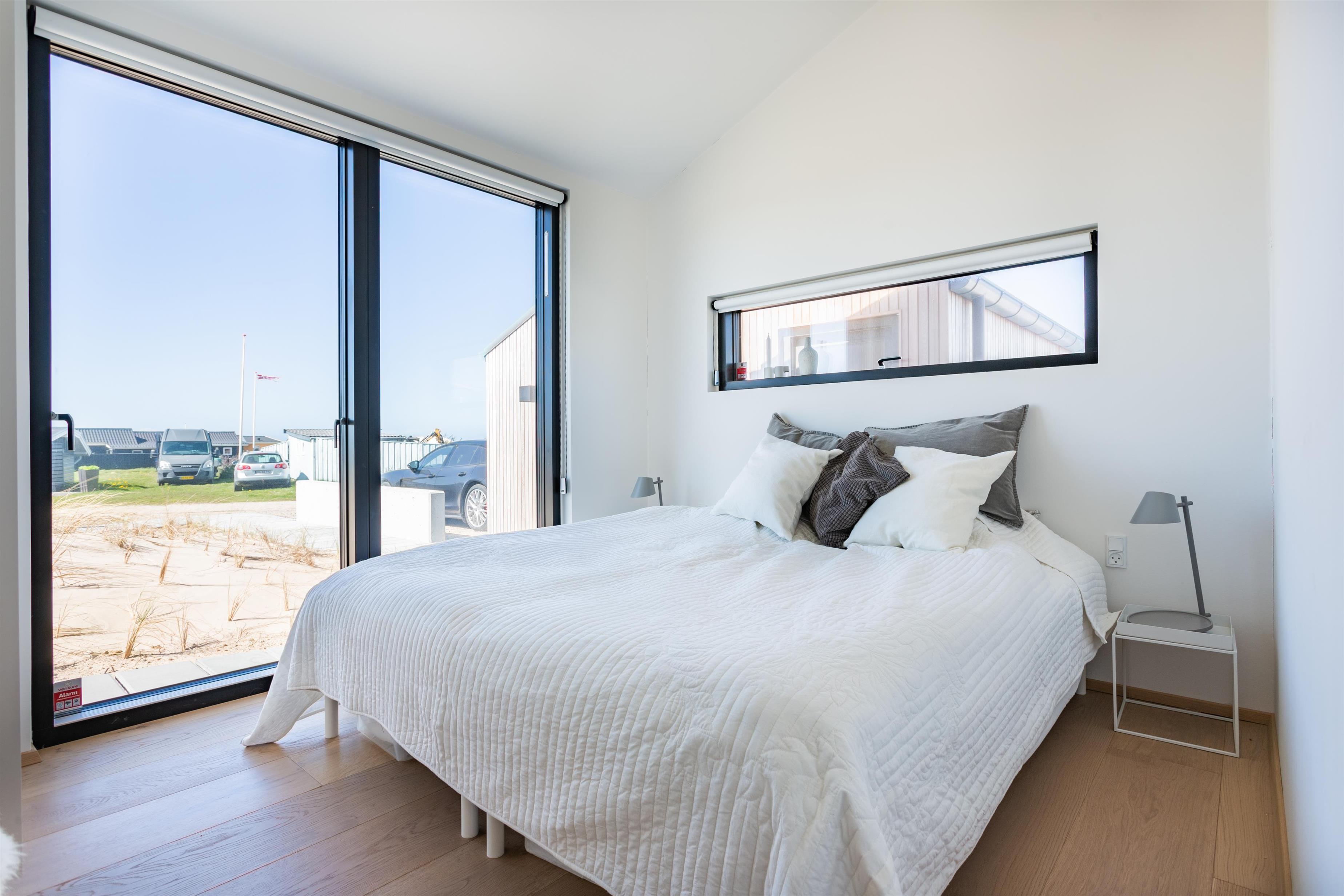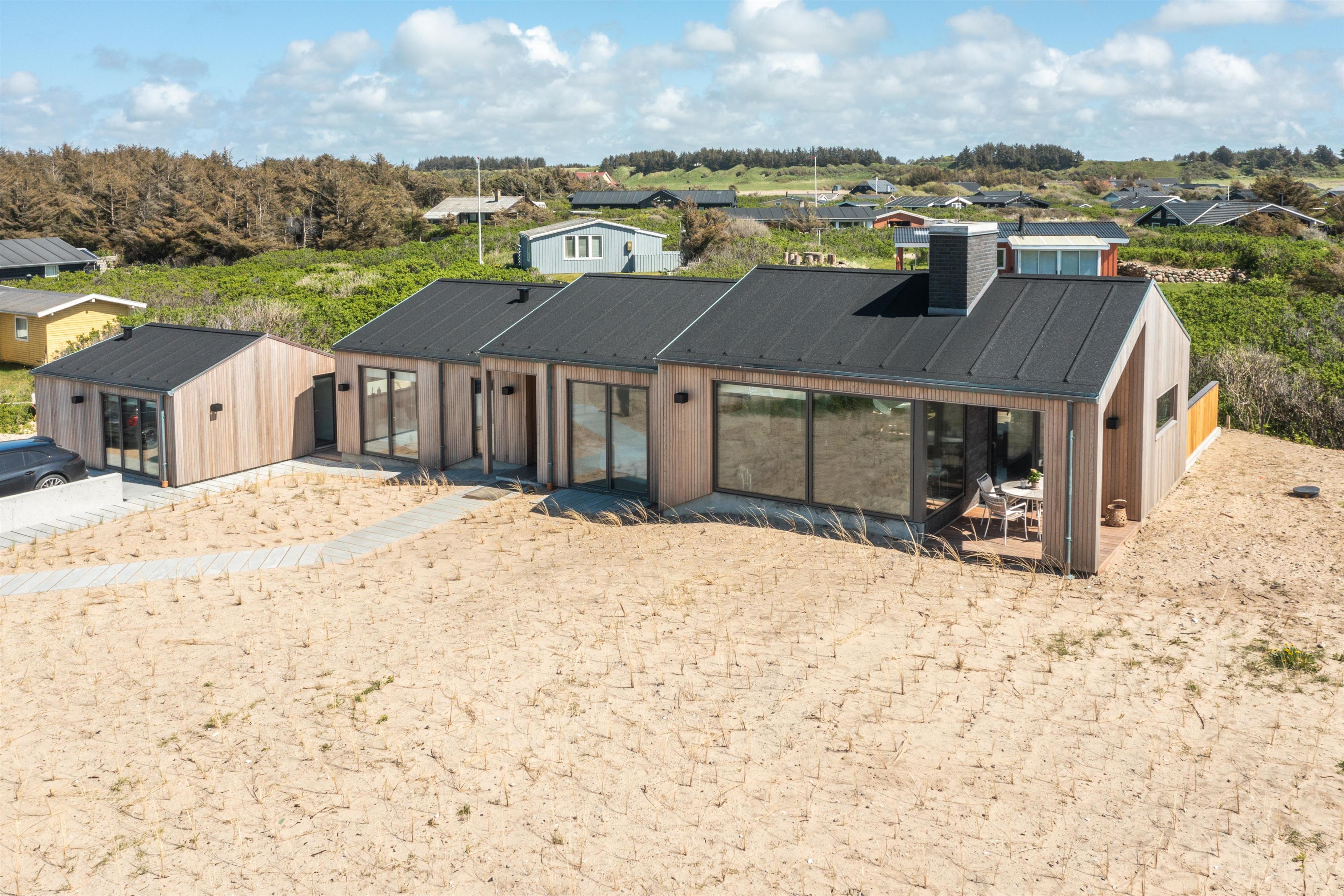Huset skiller sig ud fra mængden med sin elegante arkitektur og særdeles smagfulde indretning. Komforten er der også tænkt på, idet I eksempelvis kan slænge jer på behagelige dobbeltsenge i alle tre soveværelser. Man træder som det første ind i sommerhusets brede entré, hvorfra der er adgang til de 3 soveværelser samt 2 lækre badeværelser. Man kan straks fornemme, at det er et spændende hus, hvor der er gjort meget ud af detaljerne. En trappe fører fra entreen op til husets hjerte, nemlig stuen og køkkenet, som ligger i åben forbindelse med hinanden. Overalt er der et skønt lysindfald fra de store panoramavinduer. Det store, højloftede opholdsrum er et skønt sted at samles, når der er duftende gryder i køkkenafdelingen, film på fladskærmen og ild i brændeovnen. Fra huset har I en fantastisk udsigt ud over det naturskønne sommerhusområde med Vesterhavet i baggrunden. En mindre hems er også en hyggelig tilføjelse til planløsningen.