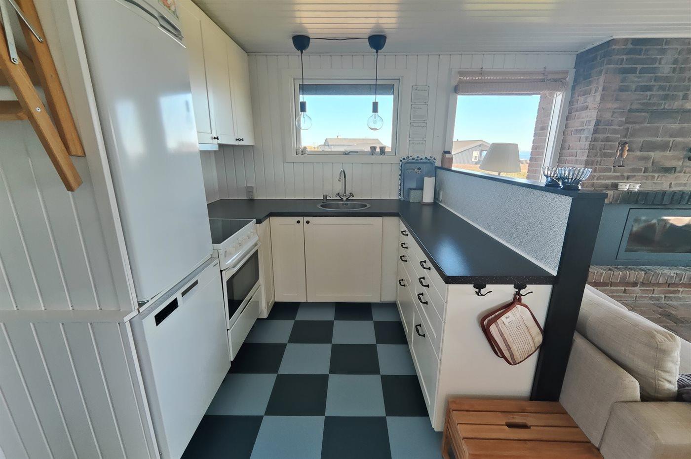 Køkkenet er udstyret med 1 køleskab. Der er 4 keramiske kogeplader, varmluftovn samt opvaskemaskine.