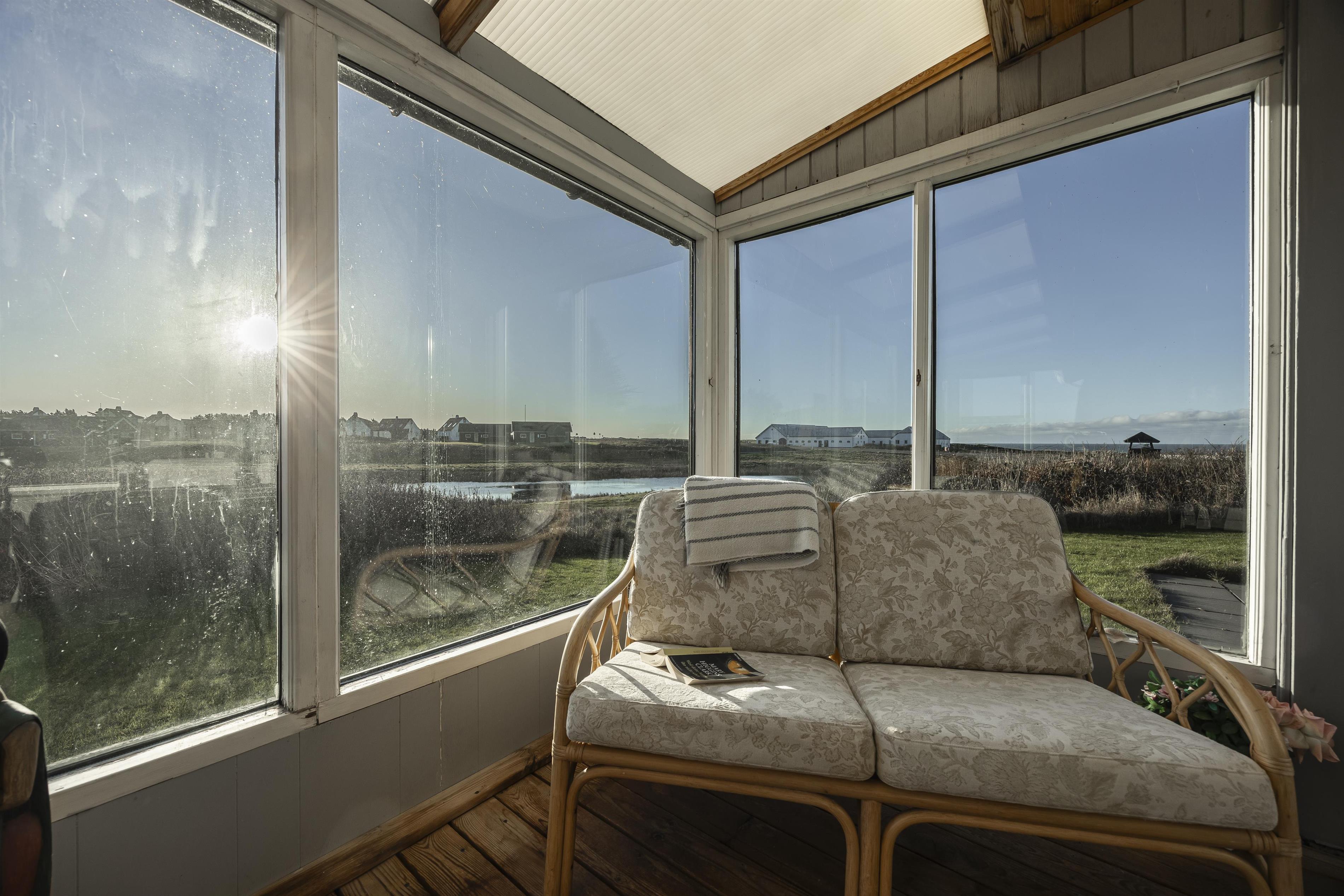 Huset byder desuden på en udestue, hvorfra man også kan nyde udsigten både til hav og sø - tag kaffen med derud både i det tidlige forår eller efterår, hvor der er lunt, når solen skinner.