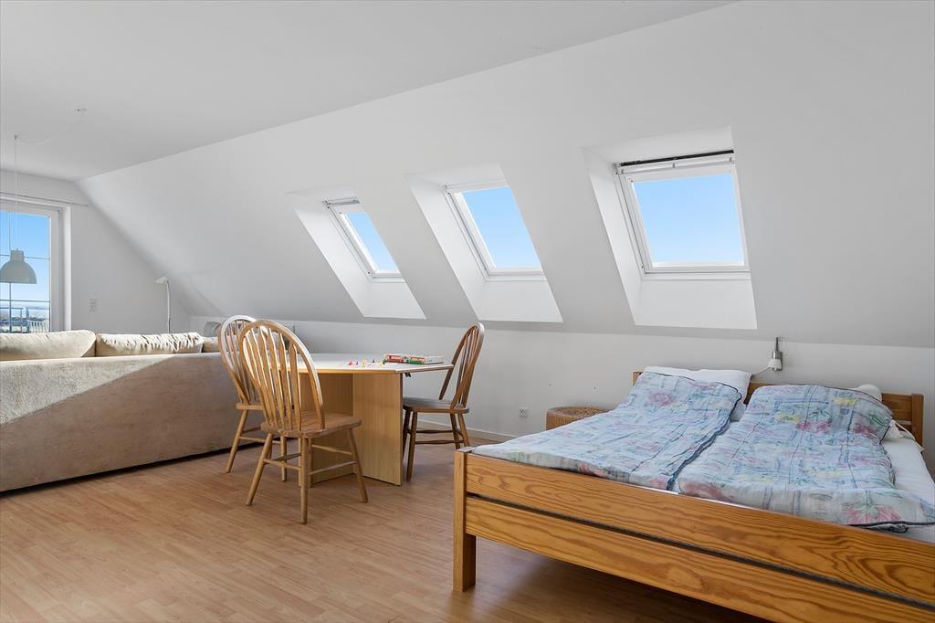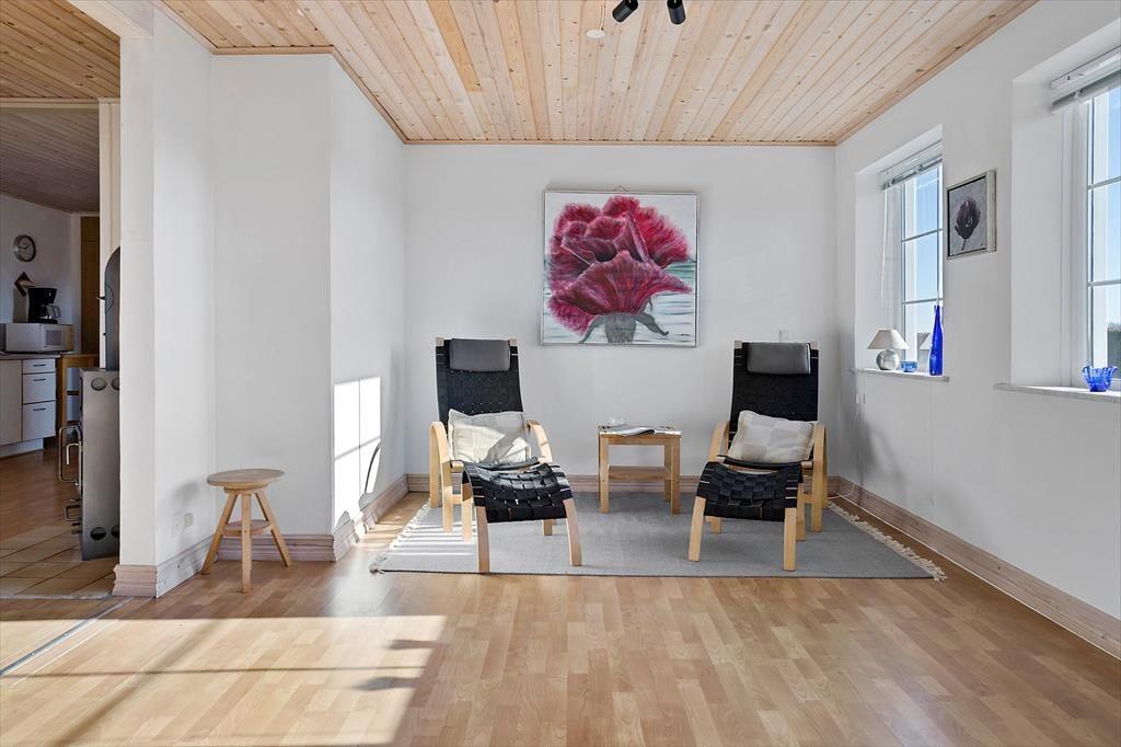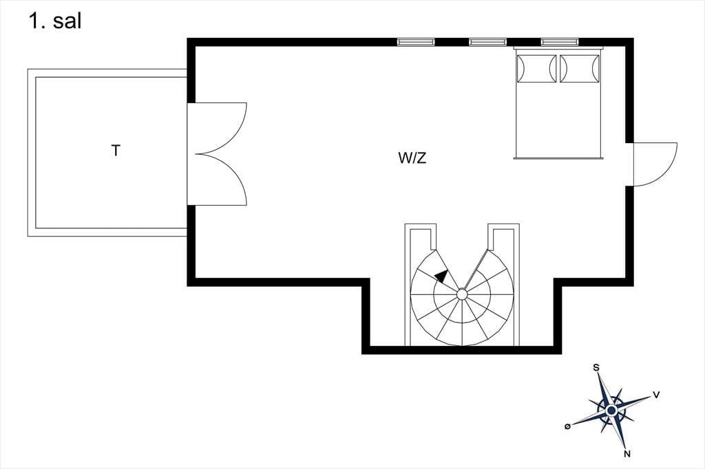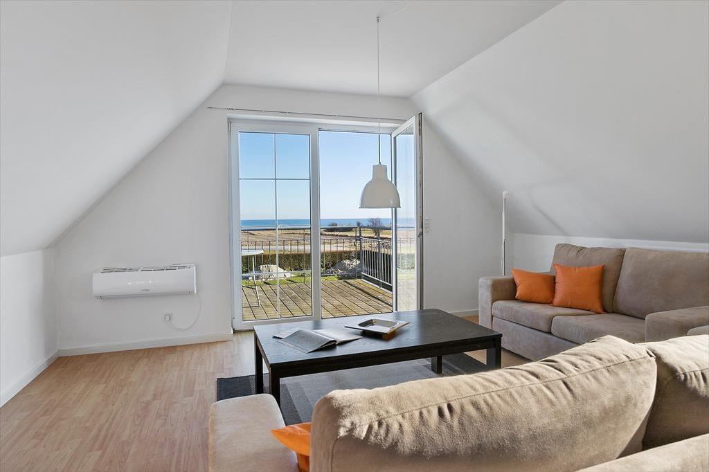 I fordelingsgangen er der en vindeltrappe op til første sal, hvor der er et dejligt disponibelt samlingsrum. På første sal er yderligere en dobbeltseng med sovepladser til to personer. I samlingsrummet er en sofa og bordplads, så det er perfekt at samles her til mange hyggelige timer og spille et spil sammen eller læse en bog. Du kan nyde lysindfaldet fra skråvinduerne og udsigten til havet via den store terrassedør ud til den østvendte altan. Fra altanen kan du nyde den smukke udsigt til havet og kysten med solopgange.