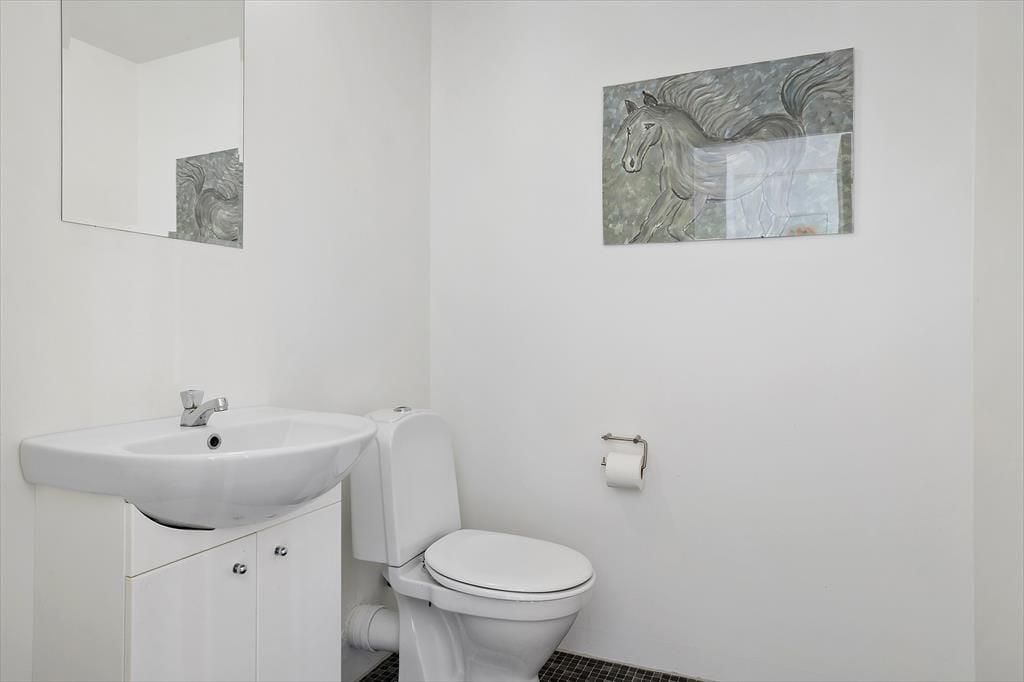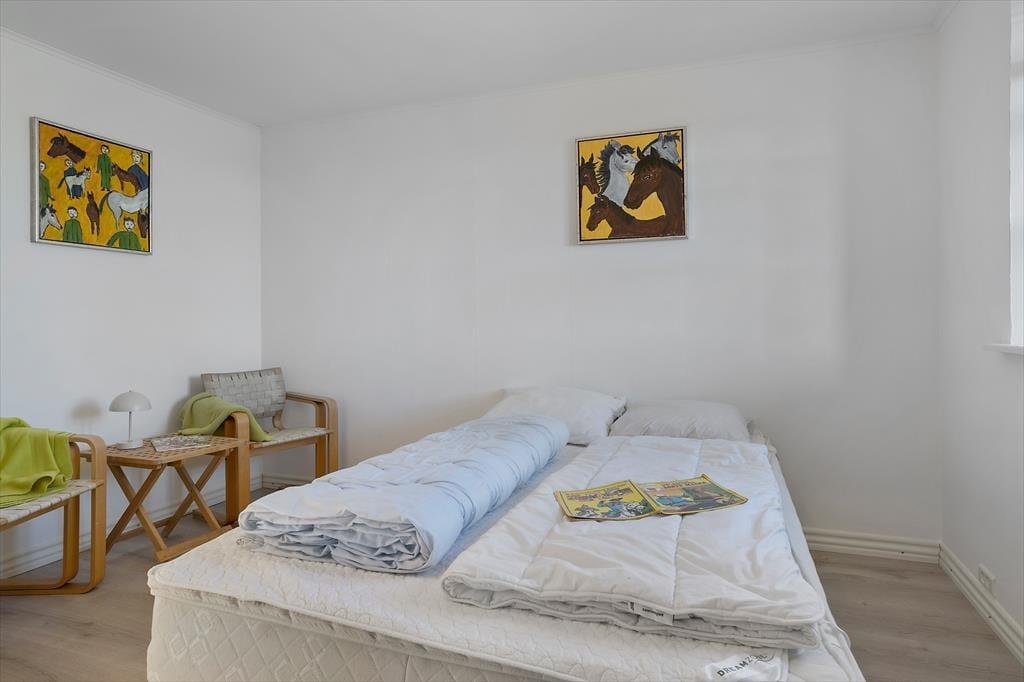 Ved siden af køkkenet er et soveværelse med en komfortabel dobbeltseng. Fra køkkenet er der også adgang til en fordelingsgang med endnu et fint toilet uden bad, samt to soveværelser mere.