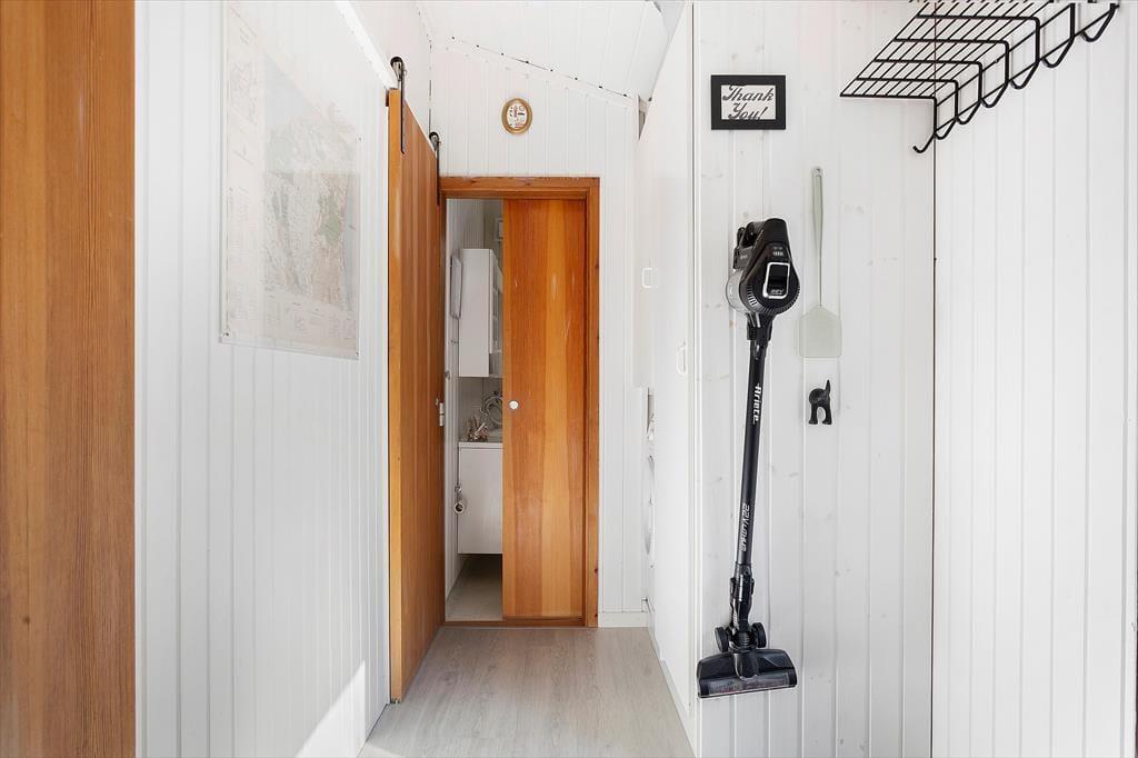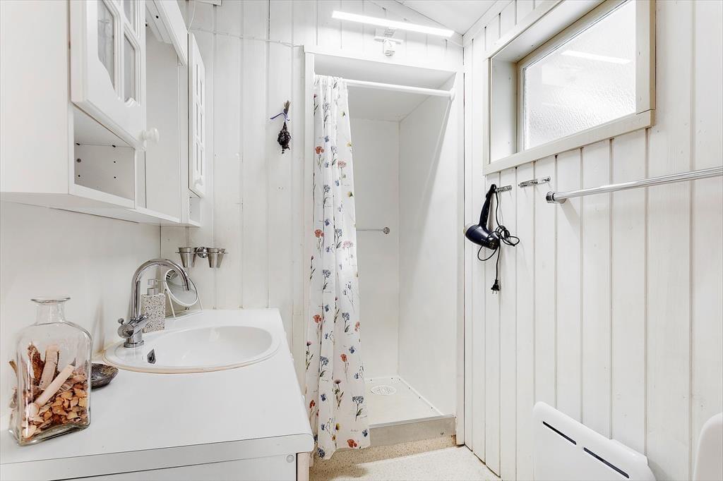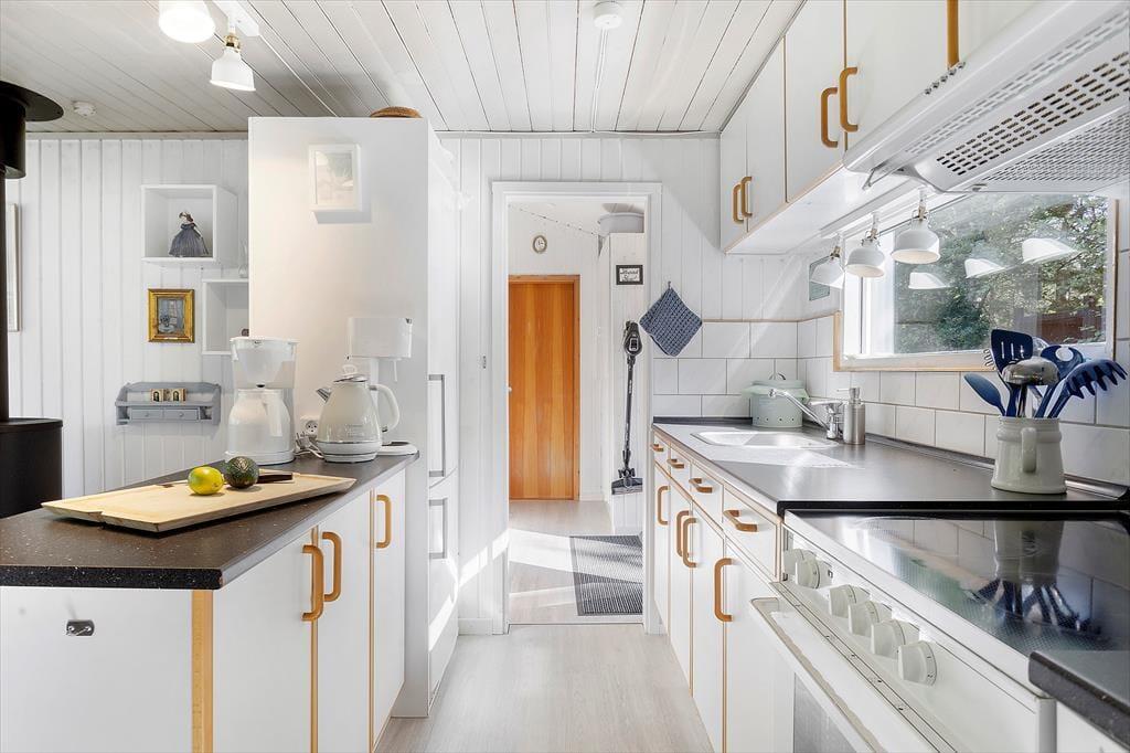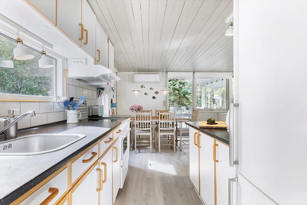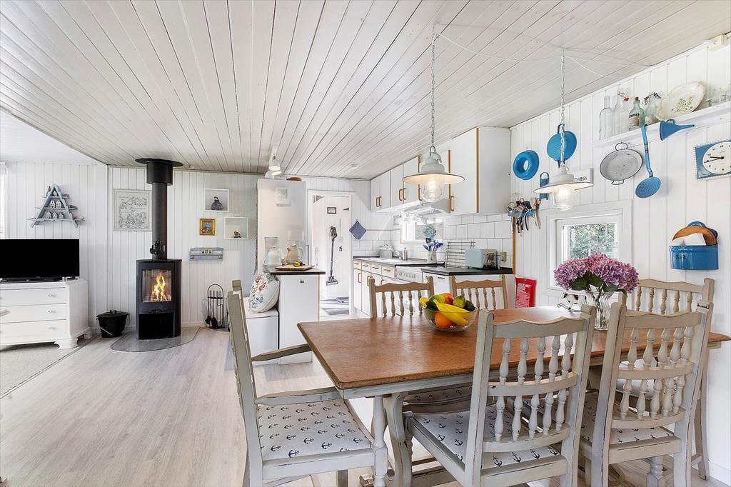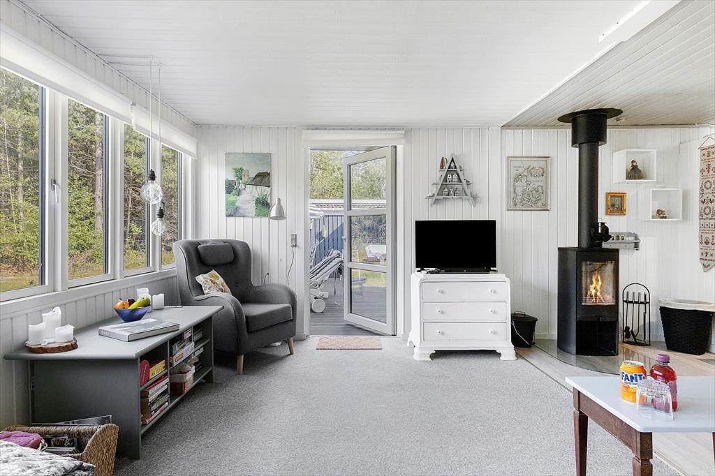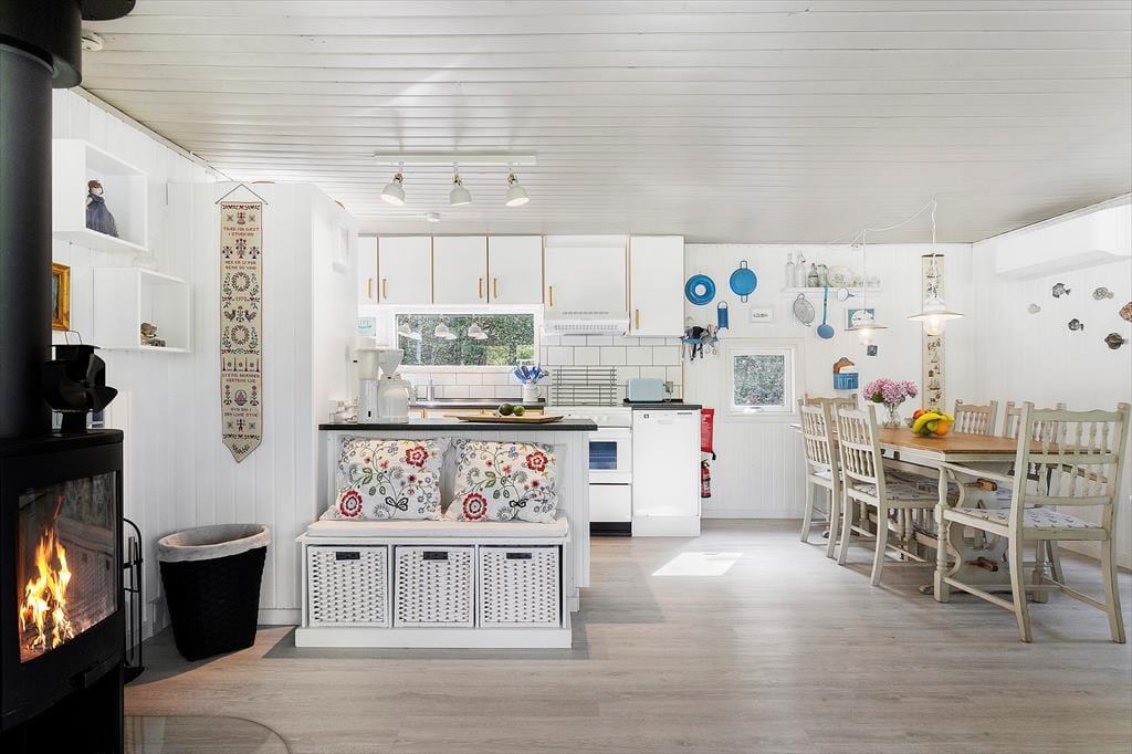 Indendørs møder du en lys og venlig stemning, hvor rummene bærer præg af den enkle charme, der kendetegner et klassisk dansk sommerhus. Det store vinduesparti i stuen lukker dagslyset ind og inviterer naturens rolige farver med helt indenfor. Her kan I samles omkring spisebordet til morgenmad, kortspil eller en god snak, mens brændeovnen knitrer i baggrunden og spreder sin varme på kølige aftener. Det er det perfekte sted at nyde en kop varm kakao efter en blæsende strandtur eller at finde ro med en bog, mens vinden rasler i trætoppene udenfor. Det uformelle udtryk og de rolige farver skaber en stemning af nærvær og ferie, hvor man har tid til bare at være sammen – uden forstyrrelser og hverdagens trummerum.