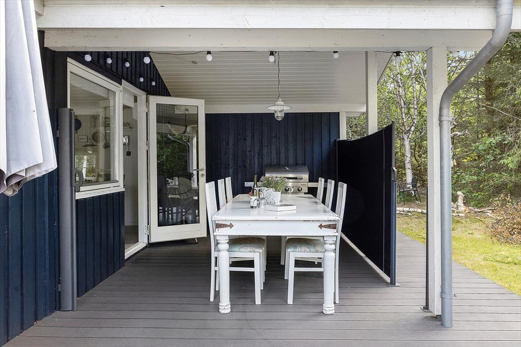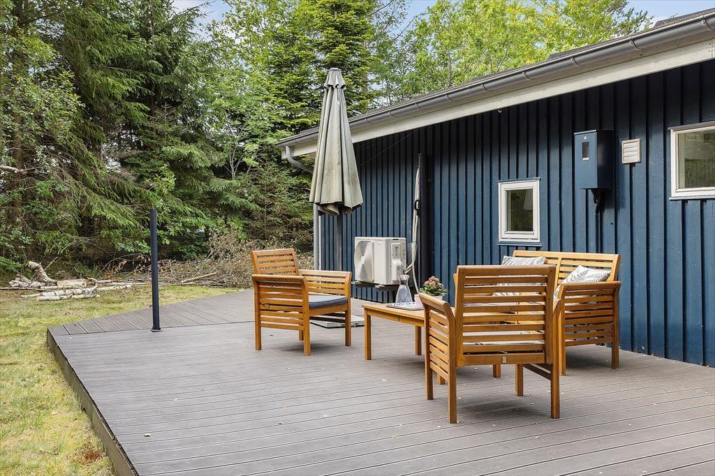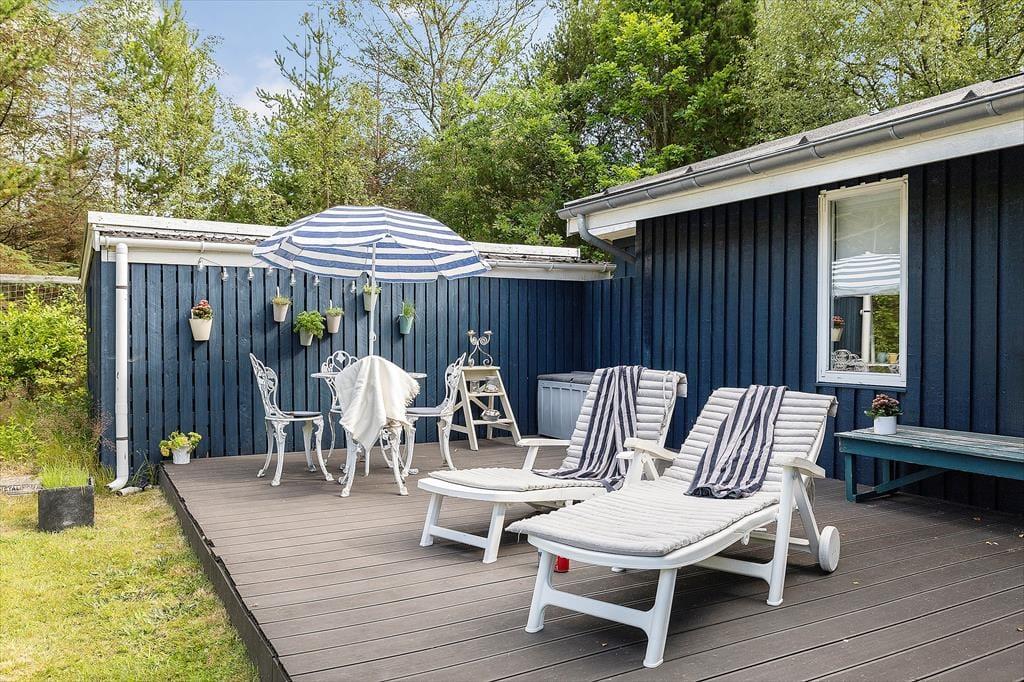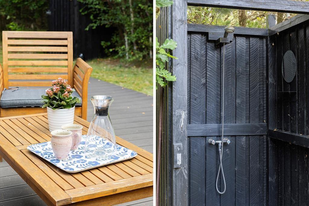 Udendørs venter en stor og ugeneret naturgrund, hvor både børn og hunde kan boltre sig frit. En stor del af grunden er indhegnet, hvilket giver tryghed og frihed, særligt hvis du har firbenede familiemedlemmer med på ferie. Her kan hundene trygt gå på opdagelse, mens børnene spiller bold på plænen eller bygger huler mellem træerne. Der er flere dejlige terrasseområder omkring huset, hvor du kan finde både sol og skygge alt efter humør og tidspunkt på dagen. Nyd formiddagskaffen i fred og ro, dæk op til aftensmad i det fri – og afslut dagen under åben himmel, mens du skyller sand og salt af kroppen i den skønne udendørs bruser med både koldt og varmt vand. Det er ferie, når det er bedst – enkel, afslappet og tæt på naturen.