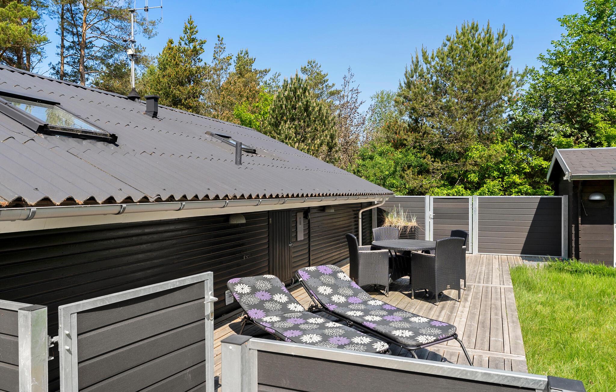 På den solrige terrasse kan I nyde den fredfyldte atmosfære med morgenmad. lad batterierne op på liggestolen, mens børnene leger i den afskærmede have, og find sammen omkring bålstedet om aftenen for at bage brød på pinde.