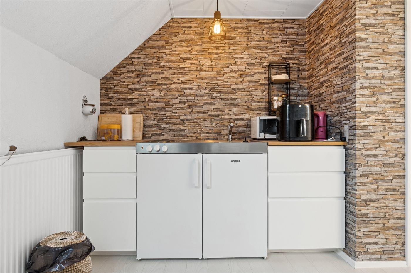 Køkkenet er udstyret med 1 køleskab. Der er 2 elkogeplader, mikrobølgeovn, Airfryer.