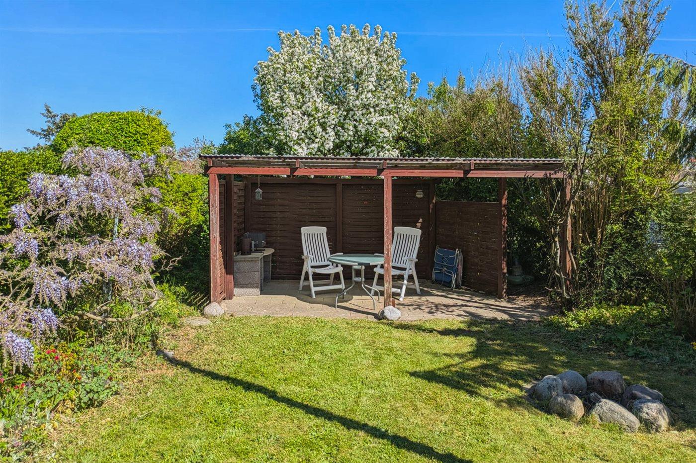 For enden af udestuen finder man en hævet træterrasse, der virkelig indbyder til frokost eller eftermiddagskaffen - derfra kan man have et øje på børnene, der leger i den fredelige have.