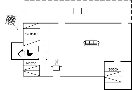 Der er i alt 3 soveværelser. Sovepladserne fordeler sig på: 4 sovepladser i dobbeltsenge. 2 sovepladser i enkeltsenge.