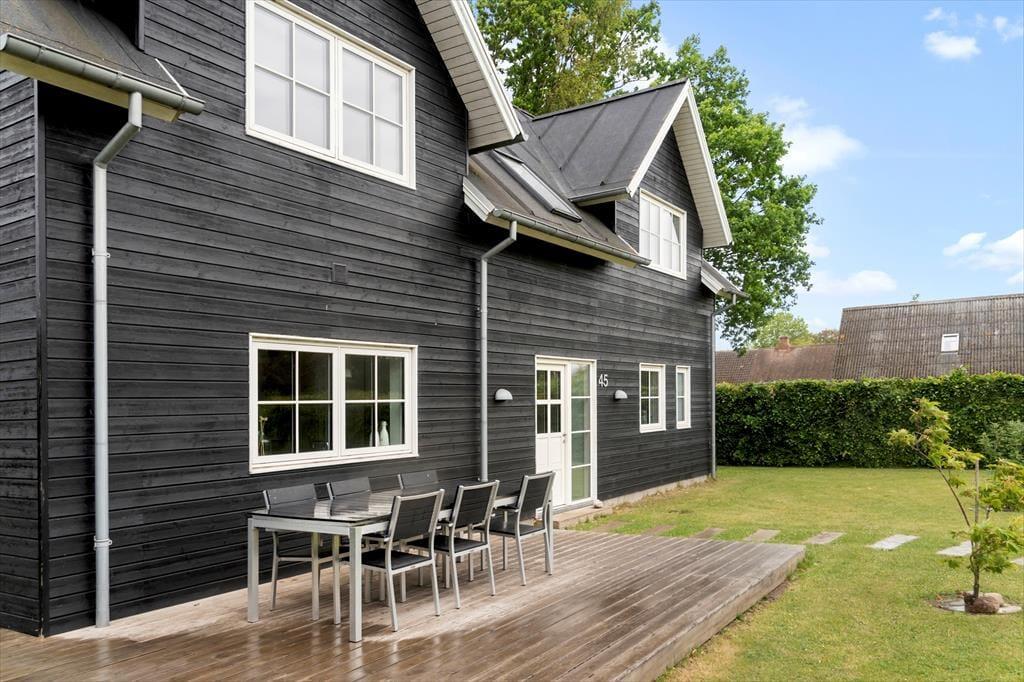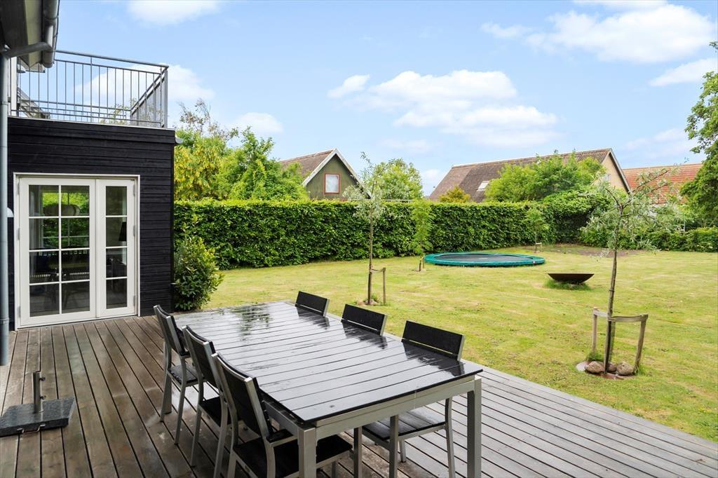 På husets øst- og sydvendte side ligger en god terrasse – ideel til morgenkaffen og eftermiddagssolen. Her kan I også tænde op i grillen og nyde de dejlige sommeraftener.