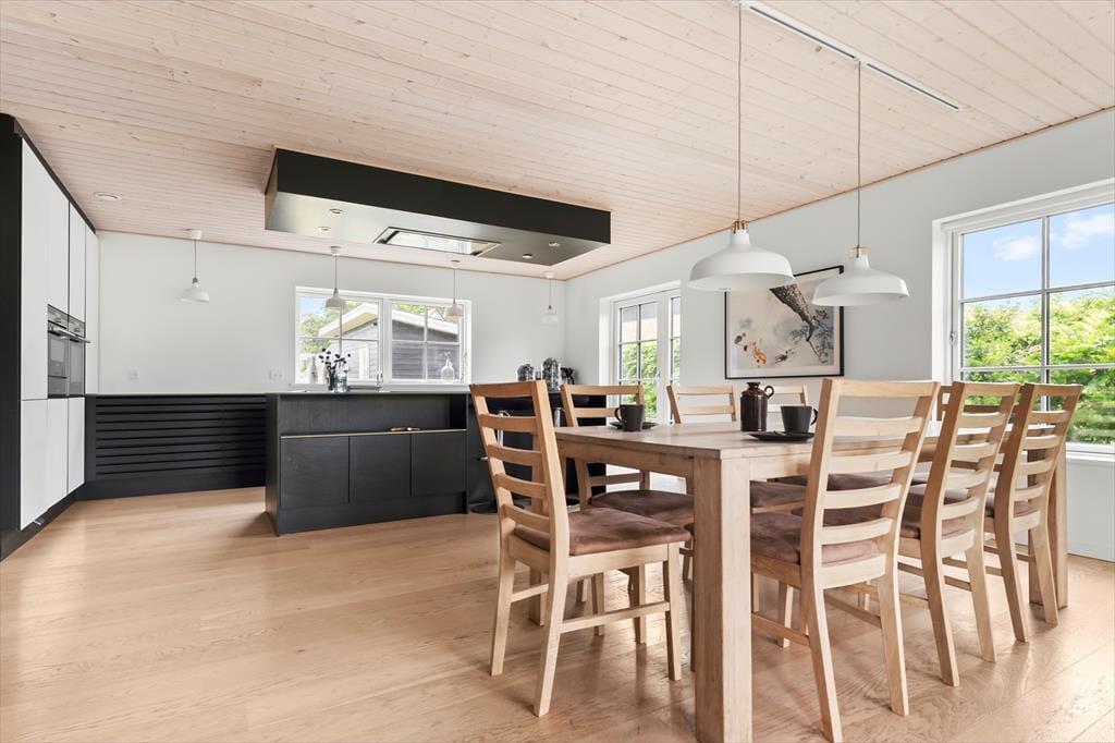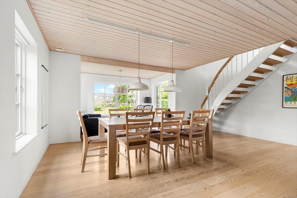 Spisebordet ligger i direkte forbindelse med både køkken og stue og inviterer til at blive hængende længe – med snakke, grin og måske et spil kort. Fra spiseområdet kan I åbne døren ud til den øst- og vestvendte terrasse og nyde livet udendørs fra morgen til aften.