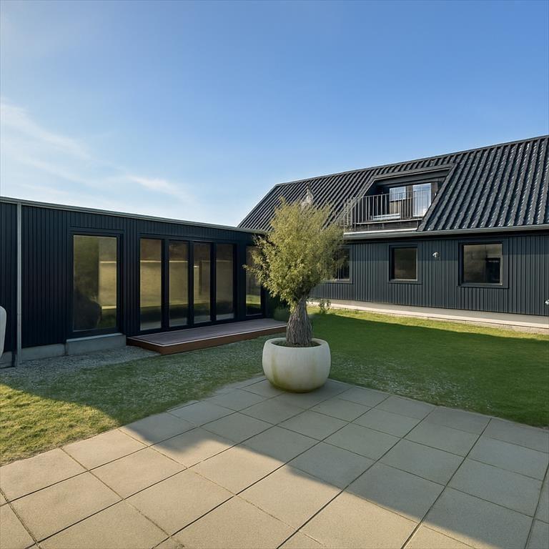 På husets østside ligger en god terrasse – ideel til morgenkaffen og eftermiddagssolen. Her kan I også tænde op i grillen og nyde de dejlige sommeraftener – eller tage en tur i vildmarksbadet.