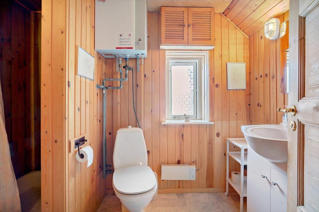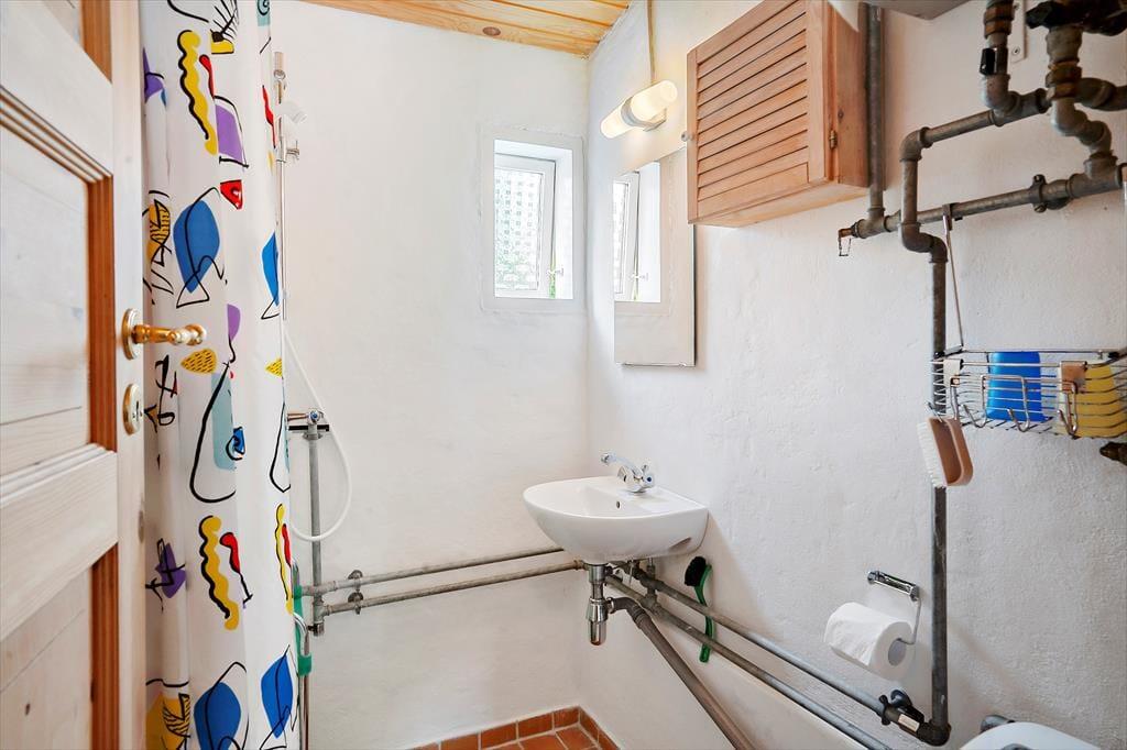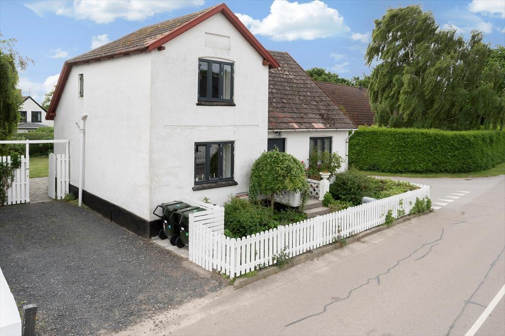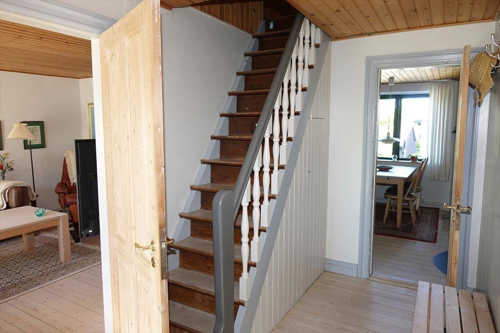 Opholdsstue med godt lys fra vest; fra stor spisestue med brændeovn er der glasdør til terrassen. Der er pænt trægulv både i stuerne og det velindrettede køkken. Lille mellemgang med vaskemaskine. På 1. sal kvistværelse med dobbeltseng samt stort værelse med dobbeltseng og sovesofa. Bad i begge plan, begge steder med brus. Elvarme, primært i form af varmepumpe (luft-til-luft) i stuen.