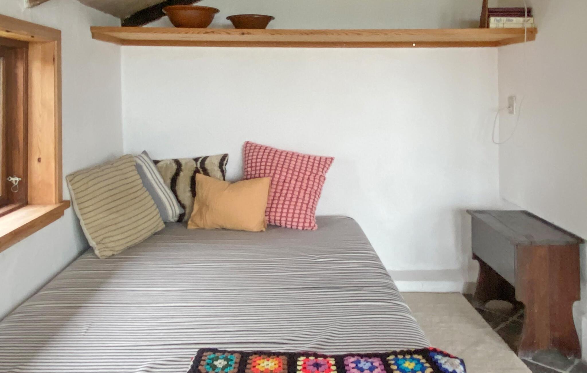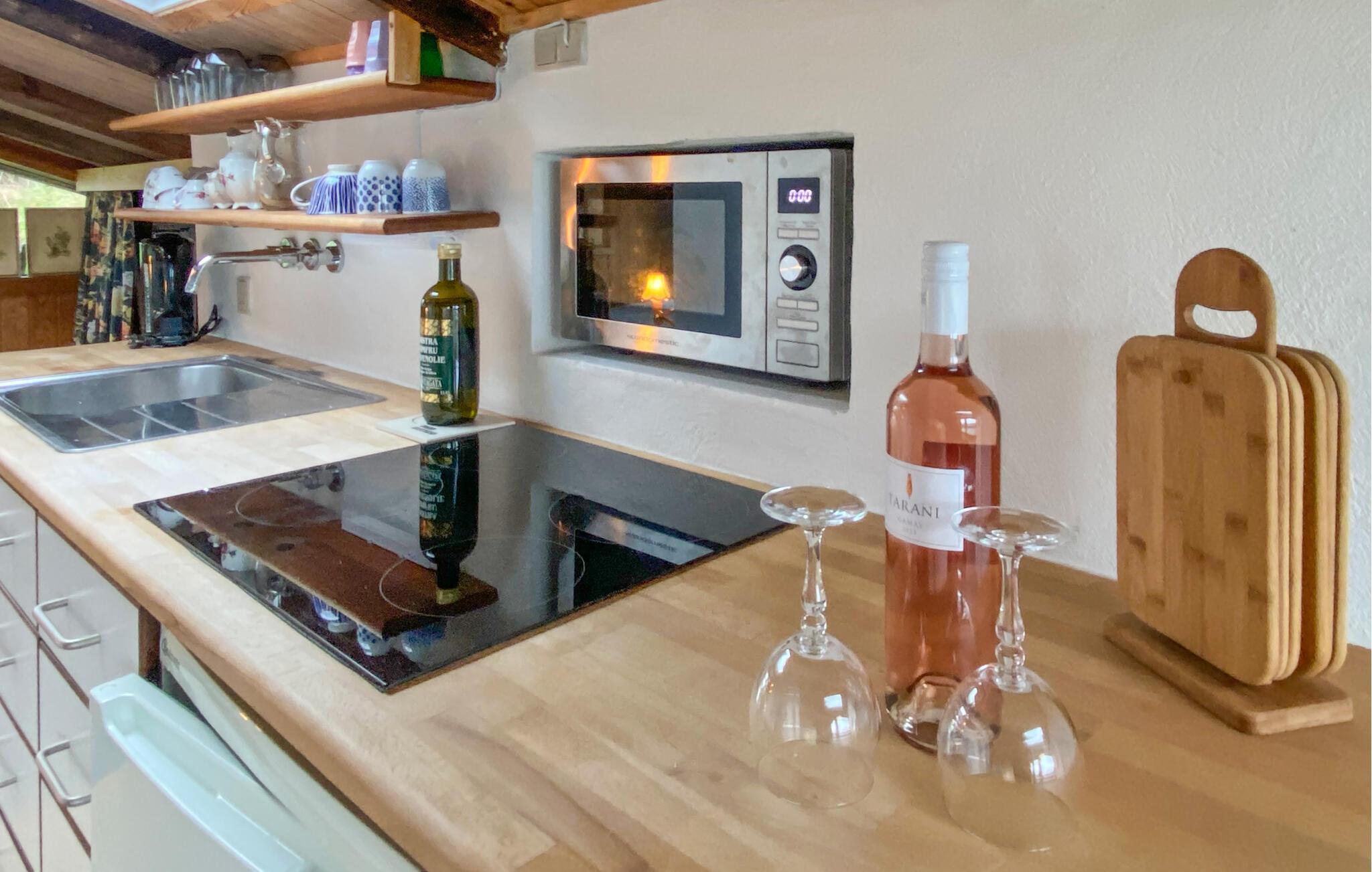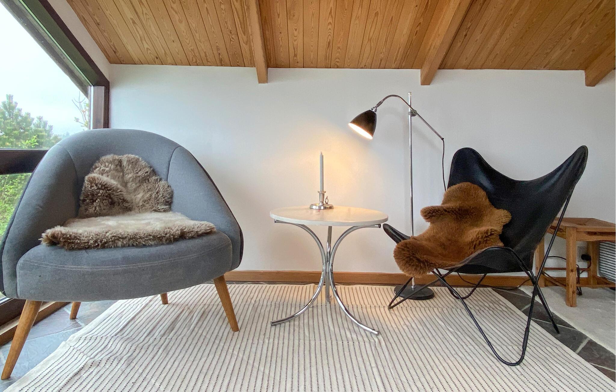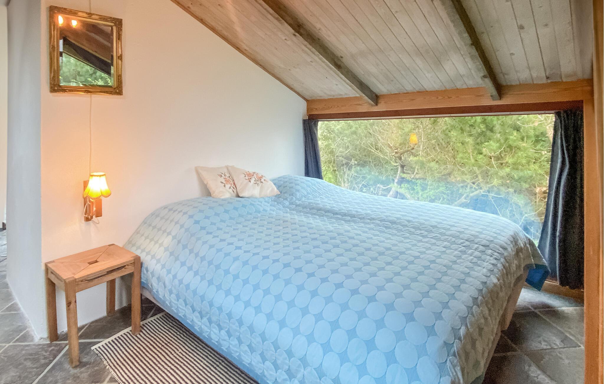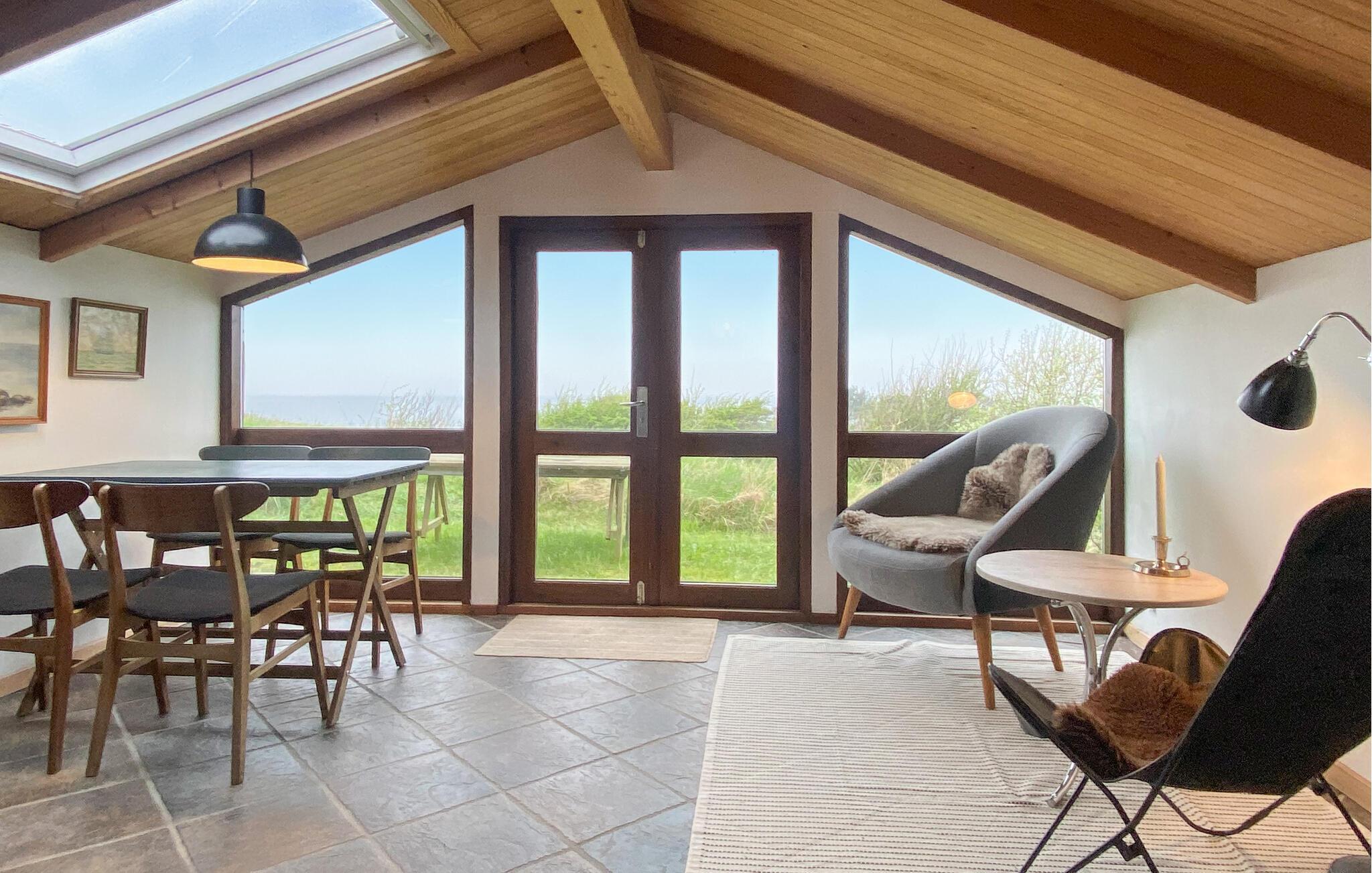 Dette rustikke lille hus er en perfekt oase for par eller små familier, der søger fred, ro, udsigt og nærhed til naturen. Den høje beliggenhed giver en fantastisk panoramaudsigt over landskabet og helt ned til havet. Nyd den lyse opholdsstue med fritlagte bjælker, store vinduer og direkte adgang til den grønne have. Slå jer ned ved spisebordet og nyd morgenmaden, mens I kigger ud over den vidtstrakte natur. Find jer godt til rette i læsehjørnet eller slap af om aftenen, mens ilden knitrer i brændeovnen. Det åbne køkken er funktionelt indrettet og giver jer mulighed for selv at kreere skønne måltider på ferien.