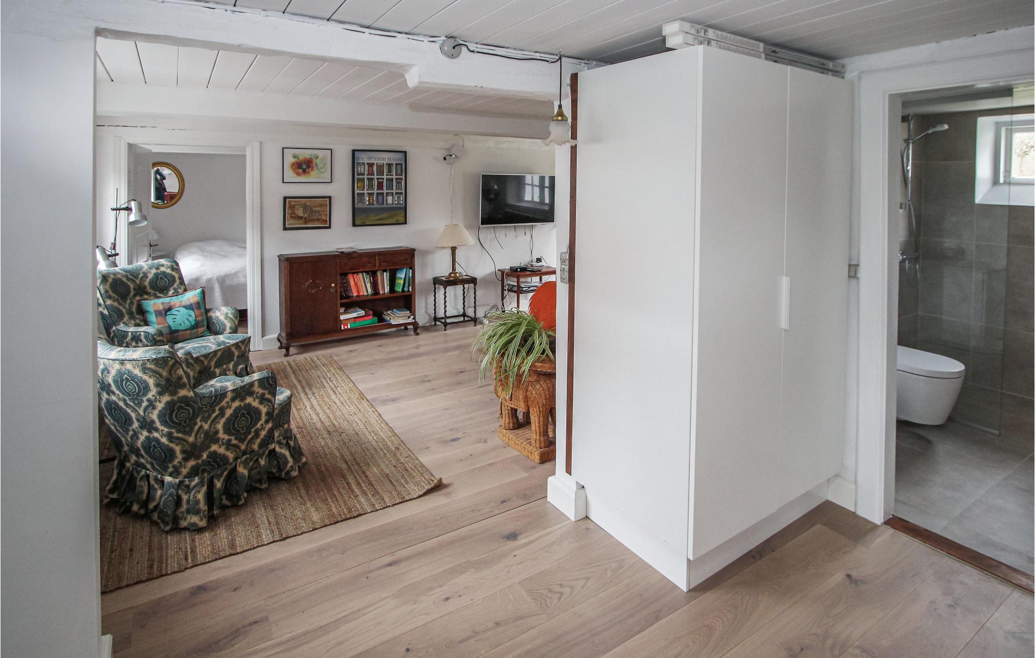 Velkommen i denne indbydende ferielejlighed, hvor I sammen med hele familien kan se frem til ro og afslapning i behagelige omgivelser. Elementer fra den gamle gård er bibeholdt på smuk vis, suppleret med moderne og komfortable faciliteter. Her kommer I sammen med jeres yndlingsmennesker hurtigt til at føle jer godt tilpas. Byd solrige timer ude på den smukke terrasse og gå ture ned til stranden.