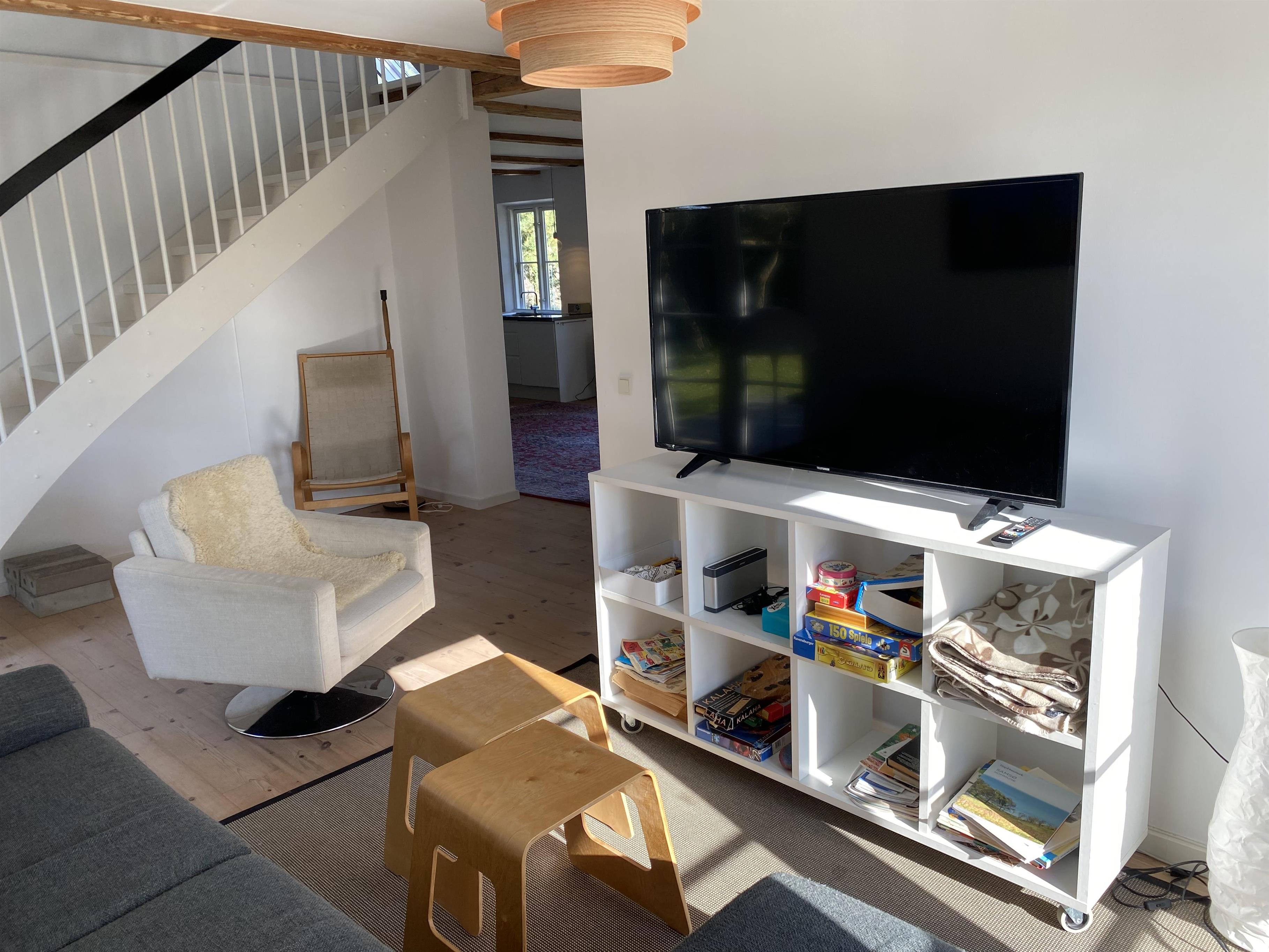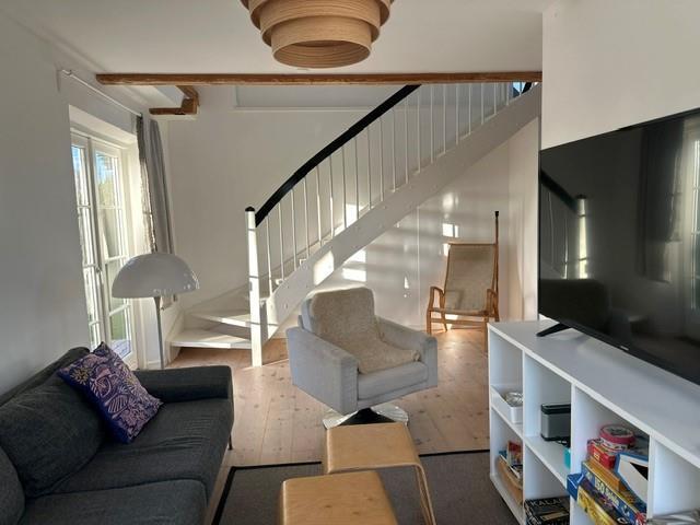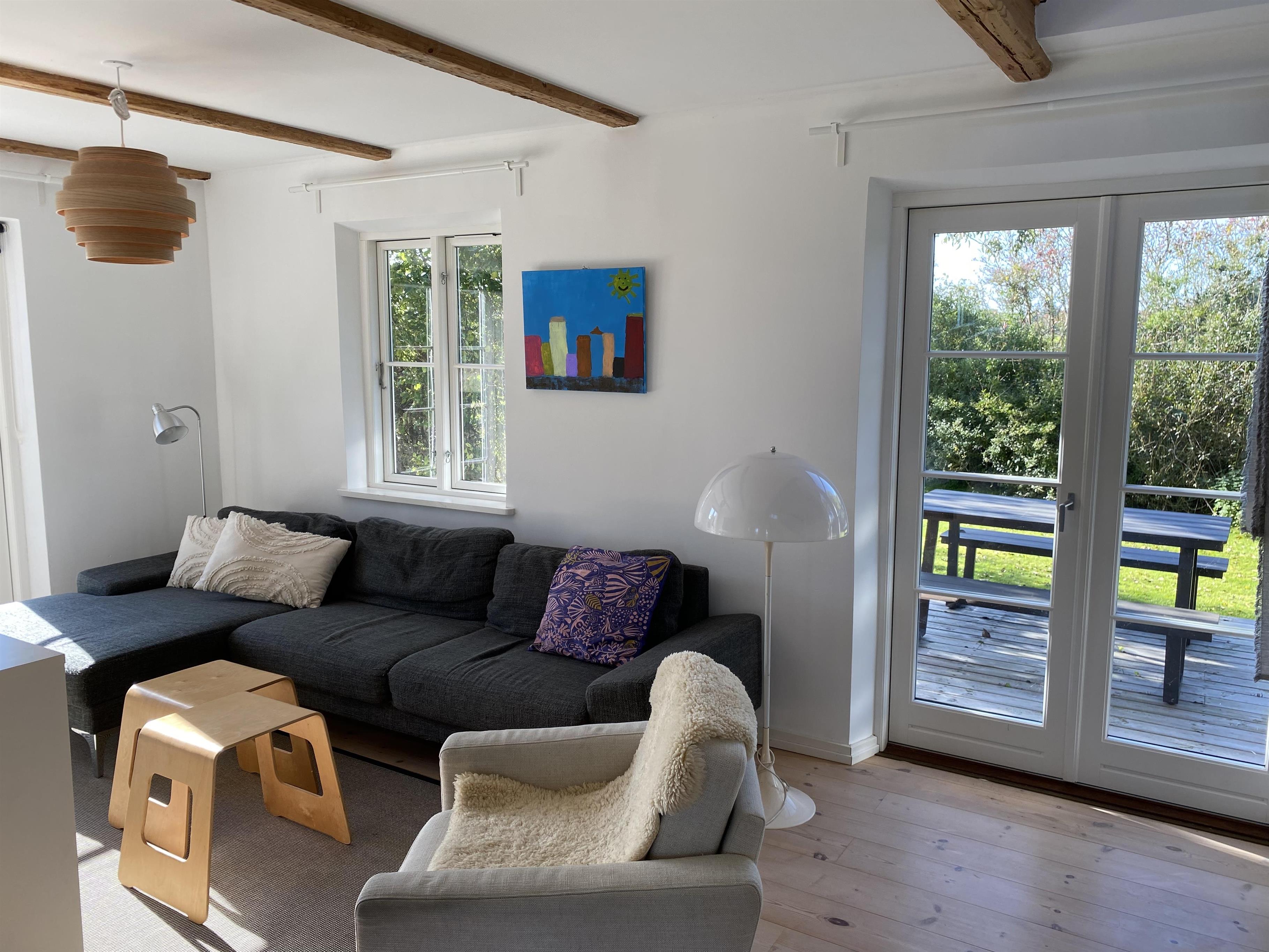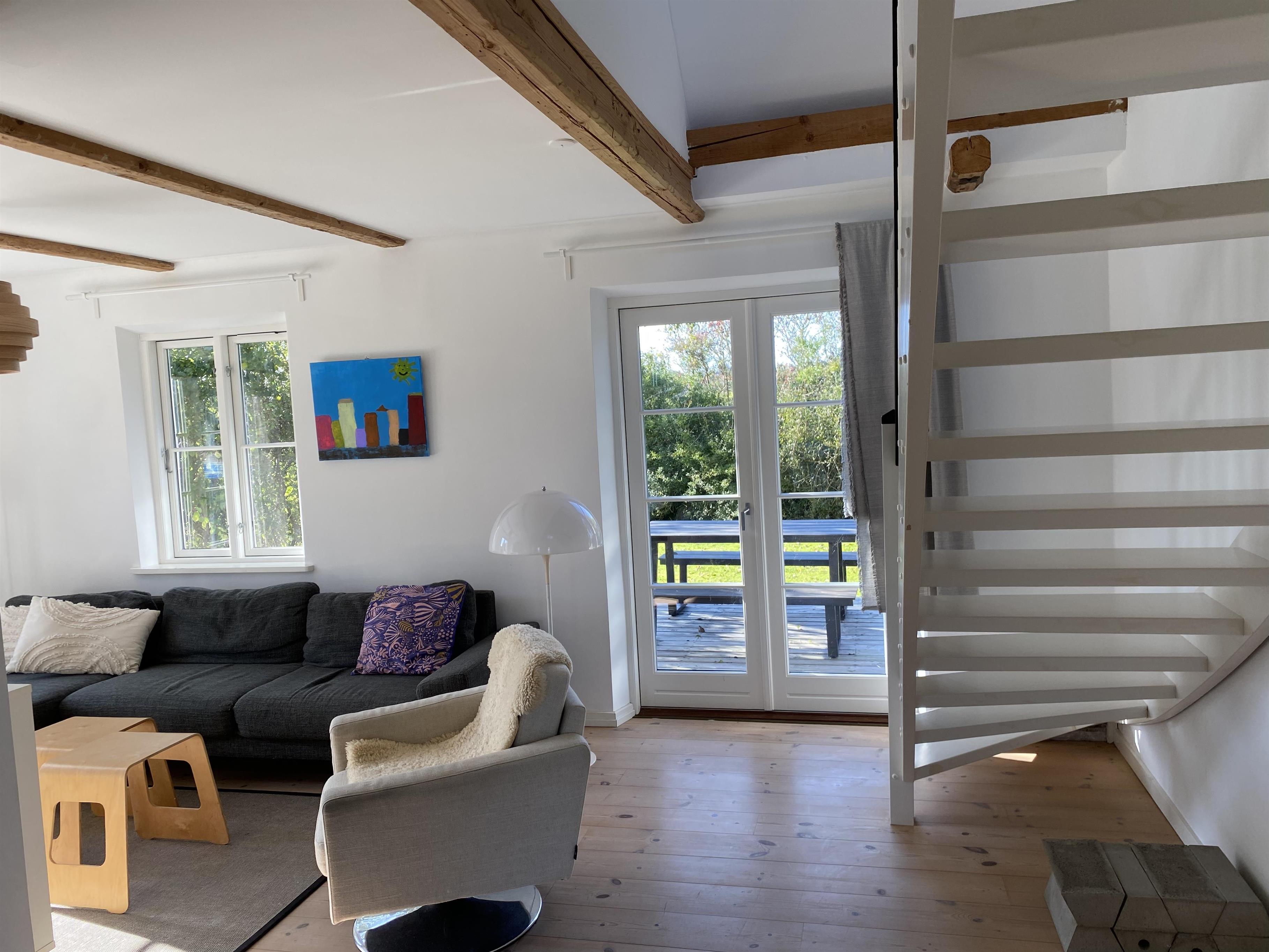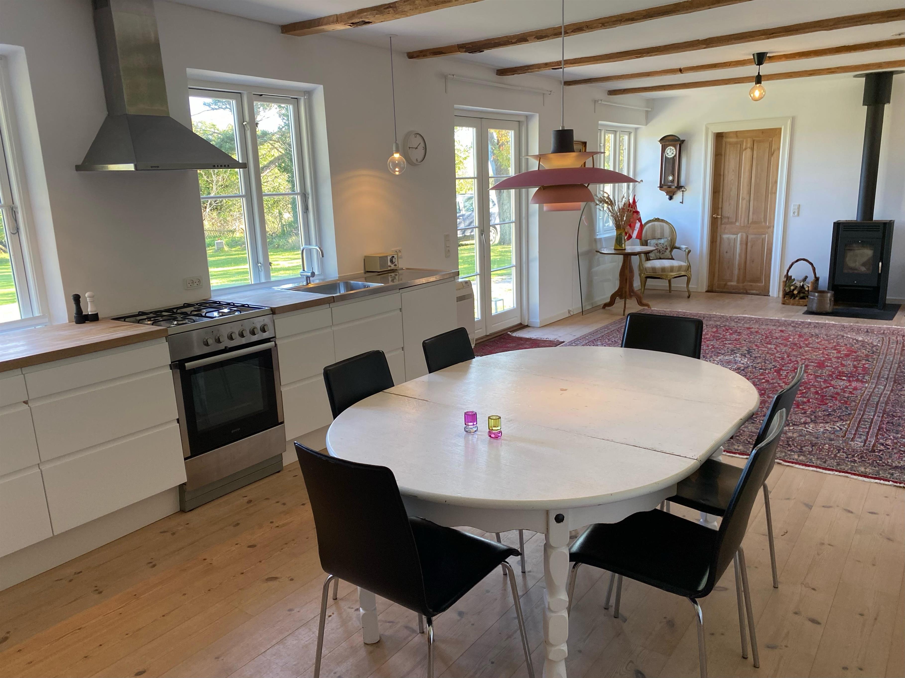 Dette charmerende og rummelige feriehus, renoveret i 2008, forener på smukkeste vis historisk charme med moderne komfort. Med plads til seks overnattende gæster er det ideelt for familier, der ønsker en fredelig base til at udforske Samsø. Huset er smagfuldt indrettet i en lys og indbydende stil, der får dig til at føle dig hjemme fra første øjeblik. Det indeholder blandt andet et dejligt stort køkkenalrum med en hyggelig spiseplads, der indbyder til fælles måltider og samvær. De åbne opholdsrum, herunder en rummelig stue med hængekøje, skaber de perfekte rammer for afslapning. Store vinduer lader masser af naturligt lys strømme ind og giver en smuk udsigt til haven, der omkranser huset. Huset indeholder også to brændeovne – en i køkkenalrummet og en i den ene af stuerne ovenpå – som er ideelle til de kolde vintermåneder.