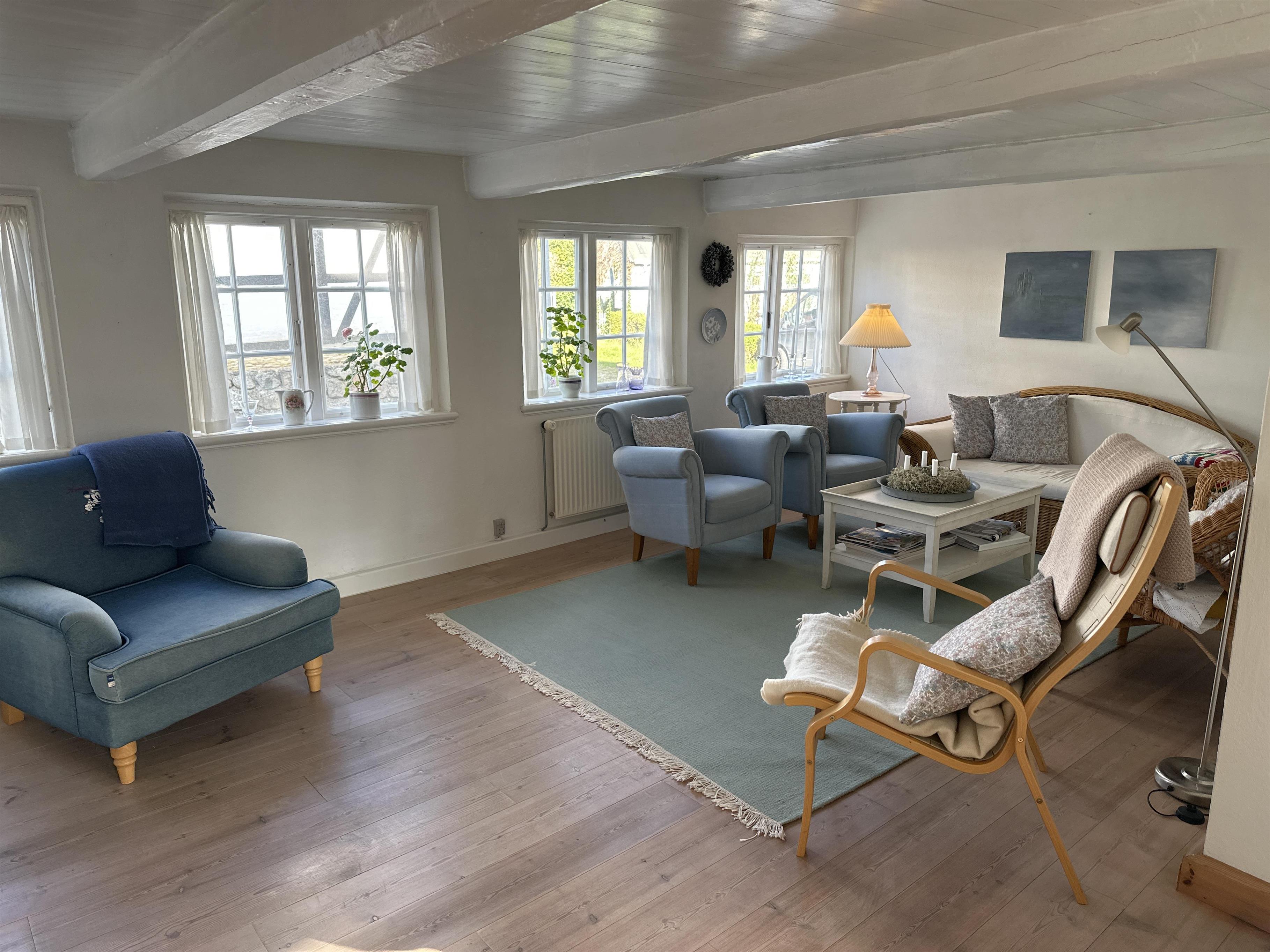 Når du træder indenfor, bliver du mødt af et dejligt, lyst køkkenalrum, hvor der både er plads til fælles madlavning, hyggelige måltider og afslapning foran brændeovnen i det indbydende sofahjørne. Her kan du nyde en rolig morgen med kaffe i hånden eller en afslappet aften efter en dag fuld af oplevelser på øen.