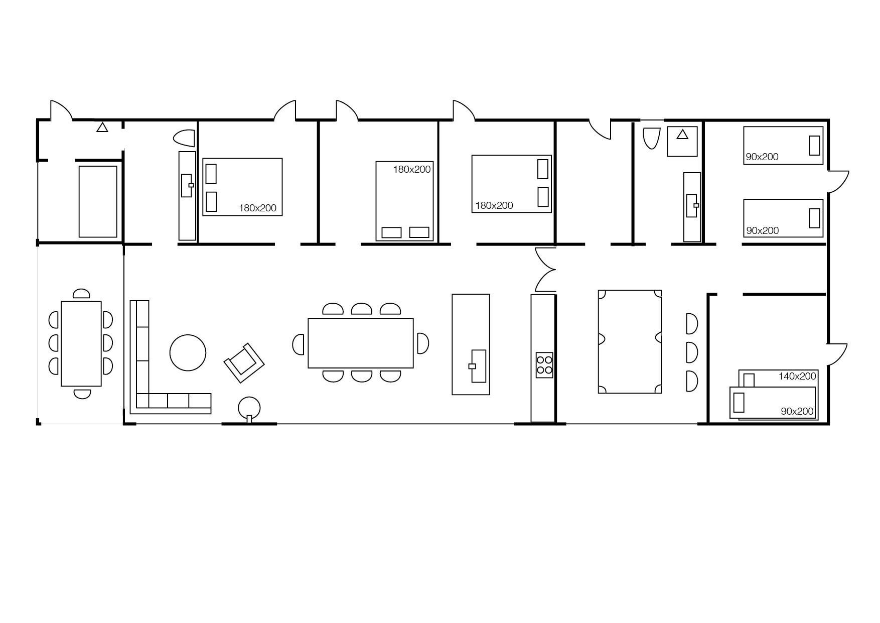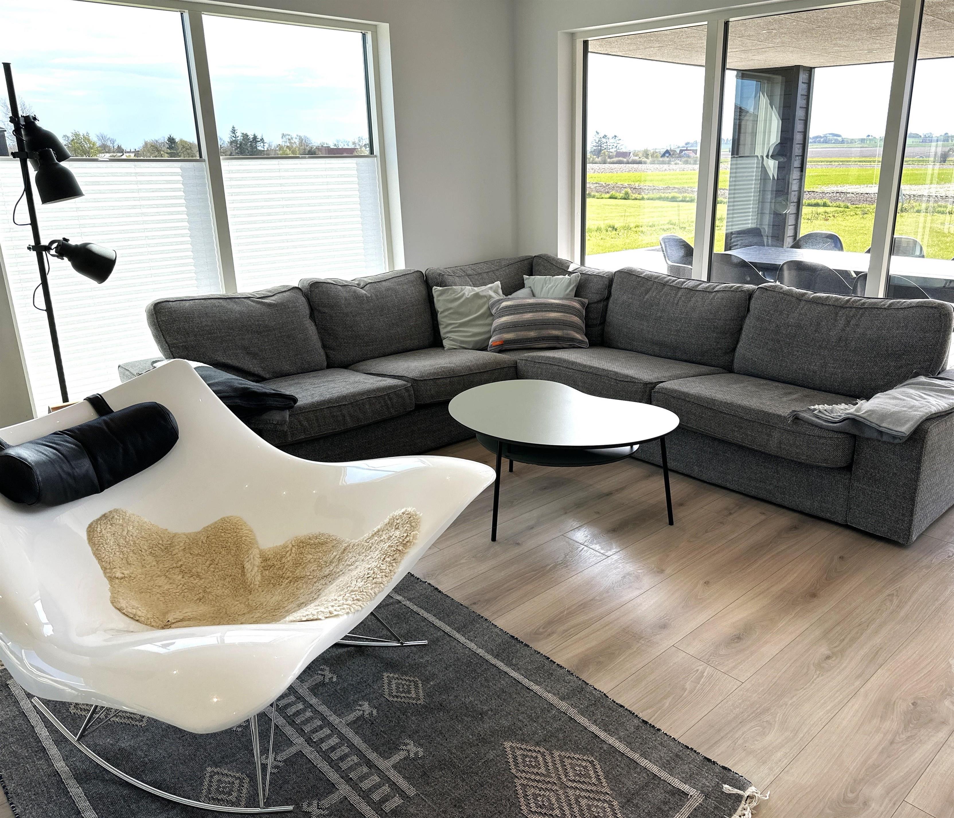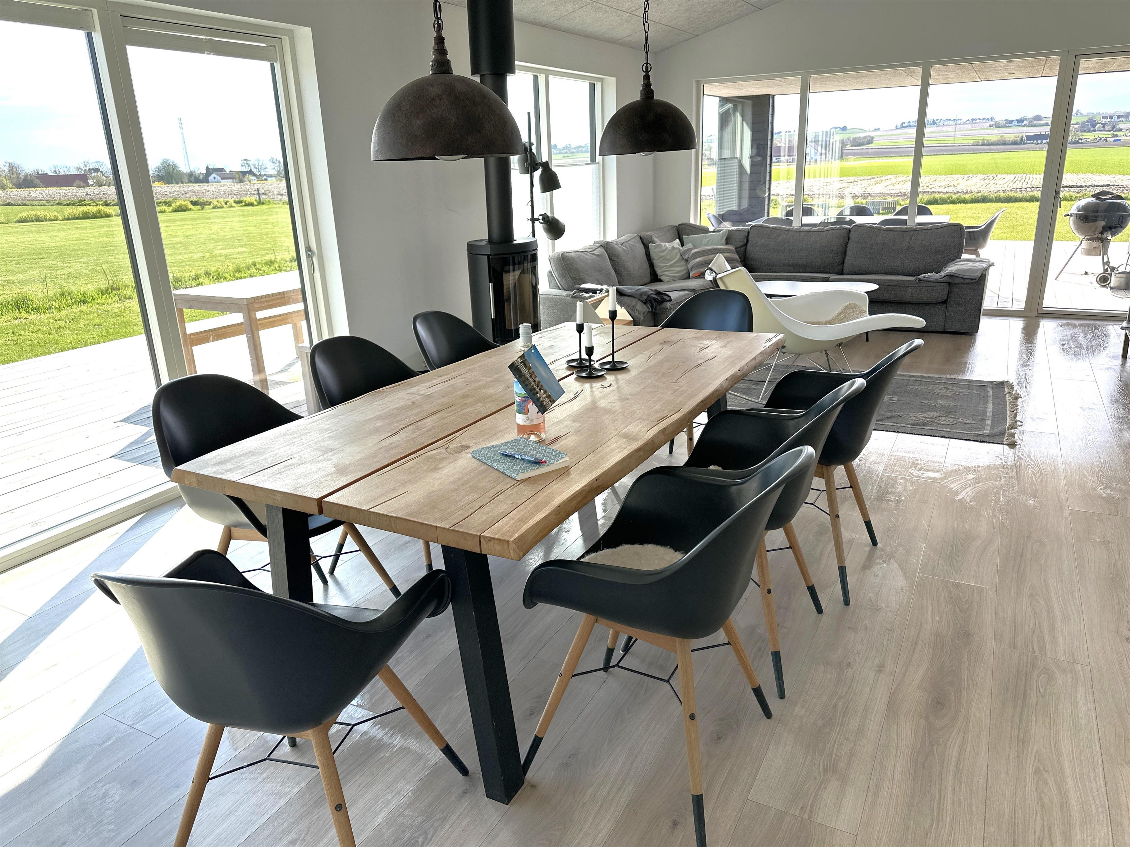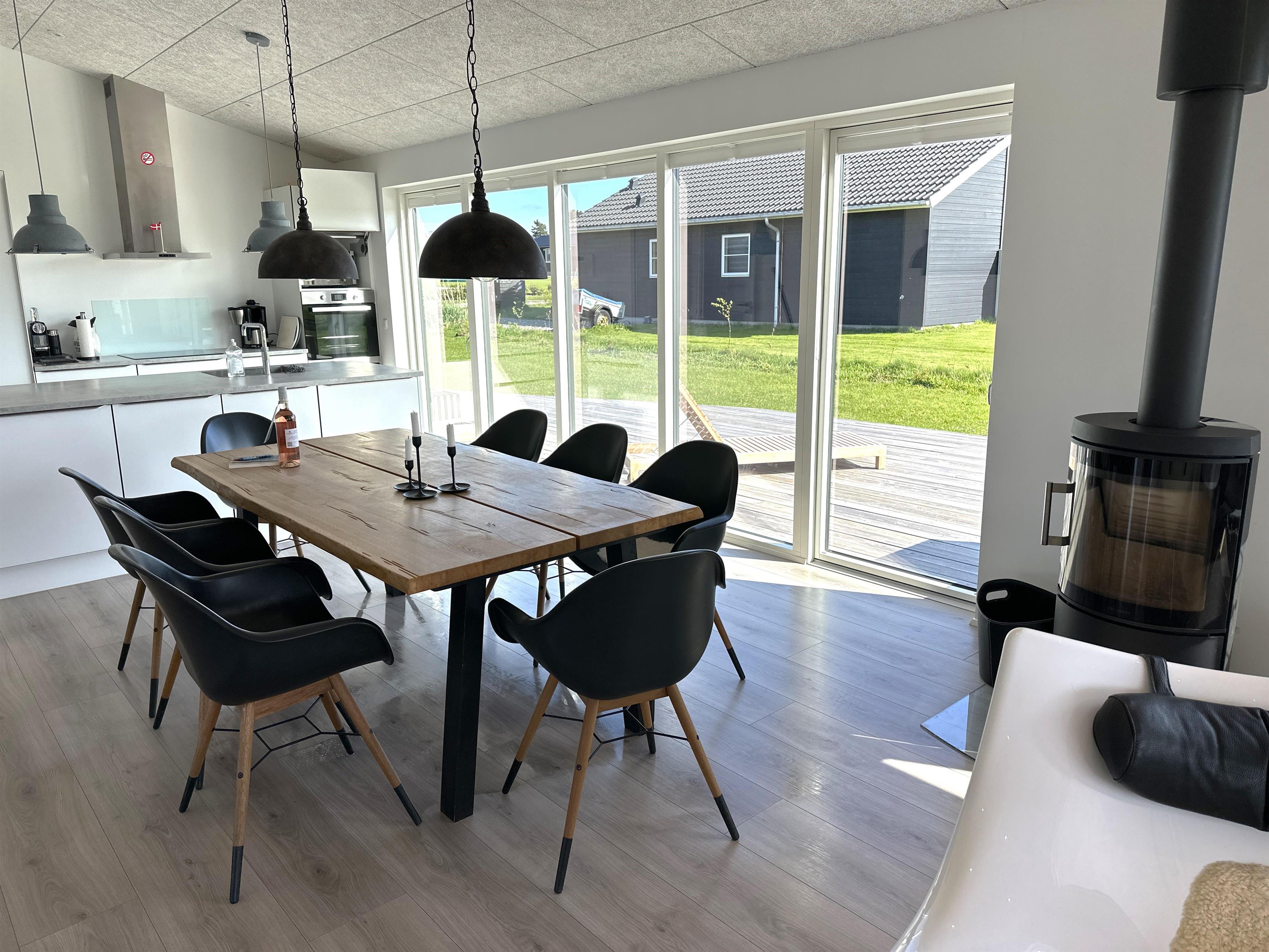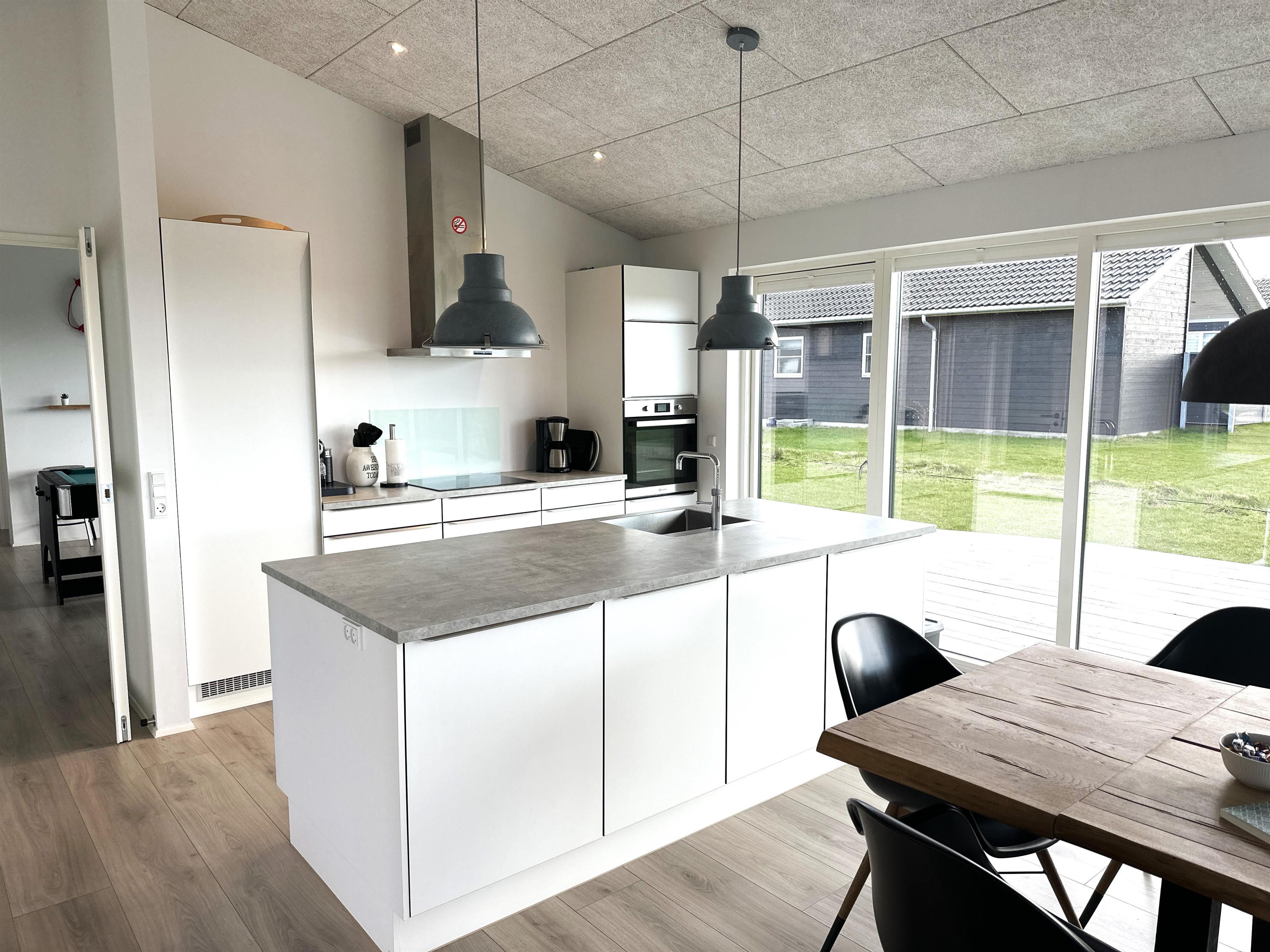 Sommerhuset har et stort køkkenalrum med spiseplads og et hyggeligt sofahjørne, hvor de store vinduer giver et dejligt lysindfald og udsigt til omgivelserne. Du kan let tilberede alle dine måltider i det fuldt udstyrede køkken – fra hurtig morgenmad til store familiemiddage.