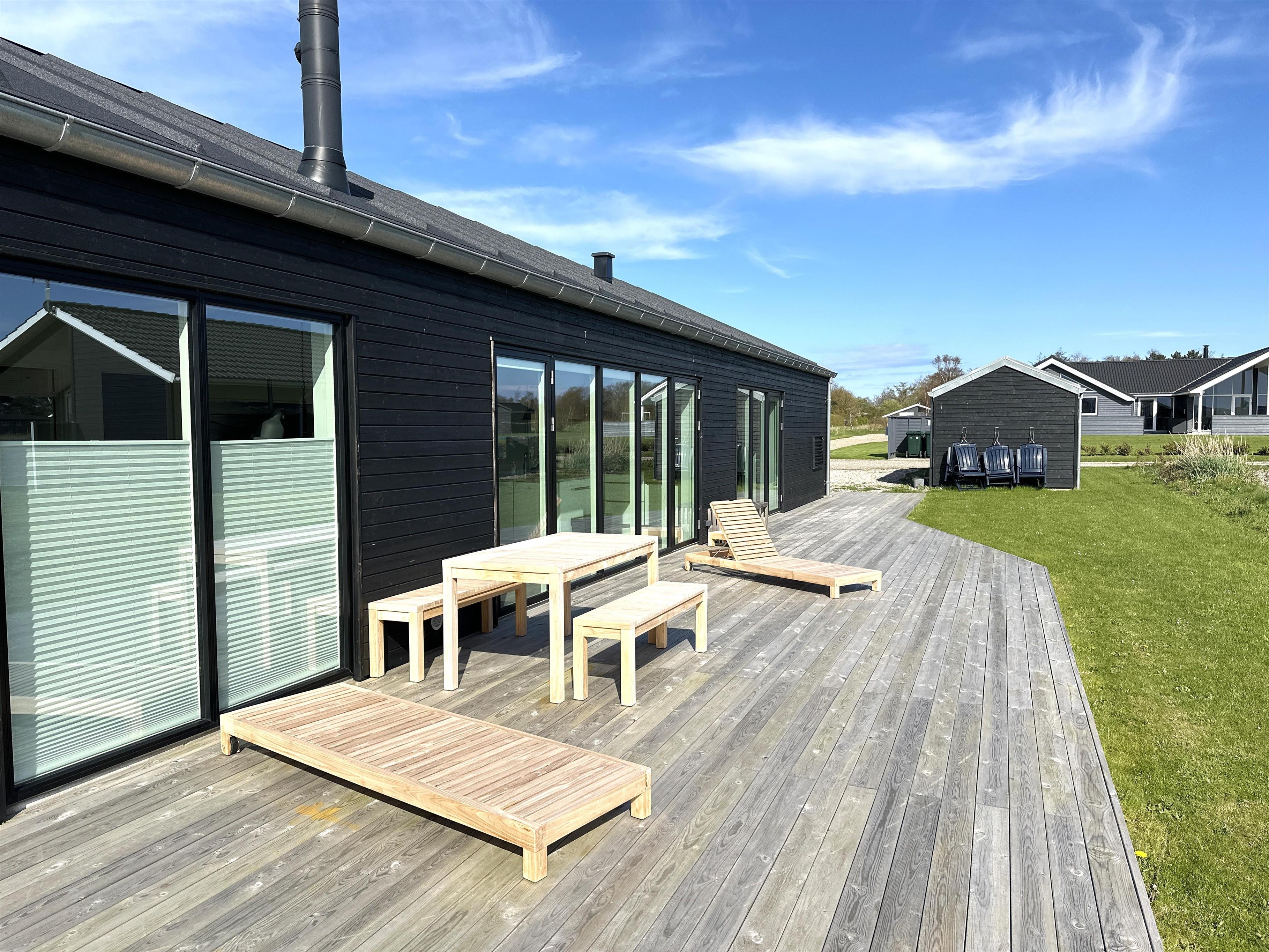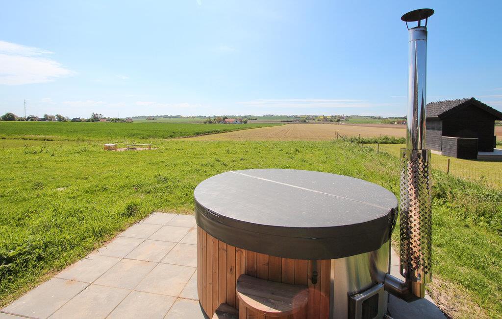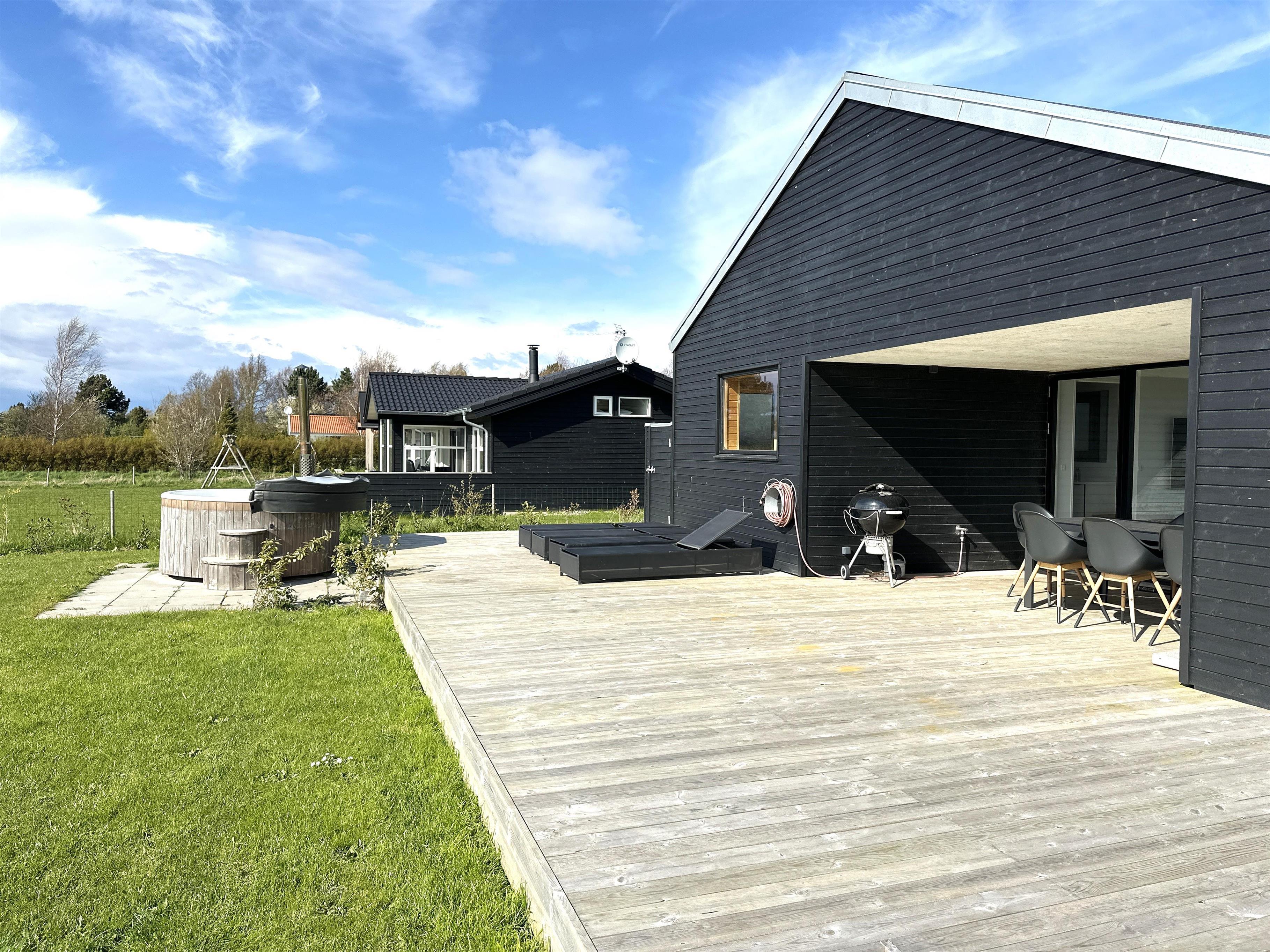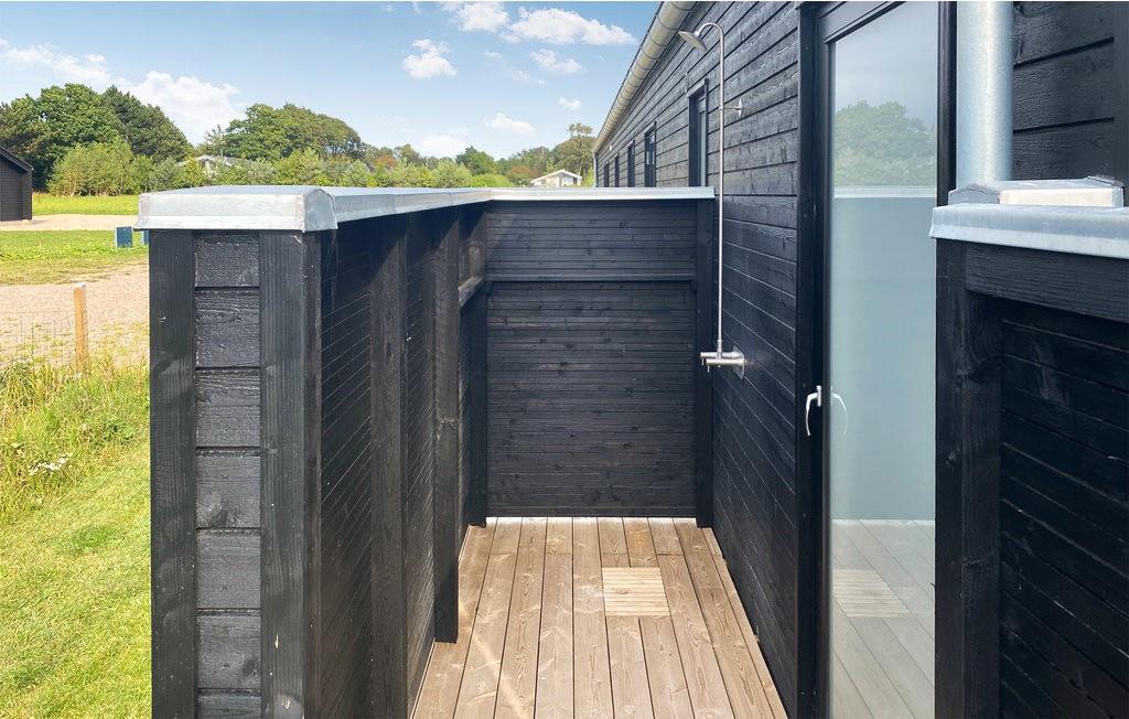 Udenfor kan du nyde en stor, delvist overdækket terrasse med vildmarksbad og udendørsbruser – ideelt til hyggelige aftener under stjernehimmel, grillaftener eller afslapning efter en dag i solen. Du har udsigt til grønne marker og ligger kun en kort gåtur fra en dejlig sandstrand, perfekt til lange dage med badning og leg. I haven er der masser af plads til boldspil og aktiviteter, så både børn og voksne kan få det sjovt.