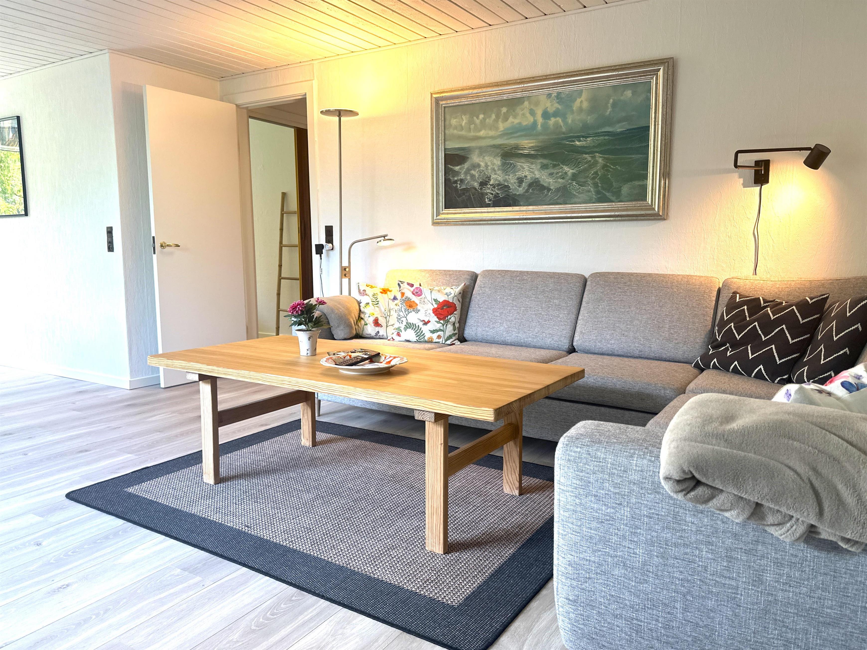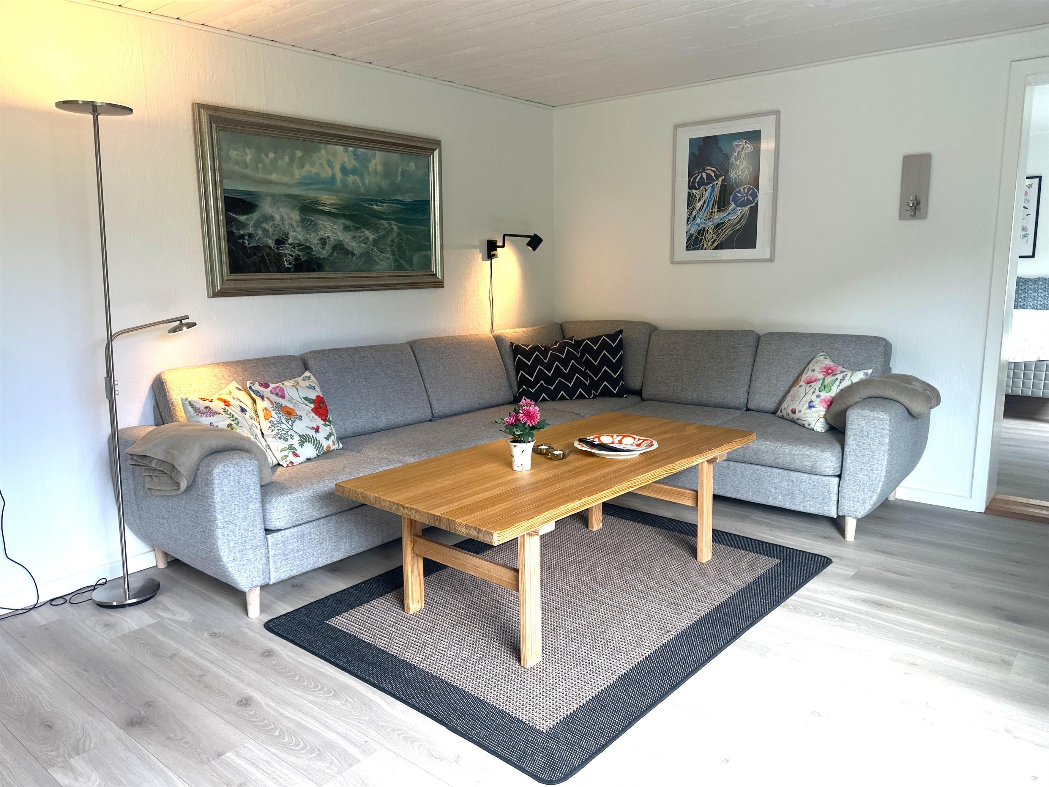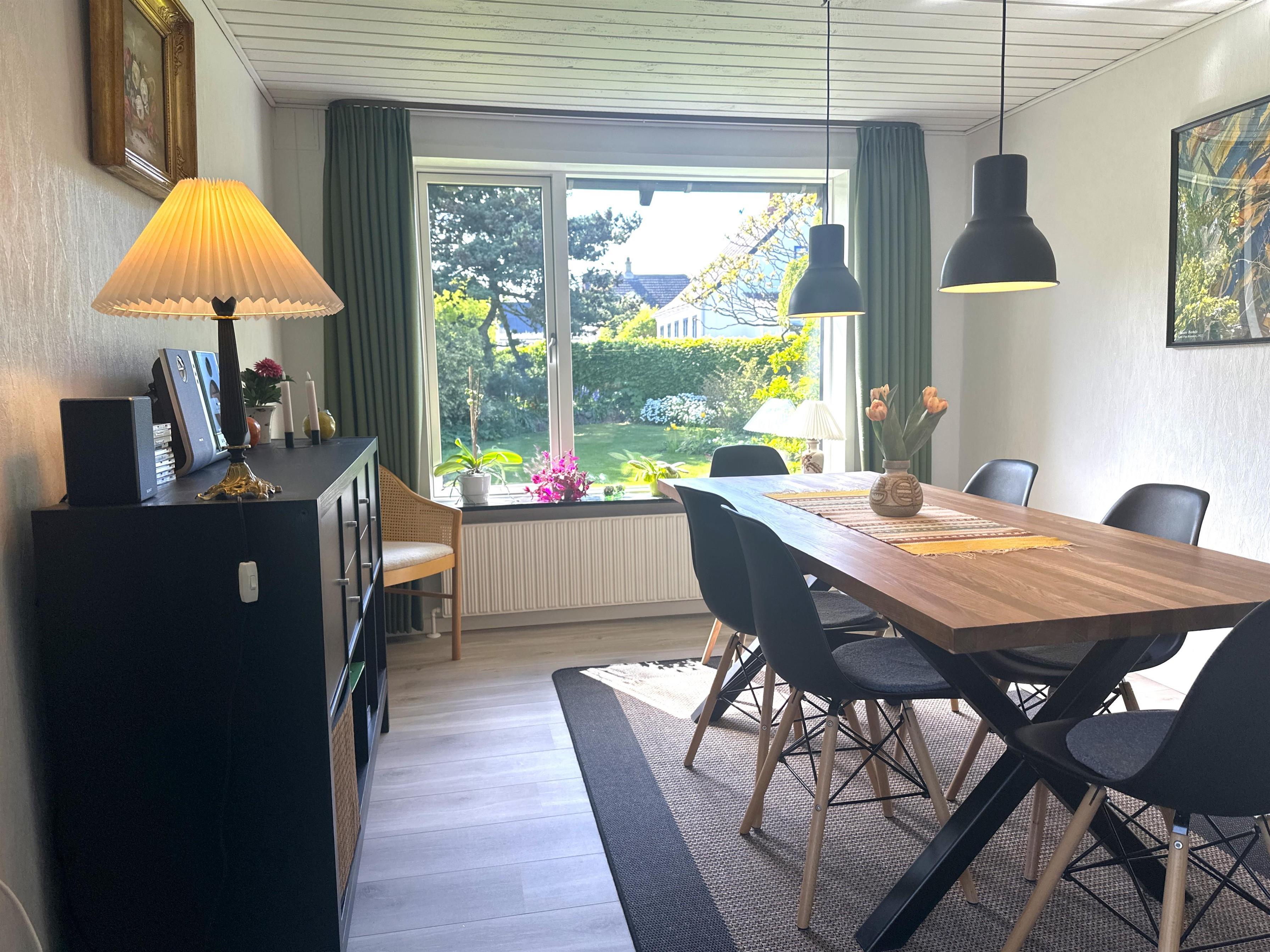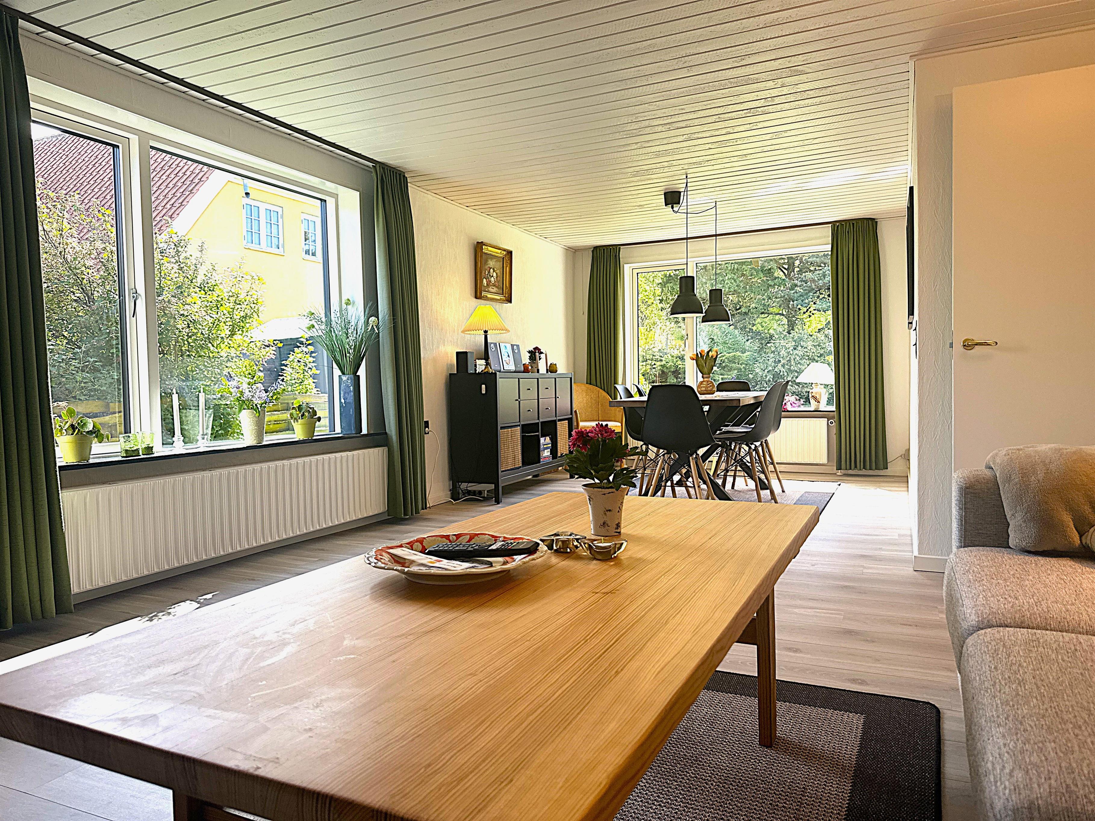 Boligen er nyrenoveret og fremstår lys, moderne og yderst indbydende. Her træder du ind i en skøn stue med store vinduer, der giver et dejligt naturligt lys og skaber en venlig atmosfære. Stuen er indrettet med både spiseplads og en komfortabel sofakrog, hvor du kan læne dig tilbage med en god bog, planlægge næste udflugt eller hygge dig efter en dag på farten.