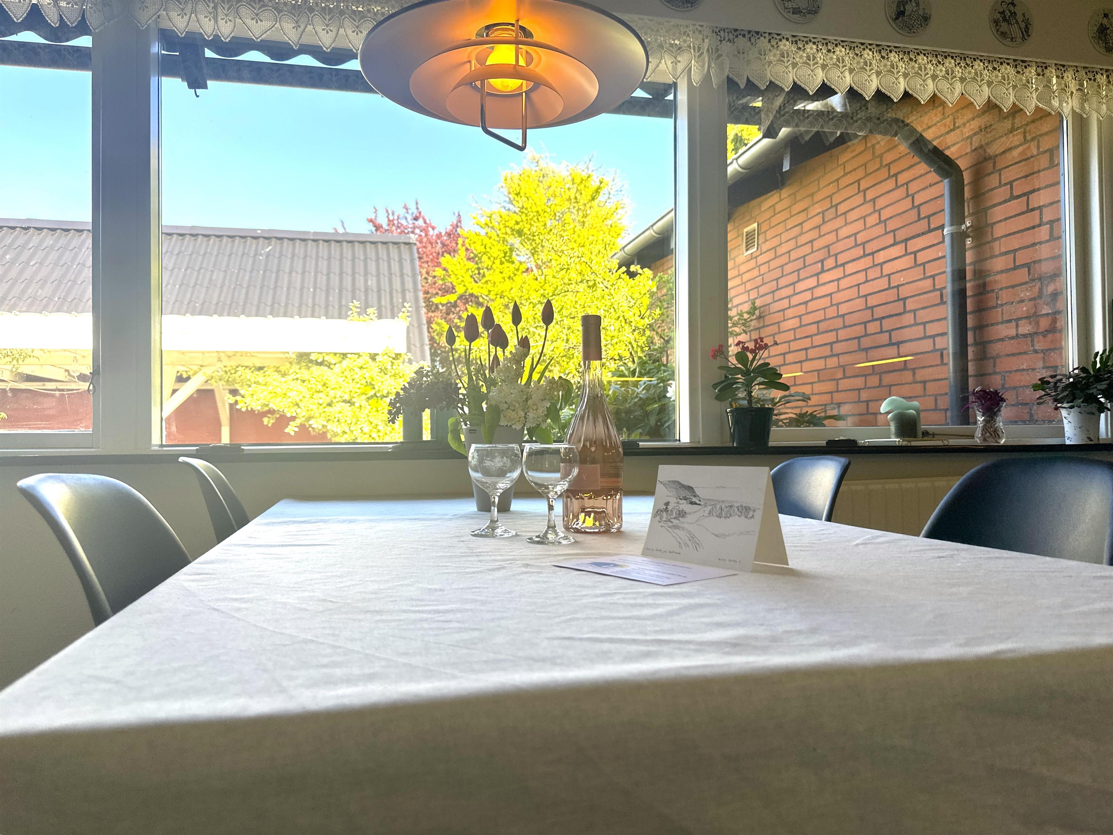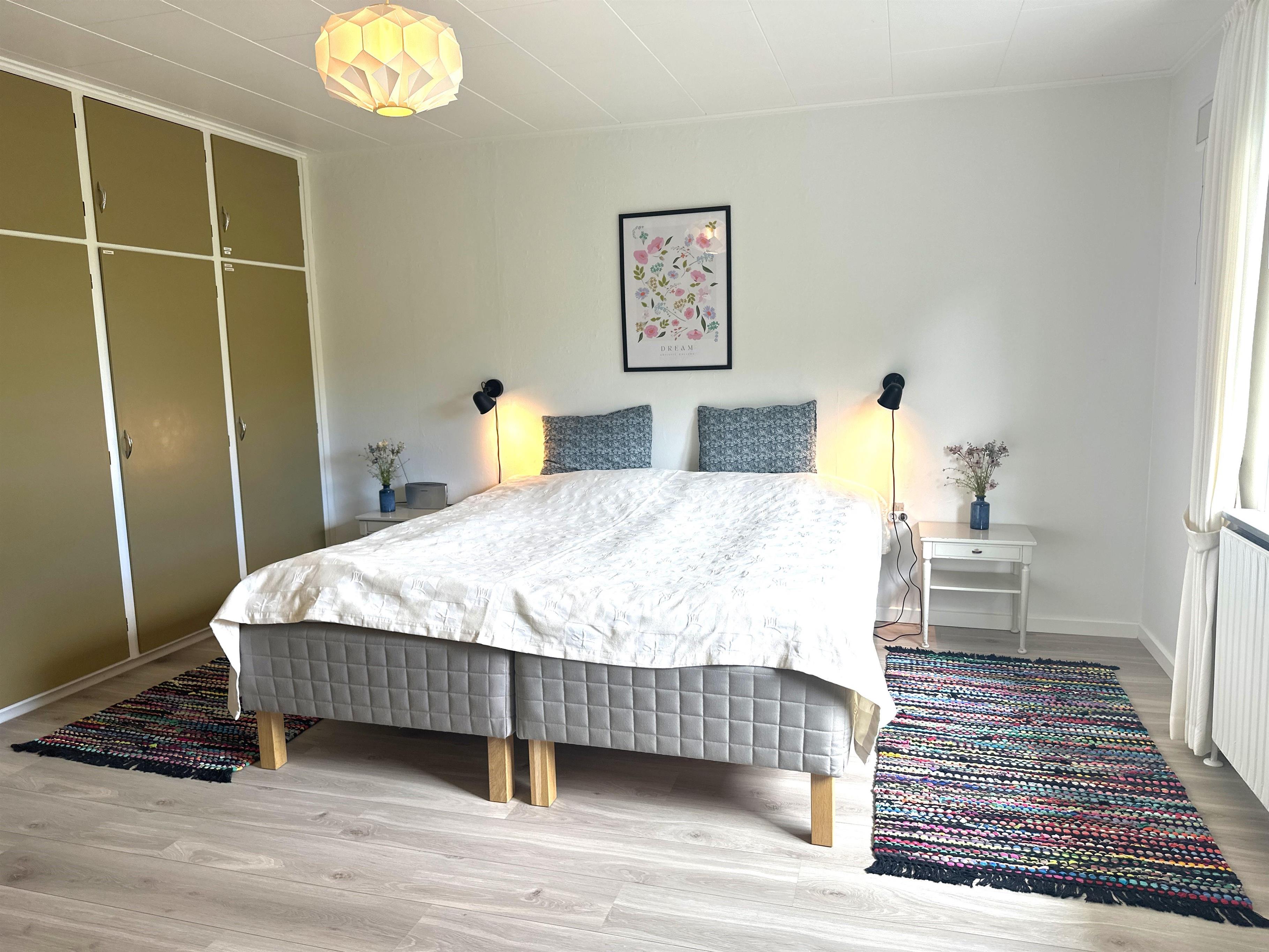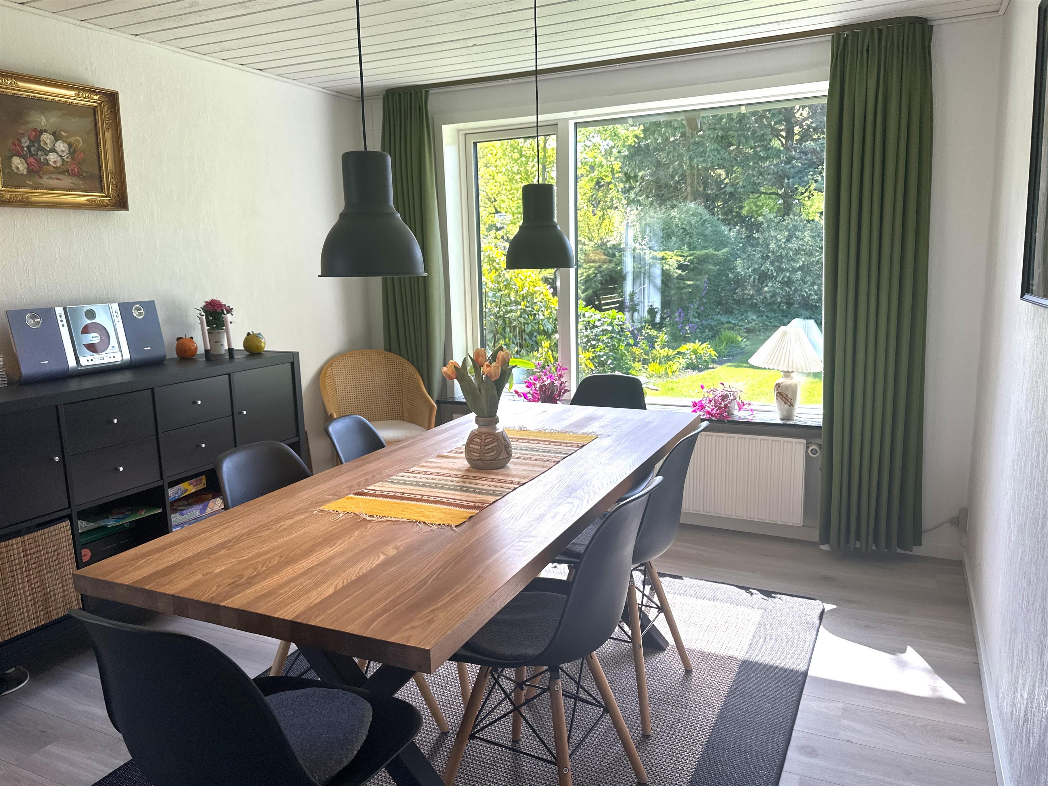 Boligen er nyrenoveret og fremstår lys, moderne og yderst indbydende. Her træder du ind i en skøn stue med store vinduer, der giver et dejligt naturligt lys og skaber en venlig atmosfære. Stuen er indrettet med både spiseplads og en komfortabel sofakrog, hvor du kan læne dig tilbage med en god bog, planlægge næste udflugt eller hygge dig efter en dag på farten.