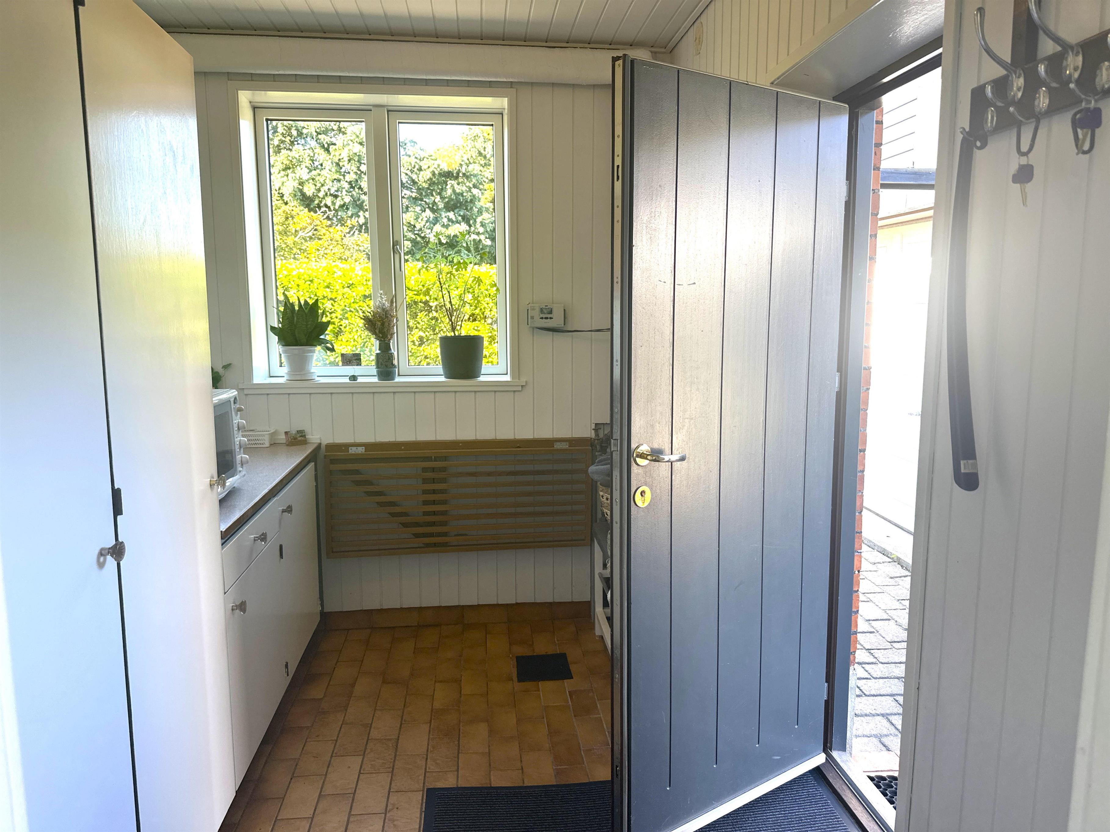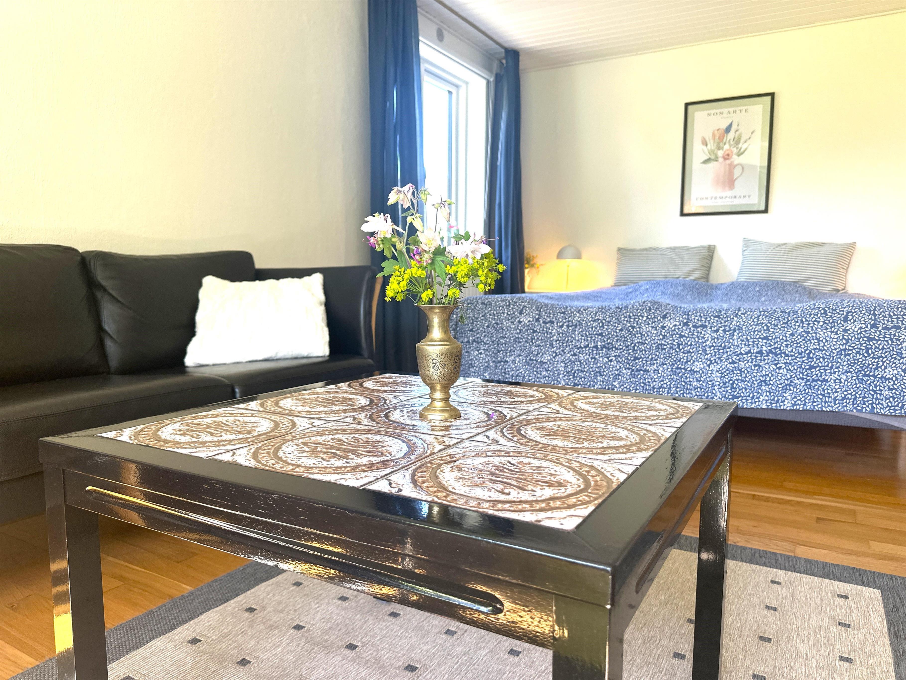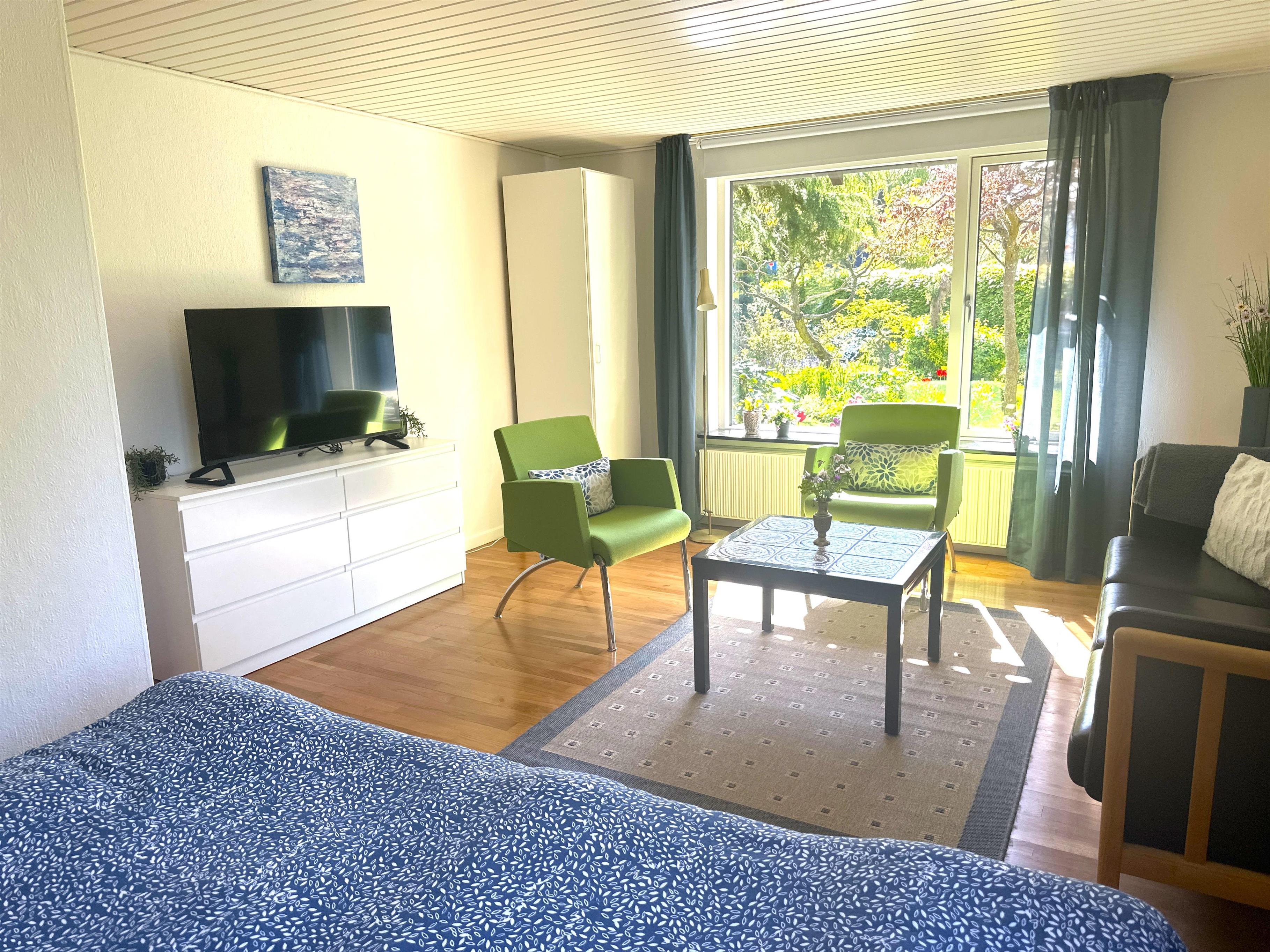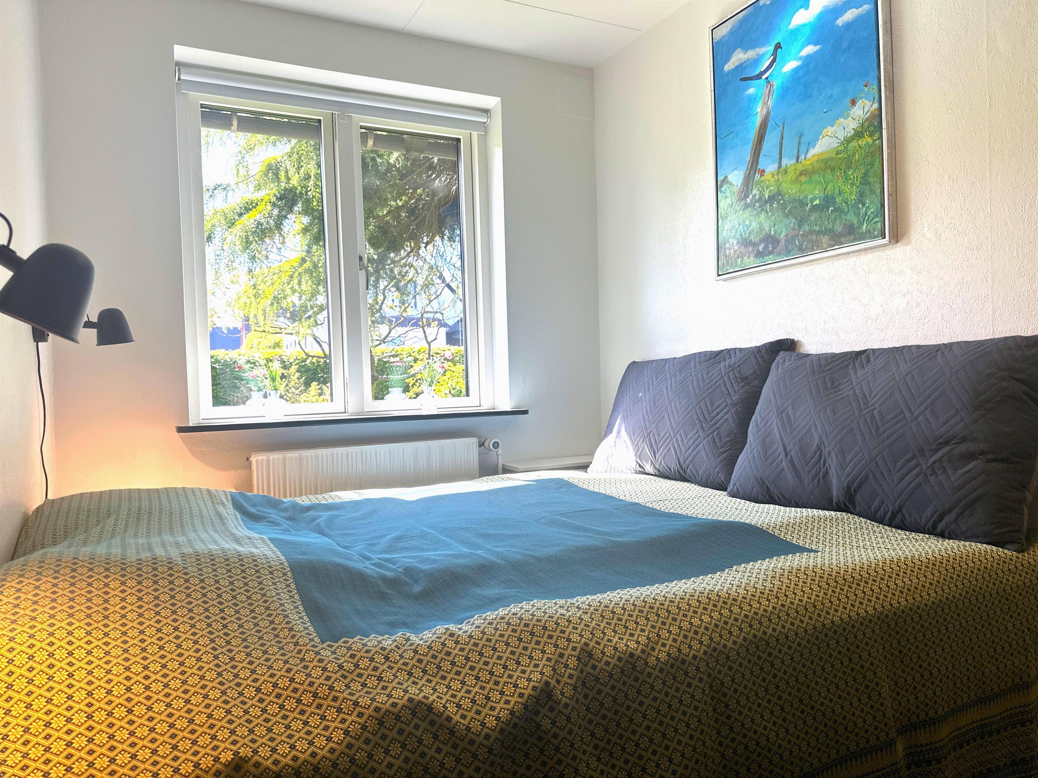 Boligen er nyrenoveret og fremstår lys, moderne og yderst indbydende. Her træder du ind i en skøn stue med store vinduer, der giver et dejligt naturligt lys og skaber en venlig atmosfære. Stuen er indrettet med både spiseplads og en komfortabel sofakrog, hvor du kan læne dig tilbage med en god bog, planlægge næste udflugt eller hygge dig efter en dag på farten.