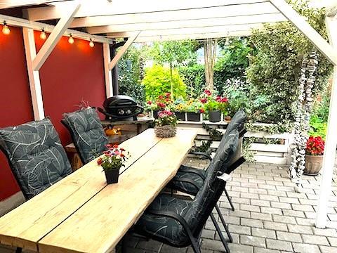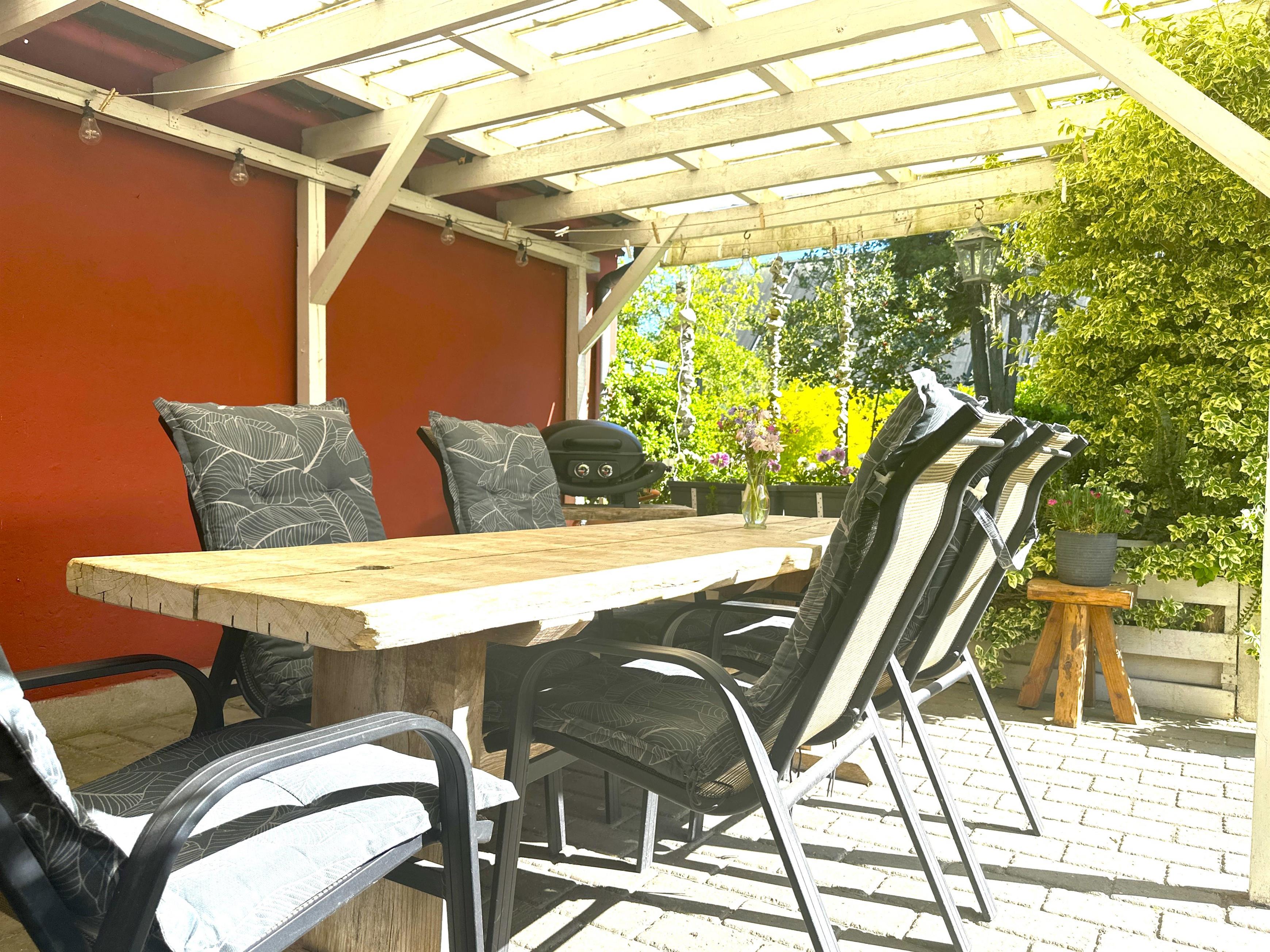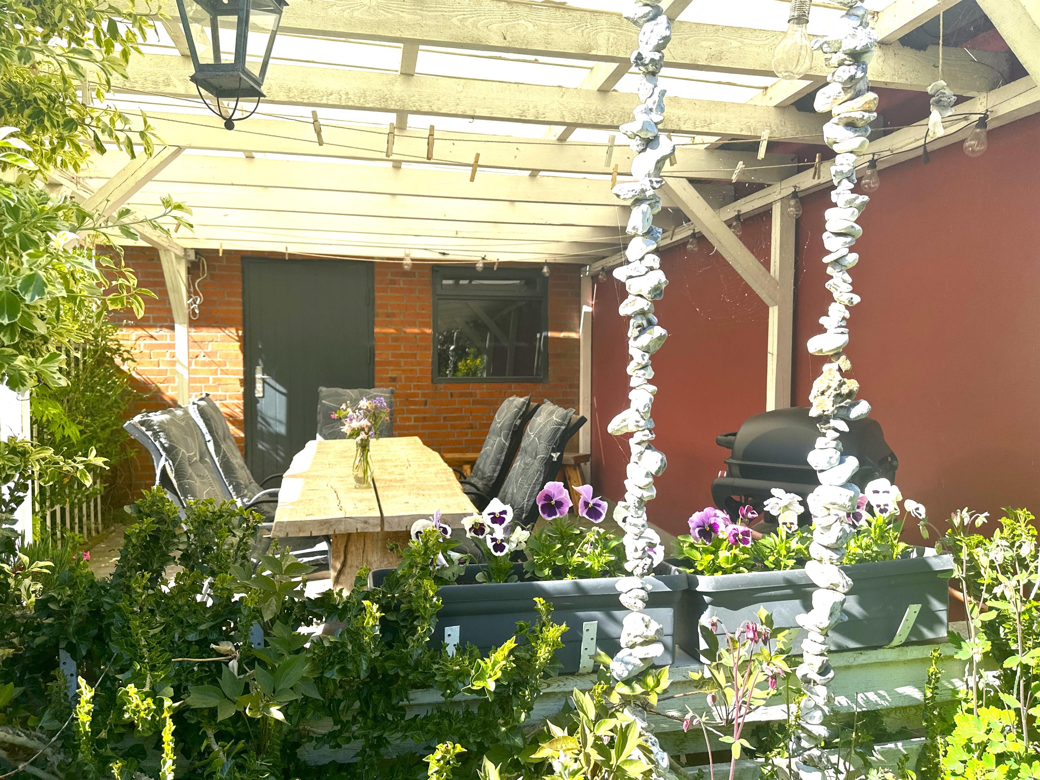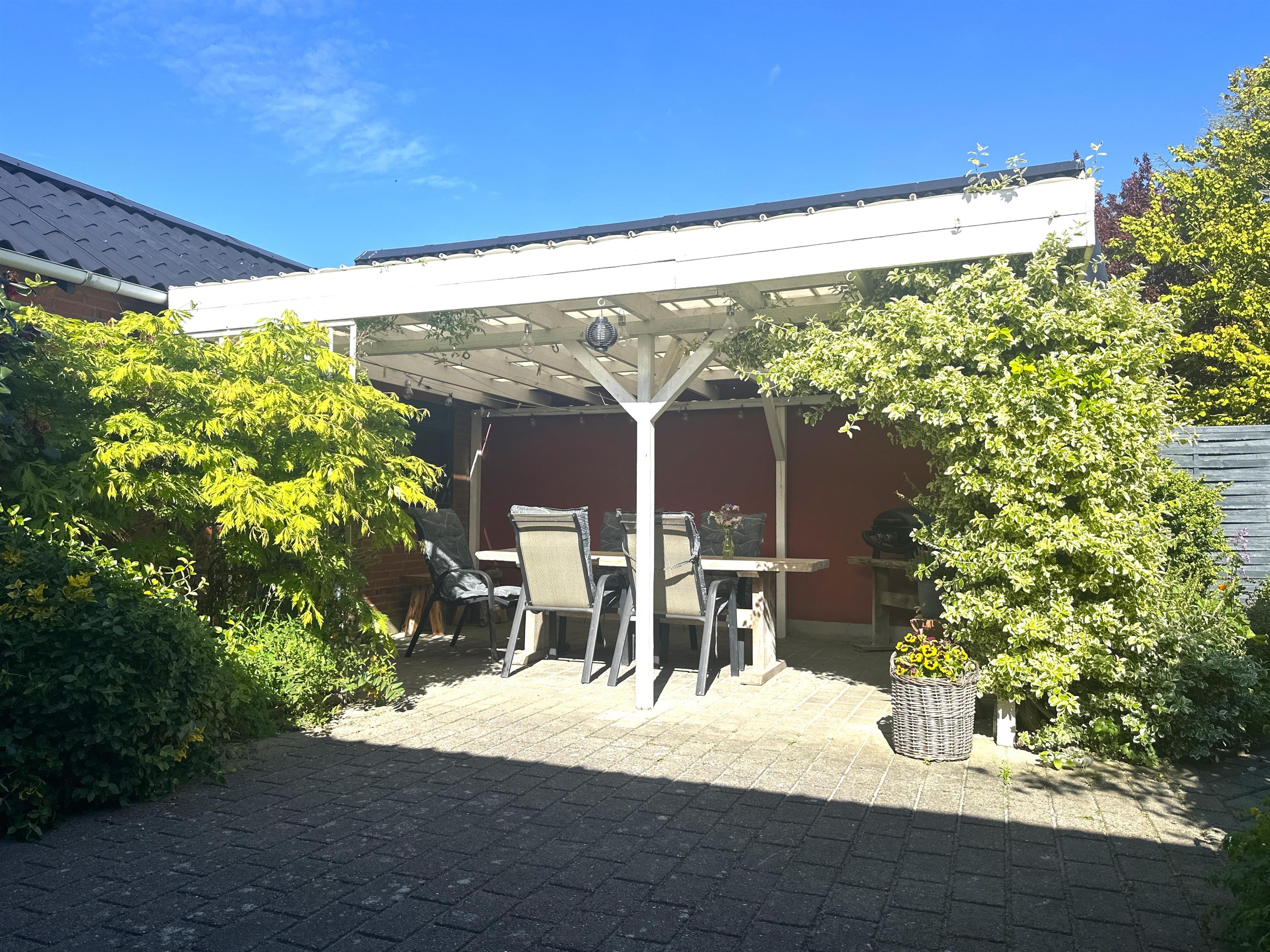 Den overdækkede terrasse er hjertet af udelivet – her kan du starte dagen med en kop kaffe, nyde frokosten i skyggen eller runde aftenen af med et godt glas vin. Uanset vejr og årstid er her altid et hyggeligt sted at opholde sig.