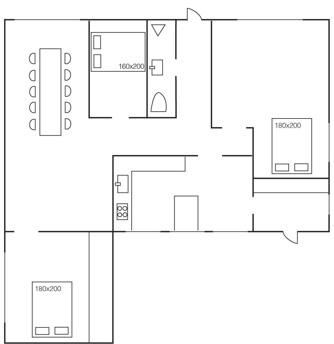 Ferieboligen byder på tre rummelige soveværelser, alle med dobbeltsenge og god plads til afslapning. I det ene værelse finder du en hyggelig lille krog med sofa og stole – et perfekt sted for dig, der ønsker en stille stund alene, eller hvor børnene kan lege. Badeværelset er lyst og moderne og udstyret med brusekabine, og derudover har du et separat vaskerum med praktiske faciliteter og legeredskaber til familiens yngste.