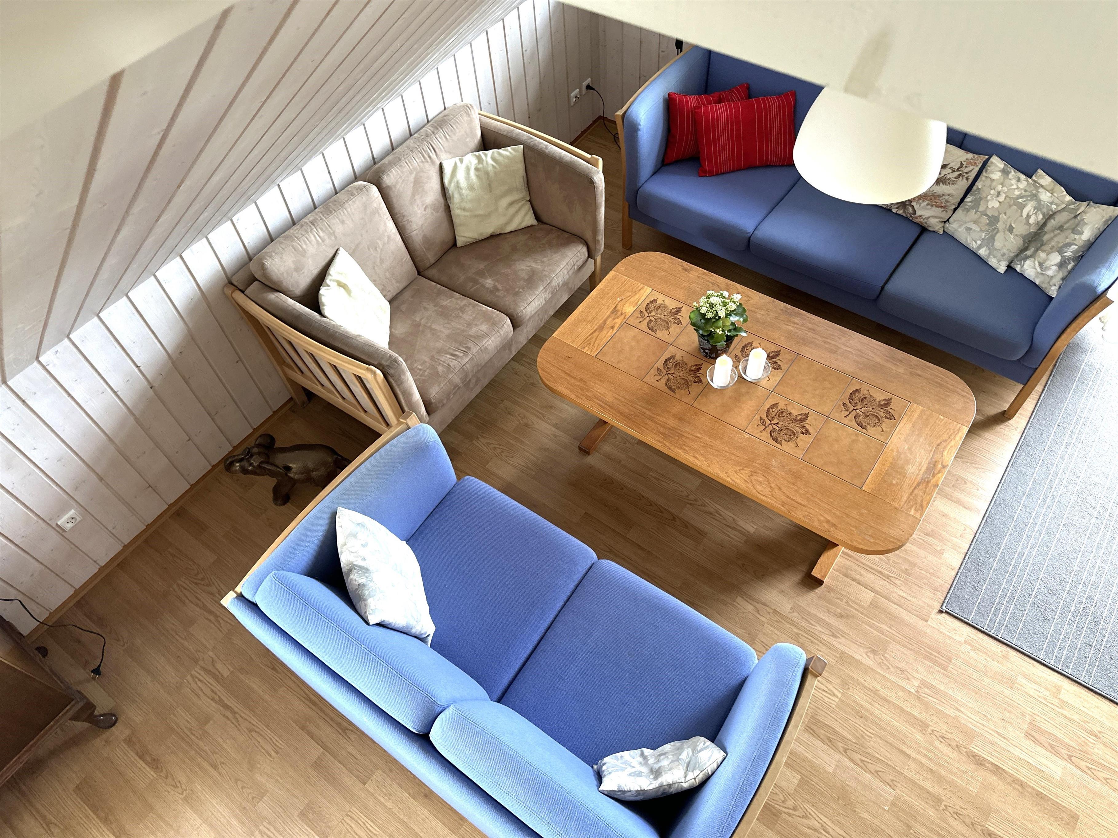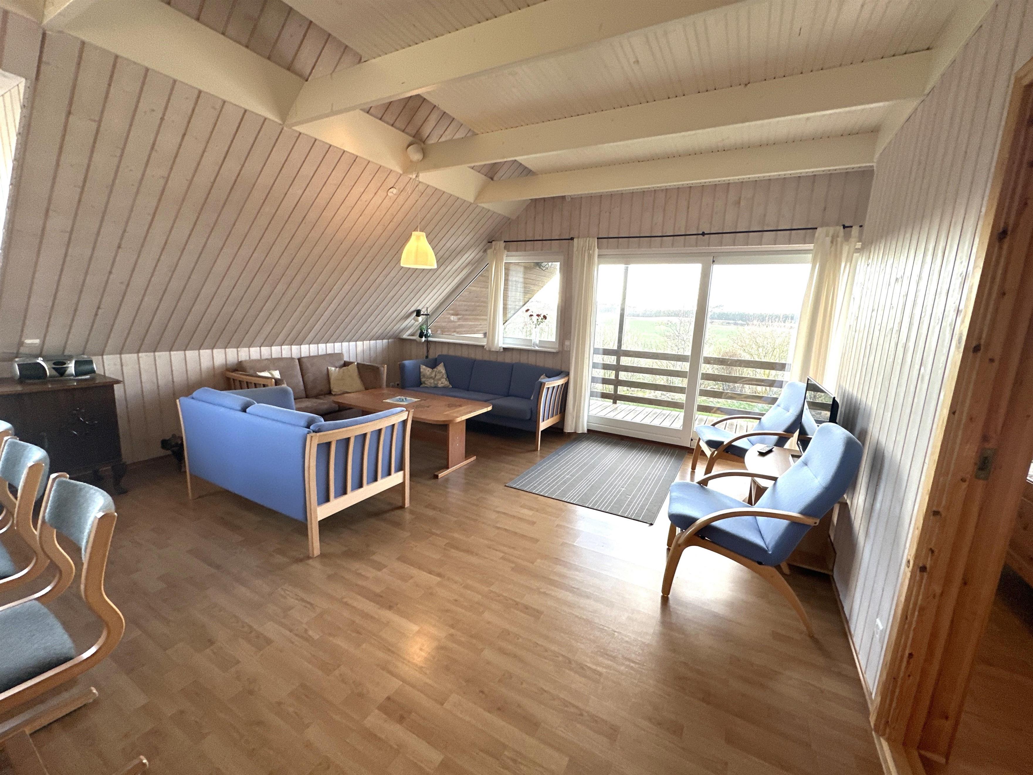 Lejligheden er lys og rummelig med store vinduer, der giver en smuk udsigt over de åbne marker og det omkringliggende landskab. Køkken-alrummet er indrettet med spiseplads og sofahjørne, hvor du kan nyde morgenkaffen, samles til hyggelige måltider eller slappe af med en god bog efter en dag med oplevelser.