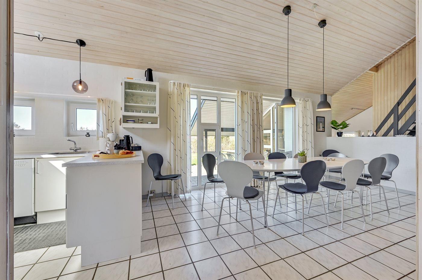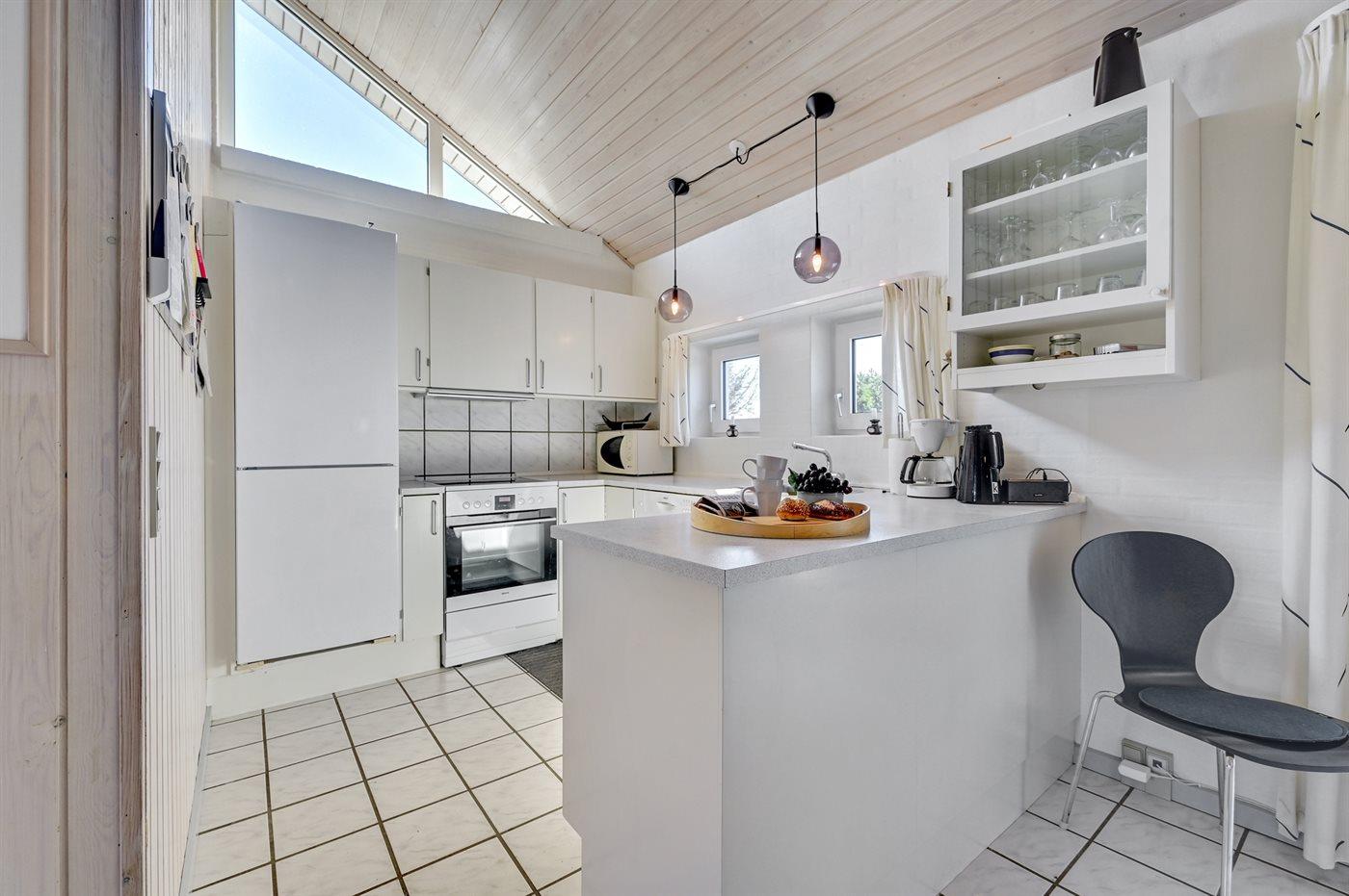 Køkkenet er udstyret med 1 køleskab, varmluftovn, mikrobølgeovn samt opvaskemaskine.