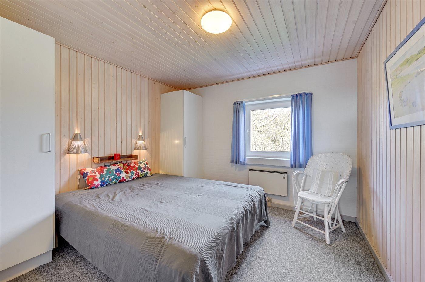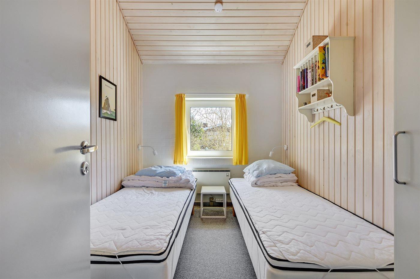 Der er i alt 4 soveværelser. Sovepladserne fordeler sig på: 6 sovepladser i dobbeltsenge. 2 sovepladser i enkeltsenge. 2 sovepladser på madrasser. 2 af disse sovepladser befinder sig på husets hems. Derudover er der 1 stk. barneseng.