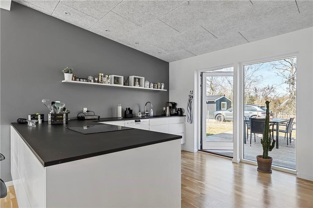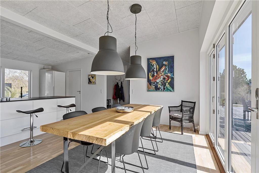 Spisebordet er midtpunkt i huset og placeret ved det lange vinduesparti med terrassedøre, der kan åbnes i hele sin længde ud mod terrassen. Her kan du samle familien til brunch efter en god nats søvn, inden I skal på oplevelse i området. Det åbne køkken ligger lige over for, og her er også barstole, så I kan være flere om at spise eller bare sidde og hygge og få en smoothie. Om aftenen, når I kommer hjem fra dagens oplevelser, kan du slappe af i hjørnesofaen. Har du brug for massage, står husets spa klar.